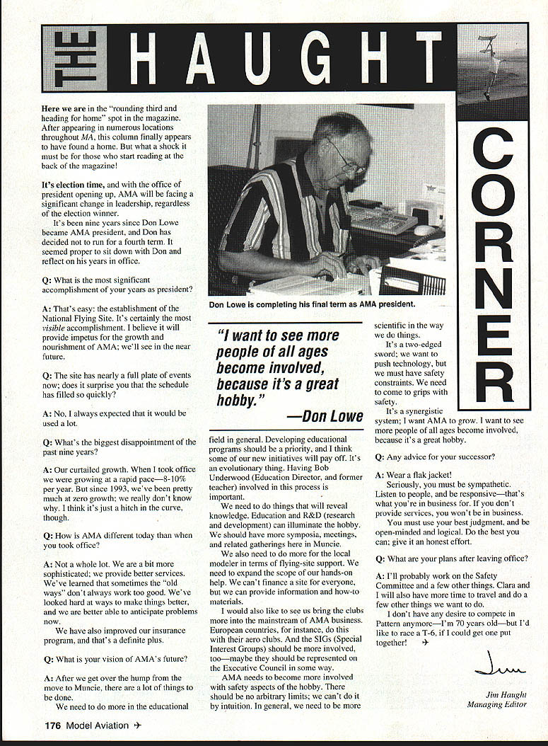 Its election time office president opening up AMA will facing significant change leadership regardless election winner Its nine years since Don Lowe became AMA president Don has decided run fourth term seemed proper sit down Don reflect years office Q What significant accomplishment years president A Thats easy establishment National Flying Site Its certainly visible accomplishment believe will provide impetus growth nourishment AMA well see near future Q The site has nearly full plate events now does surprise schedule has filled quickly A No always expected would used lot Q Whats biggest disappointment past nine years A Our curtailed growth took office growing rapid pace8-1O% per year since 1993 weve pretty much zero growth really dont know think its just hitch curve though Q How AMA different today took office A Not whole lot bit sophisticated provide better services Weve learned sometimes old ways dont always work too good Weve looked hard ways make things better better able anticipate problems now have also improved insurance program thats definite plus Q What vision AMAs future A After get over hump move Muncie lot things done need educational people ages become involved because its great hobby Don Lowe field general Developing educational programs should priority think some new initiatives will pay off Its evolutionary thing Having Bob Underwood Education Director former teacher involved process important need things will reveal knowledge Education R&D research development can illuminate hobby should have symposia meetings related gatherings Muncie also need local modeler terms flying-site support need expand scope hands-on help cant finance site everyone can provide information how-to materials would also like see us bring clubs mainstream AMA business European countries instance aero clubs SIGs Special Interest Groups should involved toomaybe should represented Executive Council some way AMA needs become involved safety aspects hobby should no arbitrary limits cant intuition general need C 0 R N scientific way things swordwewanttoE Its two-edged push technology must have safety constraints need safetyR come grips Its synergistic system want AMA grow want see people ages become involved because its great hobby Q Any advice successor A Wear flak jacket Seriously must sympathetic Listen people responsivethats what youre business dont provide services wont business must use best judgment open-minded logical best can give honest effort Q What plans after leaving office A Ill probably work Safety Committee few other things Clara will also have time travel few other things want dont have desire compete Pattern anymoreIm 70 years oldbut Id like race T-6 could get put together 4JAAJA Jim Haught Managing Editor 176 Model Aviation 4Here rounding third heading home spot magazine After appearing numerous locations throughout MA column finally appears have found home what shock must start reading back magazine Don Lowe completing final term AMA president want see more