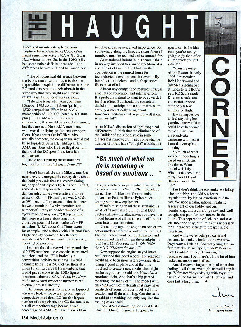 The philosophical difference between two immense fact close impossible explain difference some RC modelers use aircraft same way might use tennis racket golf club race car take issue comment [October 1995 column] about perhaps 1500 competition FFers AMA membership 100000 [actually 160000plus] AMA RC fliers competitors would valid statement Most AMA members whatever flying preference sport fliers count RC fliers actually compete comparison would lopsided Similarly add up AMA members fly free flight fun total RC sport fliers fair comparison about putting statistics together future Haught Corner have stats Mike wants nearly demographic survey done about hobby reveals overwhelming majority participants fly RC sport fact some 93% respondents last demographic survey active some phase RC FF figure 207% 594 persons Important distinction between number AMA members number survey respondentssort mileage may vary Keep mind tremendous amount crossover potential herequite few FF modelers fly RC-assist Old-Timer events example check National Free flight Society president Bob Beecroft reveals NFFS membership currently about 1800 persons submit overwhelming majority NFFS members competition-oriented modelers FF basically competition activity days would estimate least 90% fliers given EF contest NFFS members would put us close 1500 figure mentioned above drop proverbial bucket compared overall AMA membership comparison nearly lopsided look overall percentage competition modelers RC has largest number competitors CL smallest competitors together small percentage AMA Perhaps blow self-esteem perceived importance somewhere along line sheer force numbers must realized accounted As mentioned before space no way intended slam competition vital part hobby believe competition ramrod pun technological development eventually benefits modelersand perhaps sport fliers Almost competition requires unusual amounts dedication intense effort Its probably natural want rewarded effort should conscious decision participate non-mainstream activity automatically bring about fame/wealthlstatus real perceived successful As Mikes discussion philosophical differences think elimination Builder Model rule some classes has narrowed gap somewhat number FFers have bought models So much what modeling based emotions . have whole part aided efforts gain place World Championships team Thus its like golfer tennis playeror Pattern flier Pylon racergetting some new equipment Whats missing scenarios what Jeff Troy calls Emotional Debt Factor EDFthe attachment have model because time effort went its construction long ago engine better models suffered broken rod flight rod took chunk out piston cracked shaft near crankpina total loss first reaction Oh %$# theres $100 down drain Now suppose engine stayed intact crashed good model reaction would have intenseanguish losing good airplane time involved create new model might good old Now thats emotional debt thats big part modeling us model $20 worth materials may have hundreds hours labor involved its creation flight trimming Can same said something requires writing check Look Scale modeling real EDF situation its greatest appeals spectators idea youre really going fly after work put C still Reston early 19931 remember Bob Underwood Jay Mealy going out 0 lunch test Bobs new RC Scale model Disaster struck model crashed after few impossible R seconds flight feel anything genuine sorrow could have happened give-and-take N usual bantering absent workplace day we do modeling E So much what based emotions like What model will fly fly Will fly R best time allis worth risk dont think can make modeling better hobby AMA better organization letting emotions rule day need calm rational realistic assessment hobby membership carefully reasoned wellthought-out plan success future separation church state will never easy think its necessary favorite activity prosper long term being calm rational lets take look out window Daydream little bit See young kid fascinated flying model Does look familiar thought might recognize him bet theres little bit him locked up inside us ever forget him what feeling about might well hang up boys playing toys childlike fascination flight can does last long time Haught Managing Editor 184 Model Aviation ived interesting letter longtime FF modeler Mike Cook might remember Mikes /2A A-Go-Go Nats winner /2A Gas 1960s has some rather definite ideas about differences between FF RC modelers