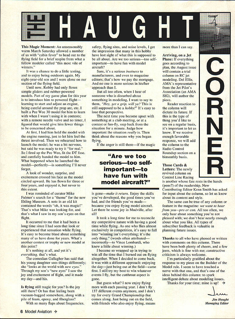 This Magic Moment An unseasonably warm March Saturday allowed number us cabin fever head out flying field brief respite what fellow modeler called vile winters chance little testing enjoy being outdoors again eight-year-old son alone section flying field Until now Robby flown simple gliders rubber-powered models Part game plan year introduce him powered flight learning start adjust engine being careful around prop arc etc built Pee Wee 30 model him learn wasnt using contests remote needle valve no timer figured would give him fewer things concerned about first him hold model engine running just let him feel thrust involved rehearsed launch model bit nervous said ready try real So fired up Pee Wee lit DT fuse carefully handed model him What happened launched modelperfectly-is something Ill never forget look wonder surprise excitement crossed face model circled upward has flown three four years enjoyed never extent reminded curator Mike Fulmer s search theme new Ehling Museum note old kit contained words oh magic Thats what Mike looking thats what saw sons eyes flight occurred long time since seen look experienced sensation flying Its easy become blase about something us have done years Whats another contest trophy new model point Its nothing yet its everything thats what comedian Gallagher has said young daughter sees things differently looks world new eyes Through sons new eyes saw joy excitement flight made dayand flying still magic joy still has feeling vacuum-bagged somewhere along pile foam epoxy fiberglass flaps about frequencies safety flying sites noise levels get impression hobby have lost sight what supposed about Are too serioustoo selfimportantto have fun model aircraft Sure its serious business manufacturers magazine editors thats pay mortgage no serious his/her approach too often hear someone disturbed about something modeling want say Hey get grip will ya still supposed hobby Its easy lose perspective next time become upset something club meeting contest fun-fly step back situation minute Judge important situation really think about reasons began flying anger still thereif magic Are too serioustoo self importantto have fun model aircraft gonemake return Enjoy skills ye developed good times youve friends youve made because enjoy flying model aircraft Let some joy Mudville after took long time reconcile competitive nature having good time flying As flies almost exclusively competition its easy fall winning isnt everything its thing words often attributed incorrectlyto Vince Lombardi knew little about winning became wrapped up trying win time burned out flying altogether decided come back different approach enjoying dayjust being out fieldcame first still try best win whatever events fly cutthroat aspect gone guess what now enjoy flying passing year dont fly 137 different events anymore dont try Grand Championship comes along Just being out field friends also enjoy flying means Arriving Jet Plane everything goes according plan August issue will contain trial column RC jet modeling Del Ellis AMA s representative Jet Pilots Association AMA 510 will author piece Reader reaction column will dictate its future type thing youd like see regular basis its important let us know receive enough favorable response will add column Radio Control Roundup section bimonthly basis C 0 R N E R Cards & Letters newly revived column Control Line Racing another fate rests hands pens readership New Contributing Editor Kenn Smith has asked input about column let us know about its content style same can true column feature magazine want hear youpro con too often hear about something youre pleased dont hear nearly enough about what like types subscriber feedback valuable planning future issues Thanks have phoned written comments column have both plenty cheers few jeers fine constructive criticism always welcome Im particularly gratified about response piece Builder Model rule seem have touched nerve thats ideas behind column spark intelligent debate about modeling issues Thanks time up Haught Managing Editor 6 Model Aviation