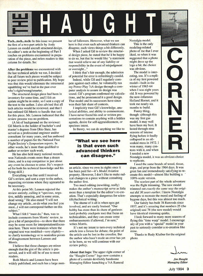 Tech.tech.tech issue present first two-part article Andy Lennon model aircraft structural design An editors note beginning Part touches problems encountered prepa ration piece refers readers column details So After problems encountered last technical article ran decided future tech pieces would subject peer review prior publication hope would eliminate intramural squabbling weve past over whos right/wrong/smarter structural design piece inventory some time felt update might order sent copy text author also advised tech articles would reviewed enlisted Gil Morris handle task piece Mr Lennon indicated review process no problem bit background reviewer Gil Morris holder bachelors master s degrees Ohio State has served professional engineer and/or consultant years has authored number papers National Free Flight Societys Symposium reports other words hes qualified author review such work has also held national records won Nationals events dozen times top competitor just about event chooses enter Hes respect ed both technical knowledge flying skill Everything fine until received Gils review sent copy author requesting revisions appeared necessary point Mr Lennon rejected review entirely calling specious nega tive mildly amusing some areas dead wrong also stated will change article. what feel must. 1 will correspond further subject What felt must include comments Morris review give bit perspectiveto show may some room interpretation/discus sion instances original text modifiedvery slightly clarify terminology neutralize points disagreement between Lennon Morris believe changes minor enough gist article pre served will still use readers Both Morris Lennon have widely published has large num ber followers However what see such advanced thinkers can disagree views things bit differently asked Gil review structur al design piece stated hed happy would like statement would relieve liability responsibility event misjudgment oversight. think thats fair enough admission potential error refreshingly candid Indeed Gil regularly com pete against other voluntarily ran Power Play /2A design through com puter analysis assure its design sound Gils program confirmed calcula tions pronounced good design model its successors have since won fair share contests implicitly trust Gils knowledge ana lytical abilities ability communicate have never found oral written pre sentations contain anything hidden agenda desire self-aggrandizement specious intent theory can anything like What see such advanced thinkers can disagree~ article since own its rights once has paid forits Model Aviation property However dont like make rad ical changes piece consulting author first Too much editing rewriting really makes authors manuscript serve little template editors re-cre ation Thats especially dangerous scien tific/technical writing shame egos get involved easily bruised hobby has its share geniuses probably crackpots too focus technicalities can create some embarrassments allowed Im sure writes Morris Its intent turn technical article forum debate point article can lost crossfire author hasnt made error has yet born will continue review policy About logo upper right corner Haught Corner logo now contains photo certain devilishly handsome Managing Editor launching 1/2A Ramrod C 0 R N E R Nostalgia model modeling-related photo ever liked suggested photo might dress up logo bit choice obvious model inter esting too Its repli ca first powered modelbuilt winter 1963-64 eight years old powered now-infamous Holland Hornet took nearly six months build Funny thing though although first gas model may well have best lasted through nine seasons intense flying before finally collapsed oilsoaked mess 1972 won many con tests needed new Nostalgia model obvious choice replicate used same brands wood tissue dope prop 1964 days great fun tremendously satisfying re create modelalmost like building 100%-scale version scariest part whole adventure flight trimming new model trimmed out exactly same way origi nal did 30 years earlier know Nostalgia attempts recreate mood feeling bygone days almost too much family has built 78 Ramrods since 1957 its amazing numbers 25 original 78 new model would have identical trimming quirks look forward seasons flying time warp model encourage special model past seriously consider re-creation like Thanks Rudy Kluiber original photo JAAAA Jim Haught Managing Editor July1994 3