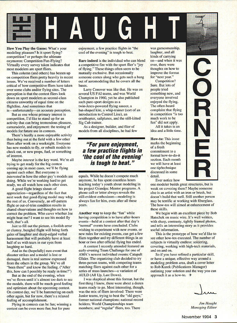 How Play Game Whats modeling pleasure sport flying competition perhaps ultimate oxymoron Competition Fun-Flying Virtually survey taken indicates modelers sport fliers column others has beaten up competition fliers pretty heavily recent issues Weve received number letters critical competitive fliers have taken over some clubs and/or flying sites perception contest fliers look down sport modelers second-class citizens unworthy equal time flightline sometimes isunfortunatelyan accurate perception primary interest competition Id like stand up activity can bring tremendous pleasure camaraderie enjoyment testing models future use contests Theres hardly enjoyable activity being out field few other fliers after work weeknight Everyone has new models fly rebuilt models check out new props fuel something interest Maybe interest key word trying get ready big contest coming up cases well flying against other everyone interested other guys models doing working hard get ready watch other does good flight brings shouts appreciationregardless fact next week good-flying model may whip rest us Conversely off-pattern flight out-of-trim condition results shared observations thoughts correct problem cares whether Joe might beat want see model fly well thats Just fill out picture foolish error clumsy bungled flight will bring forth gales laughter sharp-edged verbal harassment will probably have least half us tears eyes laughing hard hopefully rare event disaster strikes model lost damaged real sorrow expressed others group Weve know feeling After can possibly ready time end evening weve flown until its almost too dark see models will much good feeling optimism about upcoming contest contest day well hammering other again now theres relaxed feeling accomplishment Flying contests can fun winning contest can fun pure Rare indeed individual can blend competitive fire sport fliers joy flying things often seem mutually exclusive occasionally someone comes along gets such bang out aeromodeling covers bases Larry Conover like several US FAL teams World Champion 1960 yet also published such pure-sport designs twin-Jetex-powered flying saucer bat-shaped kite whip-trainer sort introduction Control Line ornithopter sailpianes still-kitted Sig Cub trainer As designer builder flier models disciplines few pure enjoyment few practice flights cool evening tough beat equals doesnt compete much anymore has spent countless hours teaching todays youth about modeling project Grandpa Mentor programs phone call letter always reveals still-evident enthusiasmmodeling always fun him after years Another way keep fun having competition have after-hours eventsheld contest after days normal events have concluded Clubs wishing experiment new events new rules existing events can get few fliers together try different things hour two after official flying has ended contest recently attended featured early-evening Team Challenge AMAs newest individual events Catapult Glider organizing club decided try three-person teams competing teams matching fliers against other series mass launchesa variation AULD Up Last Down skeptical about format first thing knew about dozen teams ready go Most interesting though mix fliers involved Junior teams trying beat old guys former national champions national record holders World Championships team members regular fliers too over thoughts improve format next year Competition Sure lots people tried something new everyone involved enjoyed flying often-heard complaint flying competition too much work fun did apply takes idea little time C 0 R N E R How-to issue marks beginning fresh commitment formal how-to-do-it section month will have least tip/technique discussed some detail Ever notice modeler builds great structures weak covering Maybe someone else artist iron brush doesnt build well Still another person may terrific working fiberglass how-tos will aimed enhancement skills begin excellent piece Bob Hatschek music wire Its well written sharp contrasty tightly framed photos tells interesting story provides useful information prototype wed like see other how-tos executed number subjects virtually endless soldering covering working high-tech materials on So have refined particular skill have unique effective way around modeling problem area draft cover letter Rob Kurek Publications Manager outlining solution way can approach how-to 4Jim Haught Managing Editor November 1994 3 enjoyment few practice flights cool evening tough beat gamesmanship laughter kinds carrying onand was