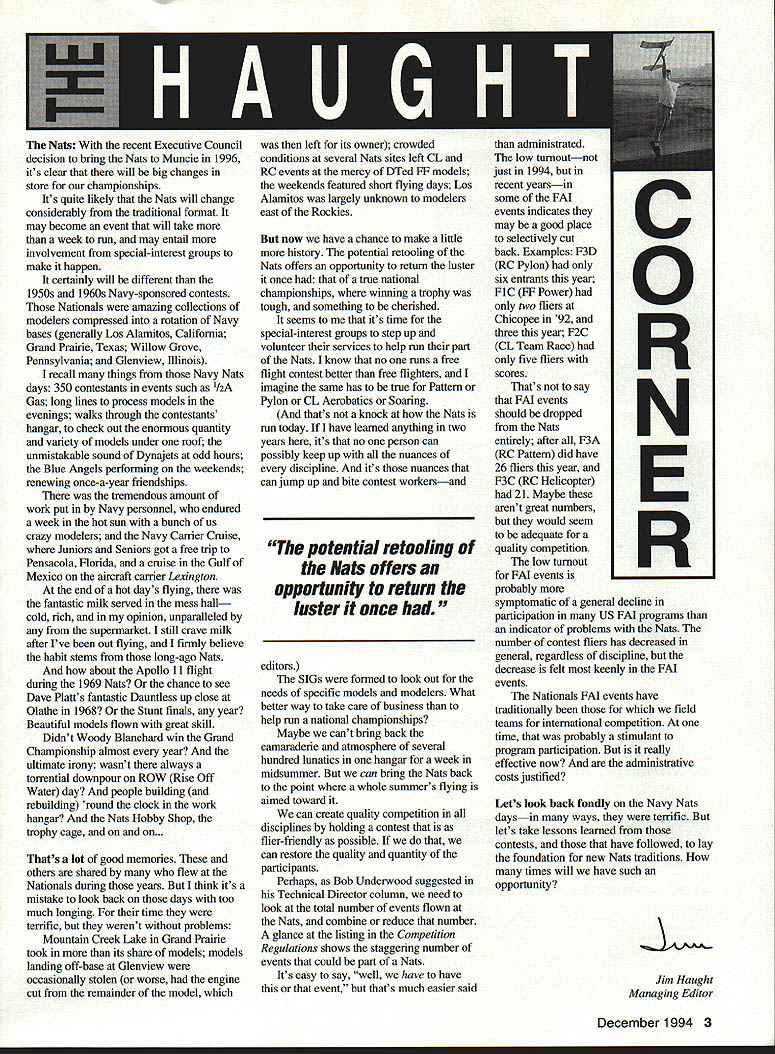 The Nats recent Executive Council decision bring Nats Muncie 1996 its clear will big changes store championships Its quite likely Nats will change considerably traditional format may become event will take week run may entail involvement special-interest groups make happen certainly will different 1950s 1960s Navy-sponsored contests Nationals amazing collections modelers compressed rotation Navy bases generally Los Alaniitos California Grand Prairie Texas Willow Grove Pennsylvania Glenview Illinois recall things Navy Nats days 350 contestants events such hA Gas long lines process models evenings walks through contestants hangar check out enormous quantity variety models under roof unmistakable sound Dynajets odd hours Blue Angels peiforming weekends renewing once-a-year friendships tremendous amount work put Navy personnel endured week hot sun bunch us crazy modelers Navy Carrier Cruise Juniors Seniors got free trip Pensacola Florida cruise Gulf Mexico aircraft canier Lexington end hot days flying fantastic milk served mess hall cold rich opinion unparalleled supermarket still crave milk after Ive out flying firmly believe habit stems long-ago Nats about Apollo 11 flight during 1969 Nats chance see Dave Platts fantastic Dauntless up close Olathe 1968 Stunt finals year Beautiful models flown great skill Didat Woody Blanchard win Grand Championship almost year ultimate irony wasnt always torrential downpour ROW Rise Off Water day people building rebuilding round clock work hangar Nats Hobby Shop trophy cage on. Thats lot good memories others shared flew Nationals during years think its mistake look back days too much longing time terrific werent problems Mountain Creek Lake Grand Prairie took its share models models landing off-base Glenview occasionally stolen worse engine cut remainder model now have chance make little history potential retooling Nats offers opportunity return luster once true national championships winning trophy tough something cherished seems its time special-interest groups step up volunteer services help run part Nats know no runs free flight contest better free fighters imagine same has true Pattern Pylon CL Aerobatics Soaring thats knock Nats run today have learned anything two years its no person can possibly keep up nuances discipline its nuances can jump up bite contest workersand The potential retooling Nats offers opportunity return luster once editors SIGs formed look out needs specific models modelers What better way take care business help run national championships Maybe cant bring back camaraderie atmosphere several hundred lunatics hangar week midsummer can bring Nats back point whole summers flying aimed toward can create quality competition disciplines holding contest flier-friendly possible we can restore quality quantity participants Perhaps Bob Underwood suggested Technical Director column need look total number events flown Nats combine reduce number glance listing Competition Regulations shows staggering number events could part Nats Its easy say well have have event thats much easier said C 0 R N E R administrated low turnoutnot just 1994 recent yearsin some FAt events indicates may good place selectively cut back Examples F3D RC Pylon oniy six entrants year FlC FF Power two fliers Chicopee 92 three year F2C CL Team Race five fliers scores Thats say FM events should dropped Nats entirely after F3A RC Pattern did have 26 fliers year F3C RC Helicopter 21 Maybe aren t great numbers would seem adequate quality competition low turnout FM events probably symptomatic general decline participation US FM programs indicator problems Nats number contest fliers has decreased general regardless discipline decrease felt keenly FM events Nationals FM events have traditionally field teams interuational competition time probably stimulant program participation really effective now administrative costs justified Lets look back fondly Navy Nats daysin ways terrific lets take lessons learned contests have followed lay foundation new Nats traditions times will have such opportunity iAAAA Jim Haught Managing Editor December 1994 3 left its owner crowded conditions several Nats sites left CL RC events mercy DTed FF models weekends featured short flying days Los Alarnitos largely unknown modelers east Rockies