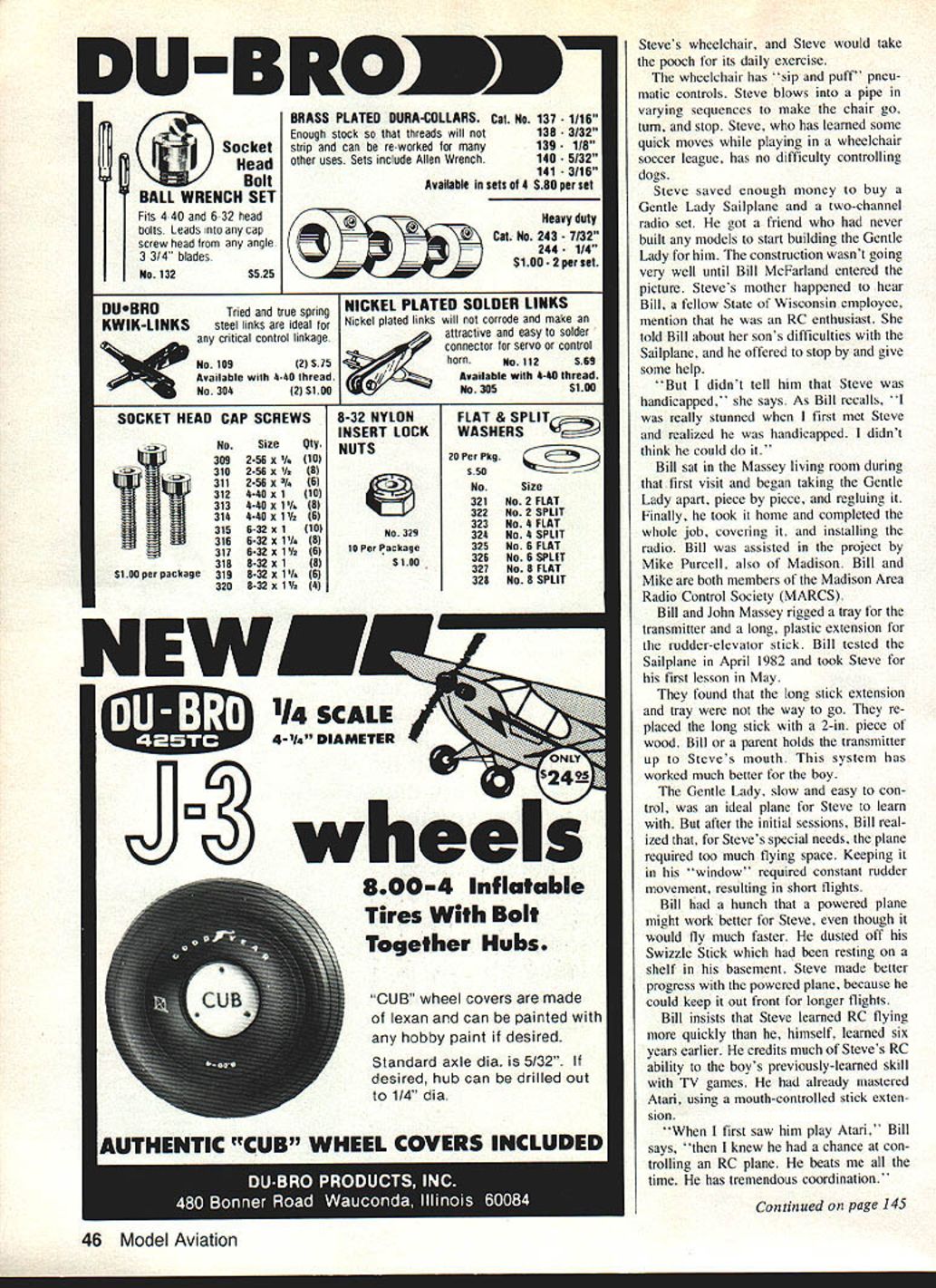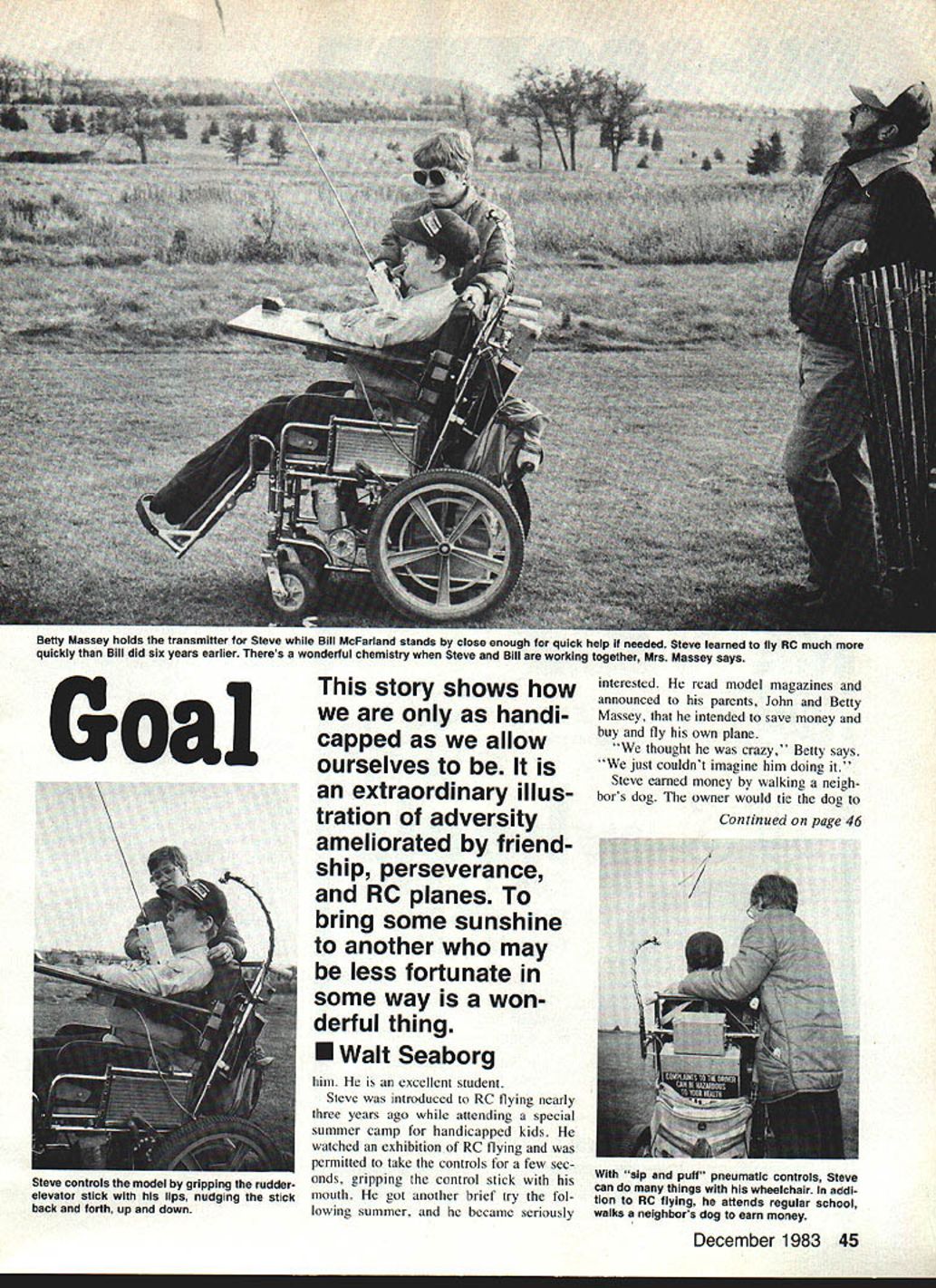 Steve Massey seated wheelchair poses authors camera some very important people him backdrop John Betty Massey father mother left center Bill McFarland right came rescue Steves first modeling project started Will Achieve Hia STEVE MASSEY Madison WI physi cally handicaped 16-year-old has learned fly Radio Control model airplanes using mouth guide transmitter control stick Steve has almost totally paralyzed since birth Able move eyes mouth pilots 46-powered Swizzle Stick trainer Steves friend flying instructor Bill McFarland 48 launches plane sets throttle hands transmitter Steves motherwho holds control box son Steve grips rudder-elevator stick lips controlling plane nudg ing stick back forth up down Because Steve cant turn head plane must stay within ow front himin part sky covered eye movement After seven flying sessions Bill last year Steve can easily maintain control plane through whole tank fuel does circles figure eights loopsmost manuever three-channel model capable performing writ ten ready try first landings takeoffs Steve has spinal muscular atrophy though confined wheelchair attends regular high school classes assisted aide turns pages writes 44 Model Aviation Bill McFarland gets Swizzle Stick ready Steve put flight powered RC plane well suited Steves needs could keep within view area have flights satisfying length Betty Massey holds transmitter Steve Bill McFarland stands close enough quick help needed Steve learned fly RC much quickly Bill did six years earlier Theres wonderful chemistry Steve Bill working together Mrs Massey says Goal story shows handi capped allow ourselves extraordinary illus tration adversity ameliorated friend ship perseverance RC planes bring some sunshine another may less fortunate some way won derful thing U Walt Seaborg him excellent student Steve introduced RC flying nearly three years ago attending special summer camp handicapped kids watched exhibition RC flying permitted take controls few sec onds gripping control stick mouth got another brief try fol lowing summer became seriously interested read model magazines announced parents John Betty Massey intended save money buy fly own plane thought crazy Betty says just couldnt imagine him doing Steve earned money walking neigh bors dog owner would tie dog December 1983 45 Continued page 46 Steve controls model gripping rudderelevator stick lips nudging stick back forth up down sip puff pneumatic controls Steve can things wheelchair addi tion RC flying attends regular school walks neighbors dog earn money NEW I1j4 SCALE 4-I4 DIAMETER wheels 46 Model Aviation Steves wheelchair Steve would take pooch its daily exercise wheelchair has sip puff pneu matic controls Steve blows pipe varying sequences make chair go turn stop Steve has learned some quick moves playing wheelchair soccer league has no difficulty controlling dogs Steve saved enough money buy Gentle Lady Sailplane two-channel radio set got friend never built models start building Gentle Lady him construction wasnt going very well until Bill McFarland entered picture Steves mother happened hear Bill fellow State Wisconsin employee mention RC enthusiast told Bill about sons difficulties Sailplane offered stop give some help didnt tell him Steve handicapped says As Bill recalls really stunned first met Steve realized handicapped didnt think could Bill sat Massey living room during first visit began taking Gentle Lady apart piece piece regluing Finally took home completed whole job covering installing radio Bill assisted project Mike Purcell also Madison Bill Mike both members Madison Area Radio Control Society MARCS Bill John Massey rigged tray transmitter long plastic extension rudder-elevator stick Bill tested Sailplane April 1982 took Steve first lesson May found long stick extension tray way go re placed long stick 2-in piece wood Bill parent holds transmitter up Steves mouth system has worked much better boy Gentle Lady slow easy con trol ideal plane Steve learn after initial sessions Bill real ized Steves special needs plane required too much flying space Keeping window required constant rudder movement resulting short flights Bill hunch powered plane might work better Steve though would fly much faster dusted off Swizzle Stick resting shelf basement Steve made better progress powered plane because could keep out front longer flights Bill insists Steve learned RC flying quickly himself learned six years earlier credits much Steves RC ability boys previously-learned skill TV games already mastered Atari using mouth-controlled stick exten sion first saw him play Atari Bill says knew chance con trolling RC plane beats time has tremendous coordination Continued page 145 DU-BRO SOCKET HEAD CAP SCREWS BRASS PLATED DURA-COLLARS Cat No 137 Enough stock threads will not 138 strip can re-worked tor many 139 other uses Sets include Allen Wrench 140 5132 1413/16 Available sets old SB0 per set NICKEL PLATED SOLDER LINKS Nickel plated links will corrode make attractive easy solder connector tor servo control horn4g 112S59 Available 40 thread No305Si igines Engineered Meet uemanas OT tne Most Discriminating Modeler Backed Service Match Send $100 Catalog New Standard * g2223 Giant Models 8HP5%Lbs* 95 95 9 Direct Sales Only*179 Dealer Direct ALL ENGINES READY TO RUN INCLUDING 6 BOLT PROP HUB MOU NT MU FFLERS AVAILABLE AT EXTRA CHARGE * KIORITZ 24 Work Horse 32 HP bs Canton OH 44707 ROUSH MFG THEENGINEPEOPLE 5 Cleveland Ave SW U hone 216 484-6810 484-4374 responding results RF Interface wont read FM pulses right now Ace working George M Myers 70 Froehlich Farm Rd Hicksville NY 11801 Massey/Seaborg Continued oaoe 46 Bill also attributes Steves fast learning boys extensive reading about RC mod els before attempting first flight knew just what expect step Bill says Steves mother puts yet another way Theres no question Steve has terest determination mental ability coordinationbut Bill never would have happened Bill has great patience Theres wonderful chemistry tween