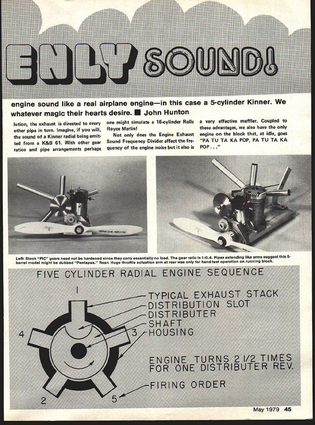 They call Engine Exhaust Sound Frequency Divider What does make must add commercially protected individuals free cook up DID ever wish screaming 60 latest super scale model sounded like engine fullscale prototype tremendous popu larity ignition chain-saw engine model use has produced some im provement realism exhaust note bigger scale models what about convention al sized models still abound local flying field Well about try ing Engine Exhaust Sound Frequency Divider gadget originally conceived means shift sound frequency RPV engines lower range human ear less responsive mid-range frequencies proto type shown photographs rather cumbersome bench version built prove principle would feasible model airplane engines operation slotted distributor con tained within muffler gear-driven crankshaft using PIC gears directs exhaust pulses different exhaust pipes five pipes gear ratio drives distribu tor 04 revolutions per crankshaft revo Engine Exhaust Sound Frequency Divider K&B 61-powered PT-22 will have sound full-scale Kinner-engine vehicle Noise level low engine run indoors Photos John Preston Roar view left shows housing containing slotted shaft distributor direct sound five pipes Right Hefty components Identify prototype breadboard version test theory Yes worked wonder what effects various length pipes would have LA MnrIl Aviation engine sound like real airplane enginein case 5-cylinder Kinner whatever magic hearts desire U John Hunton lution exhaust directed other pipe turn Imagine will sound Kinner radial being emit ted K&B 61 other gear ratios pipe arrangements perhaps might simulate 16-cylinder Rolls Royce Merlin does Engine Exhaust Sound Frequency Divider affect fre quency engine noise also very effective muffler Coupled advantages also have engine block idle goes PA TU TA KA POP PA TU TA KA POP. Left Stock PlC gears need hardened since carry essentially no load gear ratio 104 Pipes extending like arms suggest 5barrel model might dubbed Pentapus Rear Huge throttle actuation arm rear hand-test operation running block I0