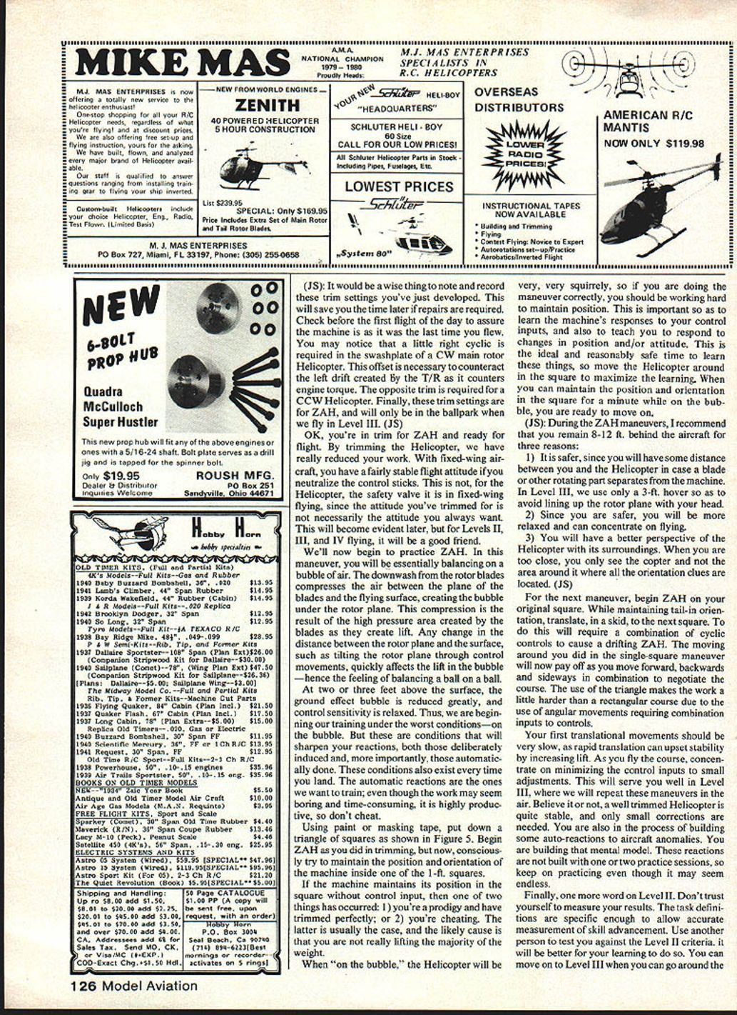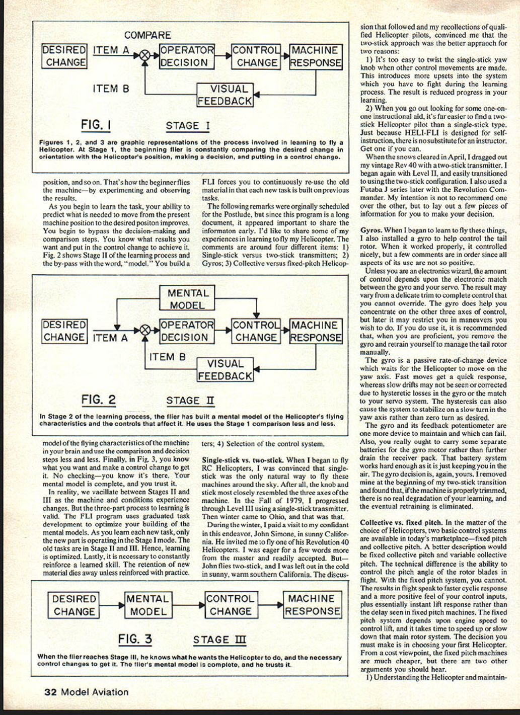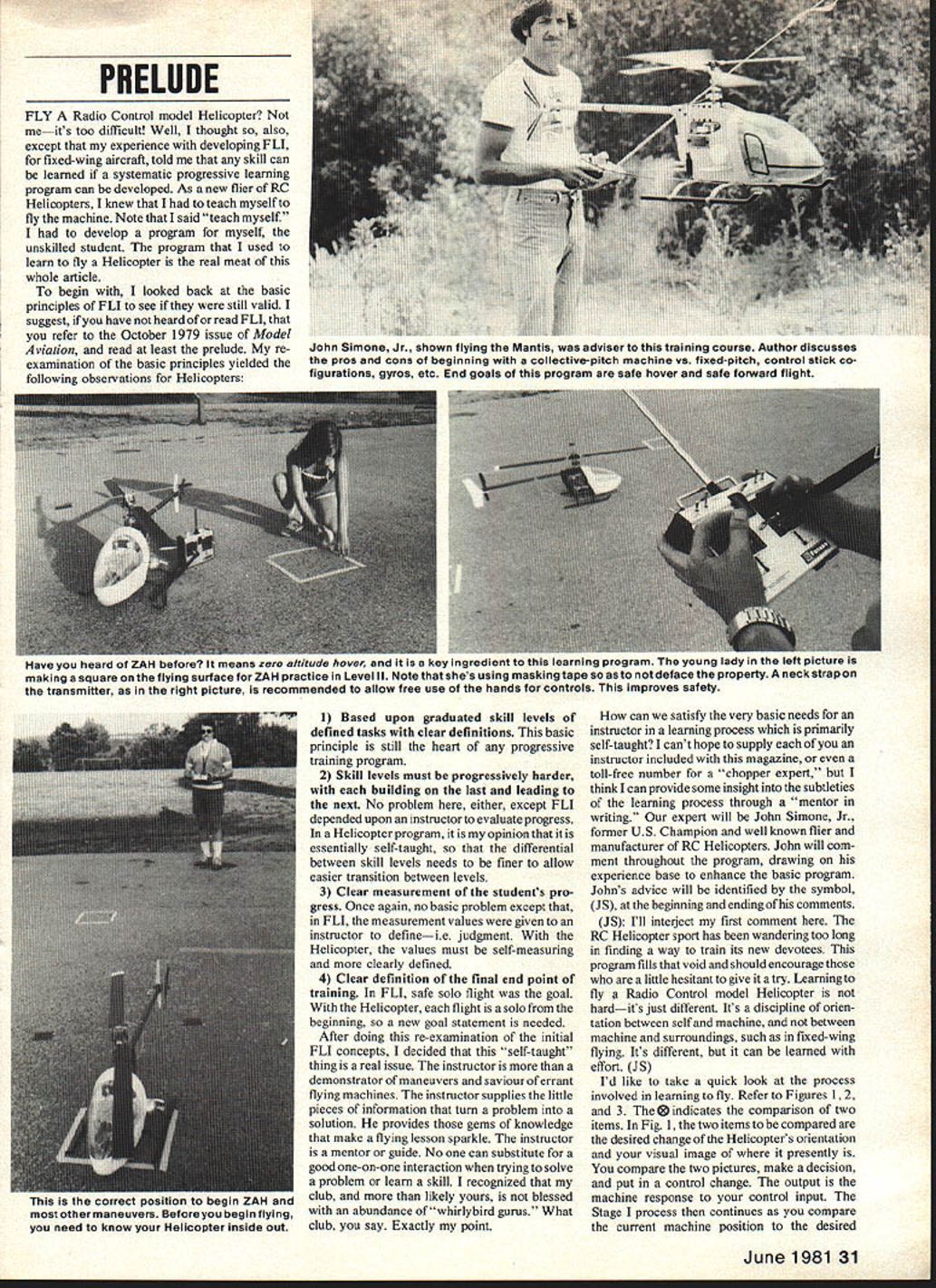 \ y V SEE TOLD YOU THESE EGG BEATERS ARENT DIFFICULT TO FLYJUST DIFFERENT comments advice John Simone Jr five level structured program learning fly RC Helicoptereach building other being progressively harder designed forteaching ones self instructor available Part 10 Tom Burdin _________________________ 30 Model Aviation N PRELUDE FLY Radio Control model Helicopter meits too difficult Well thought also except experience developing FLI fixed-wing aircraft told skill can learned systematic progressive learning program can developed As new flier RC Helicopters knew teach myself fly machine Note said teach myself develop program myself unskilled student program used learn fly Helicopter real meat whole article begin looked back basic principles FLI see still valid suggest have heard read FLI refer October 1979 issue Model Aviation read least prelude re examination basic principles yielded following observations Helicopters nave nearo oI LR ueIor ii key ingredient learning program young lady left picture making square flying surface ZAH practice Level II Note shes using masking tape asto deface property neck strap transmitter right picture recommended allow free use hands controls improves safety 1 Based upon graduated skill levels ol defined tasks clear definitions basic principle still heart progressive training program 2 Skill levels must progressively harder building last leading next No problem either except FLI depended upon instructor evaluate progress Helicopter program opinion essentially self-taught differential between skill levels needs finer allow easier transition between levels 3 Clear measurement students pro gress Once again no basic problem except FLI measurement values given instructor defineie judgment Helicopter values must self-measuring clearly defined 4 Clear definition final end point training FLI safe solo flight goal Helicopter flight solo beginning new goal statement needed After doing re-examination initial FLI concepts decided self-taught thing real issue instructor demonstrator maneuvers saviour errant flying machines instructor supplies little pieces information turn problem solution provides gems knowledge make flying lesson sparkle instructor mentor guide No can substitute good one-on-one interaction trying solve problem learn skill recognized club likely yours blessed abundance ofwhirlybird gurus What club say Exactly point can satisfy very basic needs instructor leaming process primarily self-taught cant hope supply instructor included magazine toll-free number chopper expert think can provide some insight subtleties learning process through mentor writing expert will John Simone Jr former US Champion well known flier manufacturer RC Helicopters John will com ment throughout program drawing experience base enhance basic program Johns advice will identified symbol JS beginning ending comments JS Ill interject first comment RC Helicopter sport has wandering too long finding way train its new devotees program fills void should encourage little hesitant give try Learning fly Radio Control model Helicopter hardits just different Its discipline orien tation between self machine between machine surroundings such fixed-wing flying Its different can learned effort JS Id like take quick look process involved learning fly Refer Figures 1 2 3 indicates comparison two items Fig 1 two items compared desired change Helicopters orientation visual image presently compare two pictures make decision put control change output machine response control input Stage process continues compare current machine position desired June 1981 31 John Simone Jr shown flying Mantis adviser training course Author aiscusses pros cons beginning collective-pitch machine vs fixed-pitch control stick co figurations gyros etc End goals program safe hover safe forward flight fliS IflS correct positioti Lu ucyin Jfl aiu other maneuvers Beforeyoubeginflying need know Helicopter inside Out position Thats beginner flies machineby experimenting observing results As begin learn task ability predict what needed move present machine position desired positon improves begin bypass decision-making comparison steps know what results want put control change achieve Fig 2 shows Stage II learning process by-pass word model build model flying characteristics machine brain use comparison decision steps less less Finally Fig 3 know what want make control change get No checkingyou know its mental model complete trust reality vacillate between Stages II III machine conditions experience changes three-part process learning valid FLI program uses graduated task development optimize building mental models As learn new task new part operating Stage mode old tasks Stage II III Hence learning optimized Lastly necessary constantly reinforce learned skill retention new material dies away unless reinforced practice FLI forces continuously re-use old material new task built previous tasks following remarks orginally scheduled Postlude since program long document appeared important share informaton early Id like share some experiences learning fly Helicopter comments around four different items 1 Single-stick versus two-stick transmitters 2 Gyros 3 Collective versus fixed-pitch Helicop ters 4 Selection control system Single-stick vs two-stick began fly RC Helicopters convinced singlestick natural way fly machines around sky After knob stick closely resembled three axes machine Fall 1979 progressed through Level III using single-stick transmitter winter came Ohio During winter paid visit confidant endeavor John Simone sunny Califor nia invited fly Revolution 40 Helicopters eager few words master readily accepted John flies two-stick left out cold sunny warm southern California discussion followed recollections quali fied Helicopter pilots convinced two-stick approach better appraoch two reasons 1 Its too easy twist single-stick yaw knob other control movements made introduces upsets system have fight during learning process result