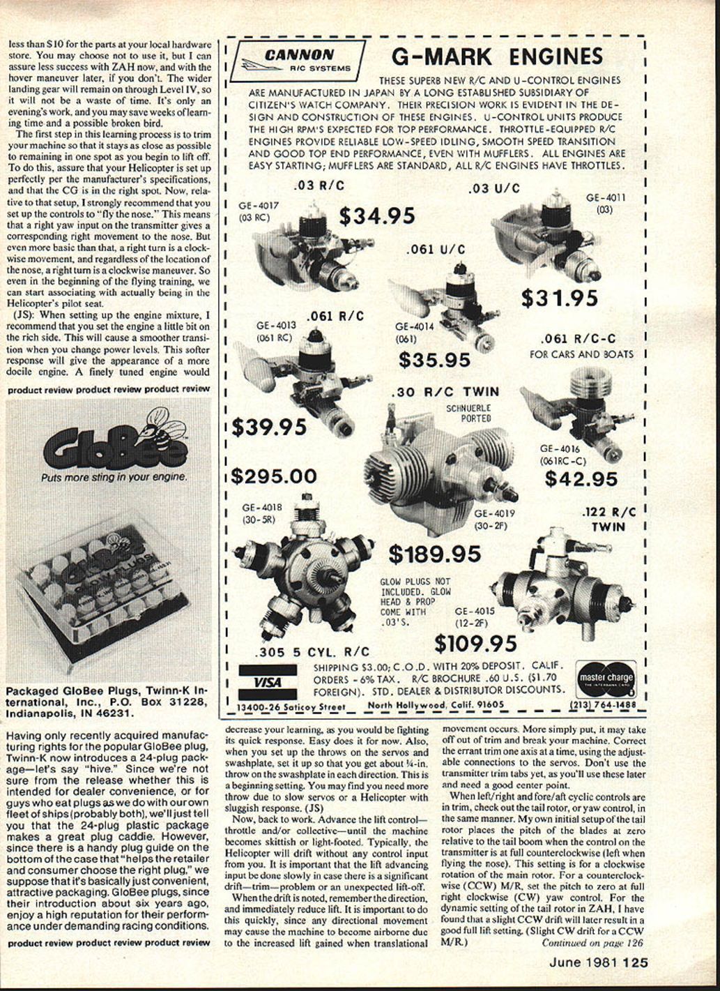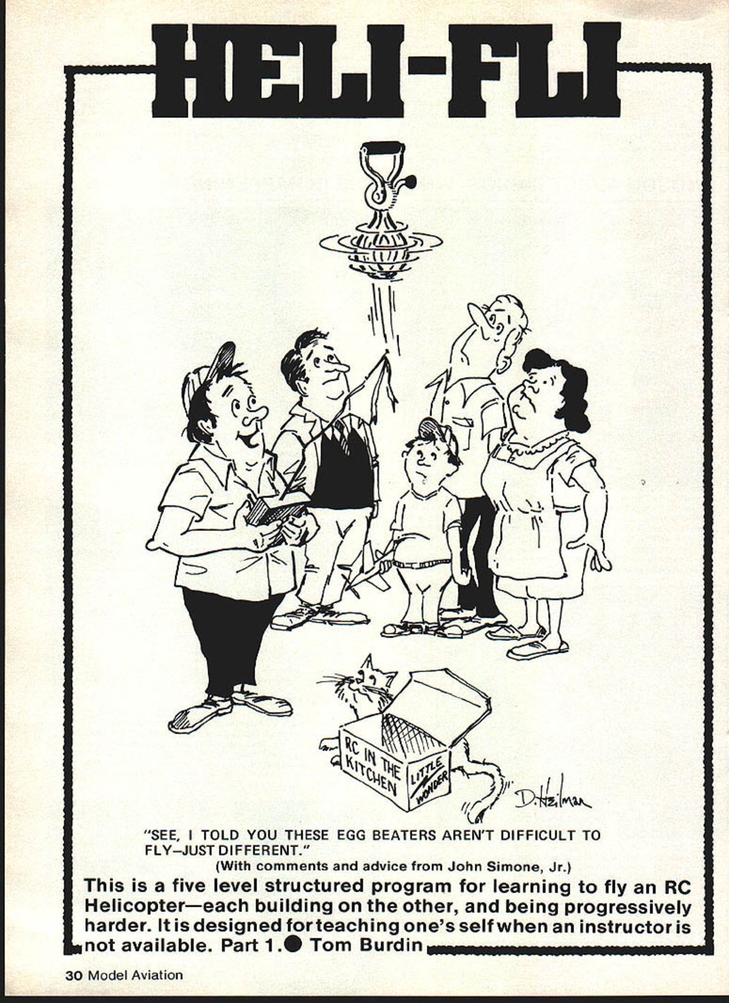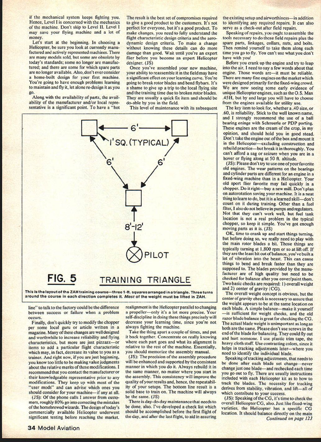 \ y V SEE TOLD YOU THESE EGG BEATERS ARENT DIFFICULT TO FLYJUST DIFFERENT comments advice John Simone Jr five level structured program learning fly RC Helicoptereach building other being progressively harder designed forteaching ones self instructor available Part 10 Tom Burdin _________________________ 30 Model Aviation N PRELUDE FLY Radio Control model Helicopter meits too difficult Well thought also except experience developing FLI fixed-wing aircraft told skill can learned systematic progressive learning program can developed As new flier RC Helicopters knew teach myself fly machine Note said teach myself develop program myself unskilled student program used learn fly Helicopter real meat whole article begin looked back basic principles FLI see still valid suggest have heard read FLI refer October 1979 issue Model Aviation read least prelude re examination basic principles yielded following observations Helicopters nave nearo oI LR ueIor ii key ingredient learning program young lady left picture making square flying surface ZAH practice Level II Note shes using masking tape asto deface property neck strap transmitter right picture recommended allow free use hands controls improves safety 1 Based upon graduated skill levels ol defined tasks clear definitions basic principle still heart progressive training program 2 Skill levels must progressively harder building last leading next No problem either except FLI depended upon instructor evaluate progress Helicopter program opinion essentially self-taught differential between skill levels needs finer allow easier transition between levels 3 Clear measurement students pro gress Once again no basic problem except FLI measurement values given instructor defineie judgment Helicopter values must self-measuring clearly defined 4 Clear definition final end point training FLI safe solo flight goal Helicopter flight solo beginning new goal statement needed After doing re-examination initial FLI concepts decided self-taught thing real issue instructor demonstrator maneuvers saviour errant flying machines instructor supplies little pieces information turn problem solution provides gems knowledge make flying lesson sparkle instructor mentor guide No can substitute good one-on-one interaction trying solve problem learn skill recognized club likely yours blessed abundance ofwhirlybird gurus What club say Exactly point can satisfy very basic needs instructor leaming process primarily self-taught cant hope supply instructor included magazine toll-free number chopper expert think can provide some insight subtleties learning process through mentor writing expert will John Simone Jr former US Champion well known flier manufacturer RC Helicopters John will com ment throughout program drawing experience base enhance basic program Johns advice will identified symbol JS beginning ending comments JS Ill interject first comment RC Helicopter sport has wandering too long finding way train its new devotees program fills void should encourage little hesitant give try Learning fly Radio Control model Helicopter hardits just different Its discipline orien tation between self machine between machine surroundings such fixed-wing flying Its different can learned effort JS Id like take quick look process involved learning fly Refer Figures 1 2 3 indicates comparison two items Fig 1 two items compared desired change Helicopters orientation visual image presently compare two pictures make decision put control change output machine response control input Stage process continues compare current machine position desired June 1981 31 John Simone Jr shown flying Mantis adviser training course Author aiscusses pros cons beginning collective-pitch machine vs fixed-pitch control stick co figurations gyros etc End goals program safe hover safe forward flight fliS IflS correct positioti Lu ucyin Jfl aiu other maneuvers Beforeyoubeginflying need know Helicopter inside Out position Thats beginner flies machineby experimenting observing results As begin learn task ability predict what needed move present machine position desired positon improves begin bypass decision-making comparison steps know what results want put control change achieve Fig 2 shows Stage II learning process by-pass word model build model flying characteristics machine brain use comparison decision steps less less Finally Fig 3 know what want make control change get No checkingyou know its mental model complete trust reality vacillate between Stages II III machine conditions experience changes three-part process learning valid FLI program uses graduated task development optimize building mental models As learn new task new part operating Stage mode old tasks Stage II III Hence learning optimized Lastly necessary constantly reinforce learned skill retention new material dies away unless reinforced practice FLI forces continuously re-use old material new task built previous tasks following remarks orginally scheduled Postlude since program long document appeared important share informaton early Id like share some experiences learning fly Helicopter comments around four different items 1 Single-stick versus two-stick transmitters 2 Gyros 3 Collective versus fixed-pitch Helicop ters 4 Selection control system Single-stick vs two-stick began fly RC Helicopters convinced singlestick natural way fly machines around sky After knob stick closely resembled three axes machine Fall 1979 progressed through Level III using single-stick transmitter winter came Ohio During winter paid visit confidant endeavor John Simone sunny Califor nia invited fly Revolution 40 Helicopters eager few words master readily accepted John flies two-stick left out cold sunny warm southern California discussion followed recollections quali fied Helicopter pilots convinced two-stick approach better appraoch two reasons 1 Its too easy twist single-stick yaw knob other control movements made introduces upsets system have fight during learning process result