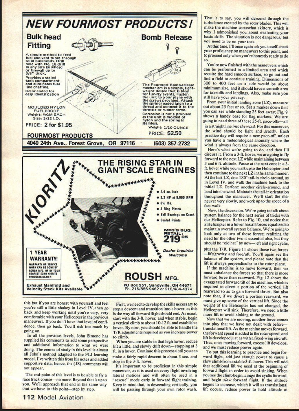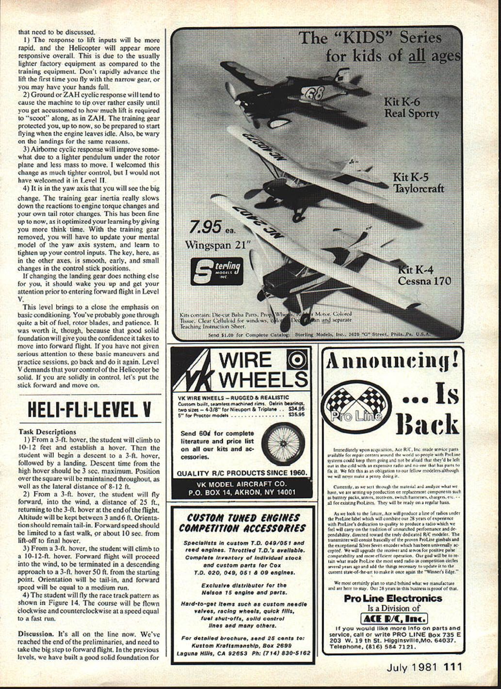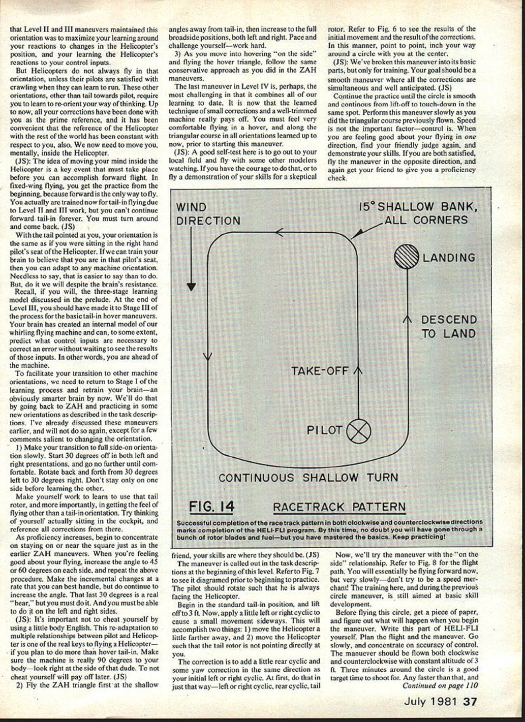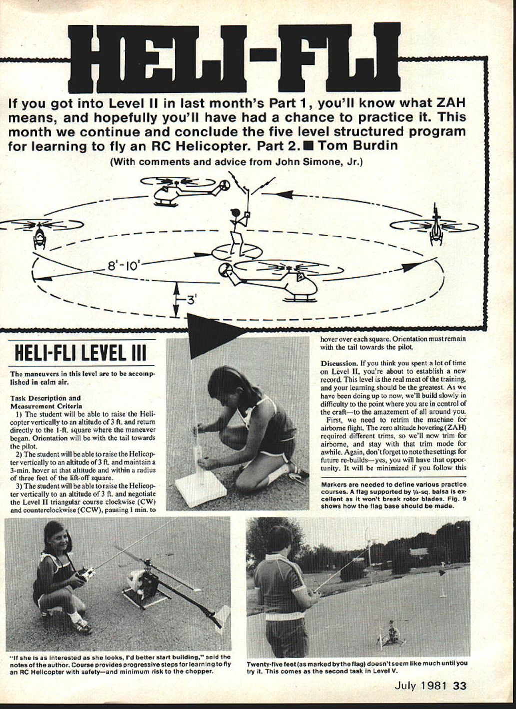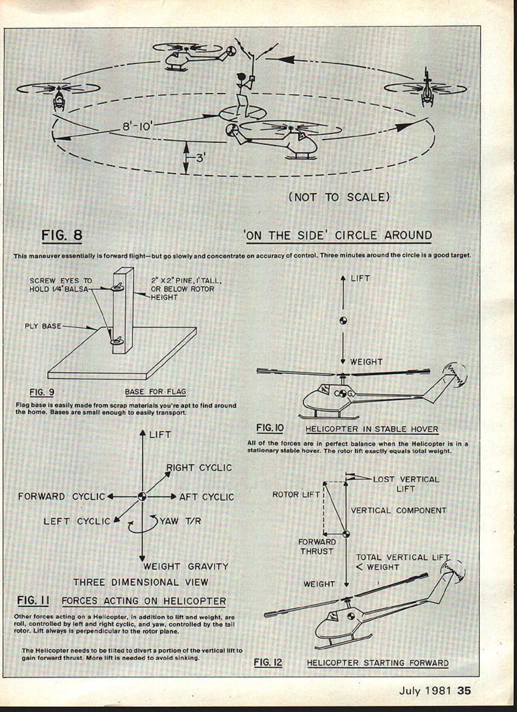 I got Level II last months Part 1 youll know what ZAH means hopefully youll have chance practice month continue conclude five level structured program learning fly RC Helicopter Part 2E Tom Burdin comments advice John Simone Jr ib\ 2 Ft - / 3 -FLI LEVEL III maneuvers level accotnp lished calm air Task Description Measurement Criteria 1 The student will able raise Heli copter vertically altitude 3 ft return directly 1-ft square maneuver began Orientation will tail towards pilot 2 student will able raise Helicop ter vertically altitude 3 ft maintain 3-mm hover altitude within radius three feet lift-off square 3 student will able raise Helicop ter vertically altitude 3 ft negotiate Level II triangular course clockwise CW counterclockwise CCW pausing 1 mm hover over square Orientation must remain tail towards pilot Discussion think spent lot time Level II youre about establish new record level real meat training learning should greatest As have doing up now well build slowly difficulty point control craftto amazement around First need retrim machine airborne flight zero altitude hovering ZAH required different trims well now trim airborne stay trim mode awhile Again dont forget note settings future re-buildsyes will have oppor tunity will minimized follow Markers needed define various practice courses flag supported -sq balsa ex cellent wont break rotor blades Fig 9 shows flag base should made July 1981 33 interested looks Id better start building said notes author Course provides progressive steps learning fly Twenty-five feet marked bythe flag doesnt seem like much until RC Helicopter safetyand minimum risk chopper try comes second task Level V begin climb reduce lift slowly settle back slowly ground Just last month John Simone Jr will provide comments time-to-time identified symbol JS beginning ending comments JS Dont relax until solidly ground again rotor speed reduced low level can tip machine over ground time rotor creating enough lift tilt itself Usually high rotor speed can saving grace can maintain control though flying has its watch-outs too dont chop power get trouble altitude old fixed-wing safety valve sure disaster Helicopter JS first little bounce may few inchesthis fine Increase height bounce little time noting correcting trim servo connector Start tail rotor T/R proceed sequentially rightlleft cyclic forward/aft cyclic Con tinue process bouncing until can observe trim settings 3-ft altitude position behind machiie should still 8-12 feet Its OK take up couple tanks fuel get 3-ft level Pace yourself No competition herejust solid learn ing may retrim time during process OK also Remenber learn safely minimum aircraft damage dont hurry Youve completed first maneuver can raise Helicop ter straight up slowly 3 ft return slowly pad impartial honest observer will verify OKso much bouncing around Its time hover maneuver no exten sion previous maneuver youve trimmed out properly should now have confidence machines stability need antici pate control inputs Begin bounce maneuver again reach 3-ft reduce power start down reduce level slightly above normal descent power levelsuch machine seems pause 3 ft momen tarily reduce lift last little bit return terra firma may tempted try lower altitude Resist temptation Control much better 3 ft I-ft because youre out 34 Model Aviation LE hase shown h cIic rear cyc training strictly accidents will flappen uoii deep breath get things stabilized What throw away ZAH trim level settings well want lift off altitude 3 ft ZAH again Level IV come right back down like yo-yo-slowly Begin friendly square again go doing going notice ZAH should easy comfortable machines reactions retrim axis nowlittle body Enelish reouired Take time Slowly advance lift control until NO OCR TEXT ground effect Also lets face time make correction before hit ground Now just did learned bounce maneuver going master maneuver slowly will simply extend time 3-ft altitude hesitations JS As stabilize hover retrim ming may required Keep mind left/right cyclic trim can upset tail rotor trim tail rotor also contributes L/R stability well countering torque So change L/R trim main rotor will need check T/R trim well JS During early pauses yard air youll learning control cyclic lift tail rotor importantly inter-rela tionships between last two really interactive hover work tail rotor counter engines torque creates power lift Helicopter As lift torque required required remain same altitude Conversely less required descend counter-torque required T/R will mirror lift commands important build some auto-reaction part JS As approach ground descent should slow descent prior touchdown Remember add little T/R cor rection counter torque Again anticipation need smooth control movement pays off IS Throughout hover yo-yo maneuvers CW main rotor M/R Helicopter flying nosethe mode will discussed now onright CW tail rotor control required lift increased CCW control lift decreased amount T/R depends change lift rate change lift hover lift off right T/R required until reach 3 ft actual hover neutral T/R control required trim work successful little left tail rotor required maintain orientation descent As work maintain altitude youll also working maintain tail-in orientation pauses 3-ft should become longer longer become proficient Having someone noting time simply counting time hover~ very helpful note progress maneu ver Keep record hover time youll see recorded times increase towards three-minute mark Up point weve stressed altitude orientation As become proficient hover need become aware position over square make cyclic correc tions back center point Make correc tions small patient goal remain 3 ft height within 3 ft center square three minutes Again use second person verify work dont worry burn up gallon fuel getting point beginning hover practice basic maneuvers needed form firm foundation automatic reactions build up mental model machines performance JS Youll notice first efforts should maintaining control ho
