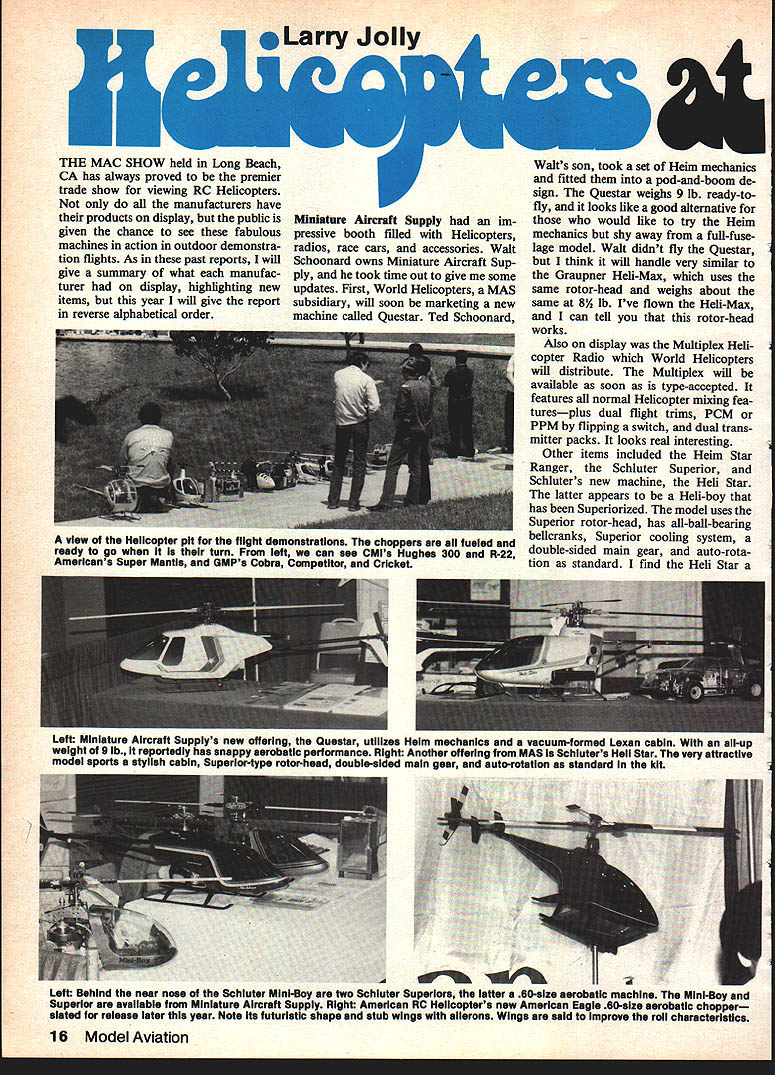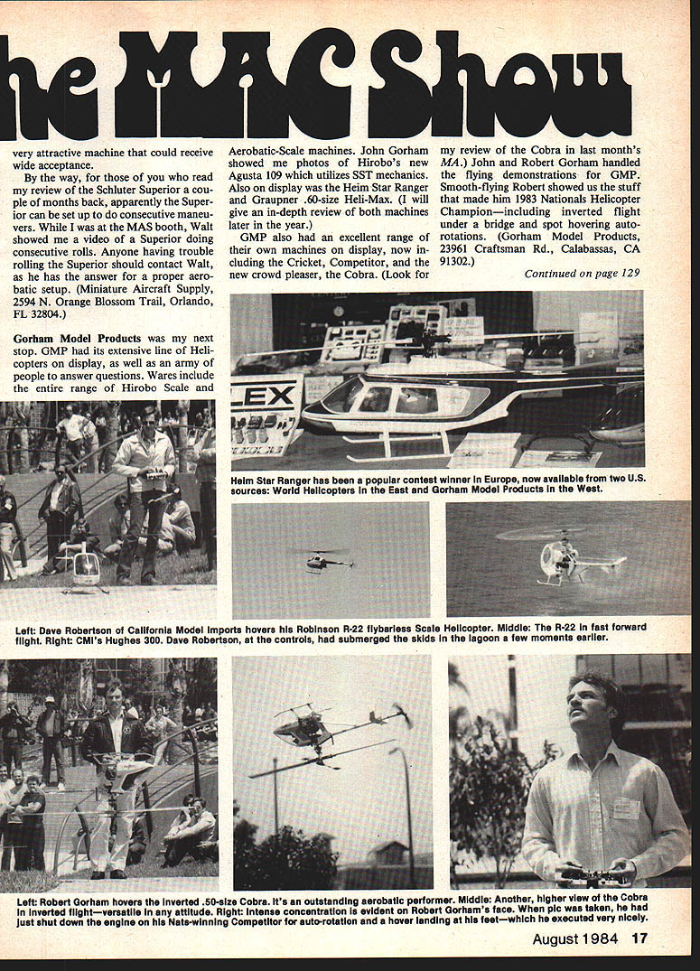 I Walts son took set Helm mechanics fitted pod-and-boom de sign Questar weighs 9 lb ready-to fly looks like good alternative would like try Helm mechanics shy away full-fuse lage model Walt didnt fly Questar think will handle very similar Graupner Hell-Max uses same rotor-head weighs about same 8A lb Ive flown Hei-Max can tell rotor-head works Also display Multiplex Heli copter Radio World Helicopters will distribute Multiplex will available soon type-accepted features normal Helicopter mixing fea turesplus dual flight trims PCM PPM flipping switch dual trans mitter packs looks real interesting Other items included Helm Star Ranger Schluter Superior Schluters new machine Heli Star latter appears Hell-boy has Superiorized model uses Superior rotor-head has all-ball-bearing bellcranks Superior cooling system double-sided main gear auto-rotation standard find Heli Star Left Miniature Aircraft Supplys new offering Quester utiiizes Helm mechanics vacuum-formed Lexan cabin all-up weight 9 lb reportedly has snappy aerobatic performance Right Another offering MAS Schiuters Heli Star very attractive model sports styiish cabin Superior-type rotor-head double-sided main gear auto-rotation standard kit II Left Behind near nose Schiuter Mini-Boy two Schiuter Superiors latter 60-size acrobatic machine Mini-Boy ana Superior available Miniature Aircraft Supply Right American RC Helicopters new American Eagie 60-size aerobatic chopper slated release later year Note its futuristic shape stub wings ailerons Wings said improve roil characteristics 16 Model Aviation eLarry Jolly THE MAC SHOW held Long Beach CA has always proved premier trade show viewing RC Helicopters manufacturers have products display public Miniature Aircraft Supply im given chance see fabulous pressive booth filled Helicopters machines action outdoor demonstra- radios race cars accessories Walt tion flights As past reports will Schoonard owns Miniature Aircraft Supgive summary what manufac- ply took time out give some turer display highlighting new updates First World Helicopters MAS items year will give report subsidiary will soon marketing new reverse alphabetical order machine called Questar Ted Schoonard view Helicopter pit flight demonstrations choppers fueled ready go turn Prom left can see CMis Hughes 300 R-22 AmerIcans Super Mantis GMPs Cobra CompetItor Cricket N 11 very attractive machine could receive wide acceptance way read review Schiuter Superior cou ple months back apparently Super ior can set up consecutive maneu vers MAS booth Walt showed video Superior doing consecutive rolls Anyone having trouble rolling Superior should contact Walt has answer proper acro batic setup Miniature Aircraft Supply 2594 N Orange Blossom Trail Orlando FL 32804 Gorham Model Products next stop GMP its extensive line Heli copters display well army people answer questions Wares include entire range Hirobo Scale Aerobatic-Scale machines John Gorham review Cobra last months showed photos Hirobos new MA John Robert Gorhani handled Agusta 109 utilizes SST mechanics flying demonstrations GMP Also display Heim Star Ranger Smooth-flying Robert showed us stuff Graupner 60-size Hell-Max will made him 1983 Nationals Helicopter give in-depth review both machines Championincluding inverted flight later year under bridge spot hovering auto OMP also excellent range rotations Gorham Model Products own machines display now in- 23961 Craftsman Rd Calabassas CA cluding Cricket Competitor 91302 new crowd pleaser Cobra Look Continued page 129 Helm star Ranger has popular contest winner Europe now available two US sources Wand Helicopters East Gorham Model Products West Left Dave Robertson California Model imports hovers Robinson R-22 flybarless Scale Helicopter Middle R-22 fast forward flight Right CMIS Hughes 300 Dave Robertson controis submerged skids lagoon few moments earlier Left RObert Gorham hovers inverted 50-size Cobra its outstanding acrobatic performer Middle Another higher view 0 tne Cobra inverted flightversatile attitude Right intense concentration evident Robert Gorhams face plc taken Just shut down engine Nate-winning Competitor auto-rotation hover landing feetwhich executed very nicely Futaba radio people topof-the-line PCM Helicopter Radio 7G heli-systems display PCM mighty impressive gives us just hint technology will take us coming years Futaba 555 W Vic toria St Compton CA 90220 Condor Hobbieshad Ishimasa line RC Helicopters display Ishimasa manufacturers electric-powered EH- 1 25 glow-engined Playboy Con dor also markets several imported lines including Rossi Webra engines Check just might have hard-to-find ilem youve look ing Condor Hobbies 17971 Skypark Circle Suite D Irvine CA 92714 California Model Imports Kobe Kiko Helicopters display Along popular Hughes 300 gas nd glow versions also showed R-22 Scaletype machine Dave Robertson told will soon flybar head R-22 seems fear Scale flybarless head has caused some concern among fliers Dave handled flying CMI proved R-22 flies good looks California Model Im ports PO Box 1695 Garden Grove CA 92642 Circus Hobbles such large crowd around booth trouble get ting front Circus imports extensive line Kalt Helicopters New year Kalts new 206L Long Ran ger truly beautiful offering Also new shown updated Custom Baron 20 looks like Kalt has done some house-cleaning popular 20-size Baron incorporating some new ideas improve its aerobatic qualities Check Circus details availability Heres oft-road buggy loaded fun excitement designed off-road operation no need special track know will like buggy Its rugged withstand abuse hard operation rough terrain Its easy assemble Bayou Products car ries replacement parts ORDER DIRECT FROM HOW TO ORDER canjIbE EEIIISE order char ft over duc neon ur 5Aor STER ARDorwecanU ship ftCOD cash pC BOX 8628 ORLEANS LOUISIANA 70182 Add $350 postage i-am Service call Toll Free Line 1-800-535-2568 except LA handlinq USA Also shown Circus TSK acces sories TSK manufactures high-quality add