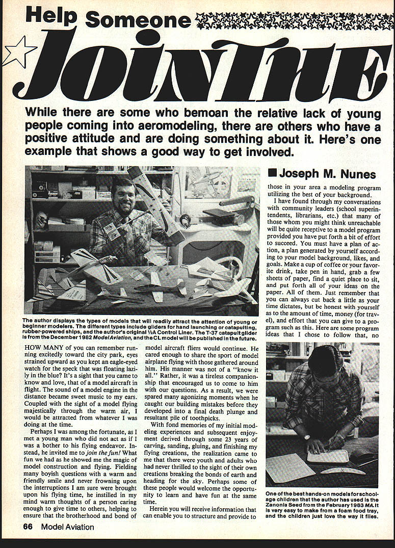 Someone some bemoan relative lack young people coming aeromodeling others have positive attitude doing something about Heres example shows good way get involved HOW MANY can remember runfling excitedly toward city park eyes strained upward kept eagle-eyed watch speck floating lazi ly blue Its sight came know love model aircraft flight sound model engine distance became sweet music ears Coupled sight model flying majestically through warm air would attracted whatever doing time Perhaps among fortunate met young man did act bother flying endeavor stead invited join fun What fun showed magic model construction flying Fielding boyish questions warm friendly smile never frowning upon interruptions am sure brought upon flying time instilled mind warm thoughts person caring enough give time others helping ensure brotherhood bond model aircraft fliers would continue cared enough share sport model airplane flying gathered around him manner know Rather tireless companion ship encouraged us come him questions As result spared agonizing moments caught building mistakes before developed final death plunge resultant pile toothpicks fond memories initial mod eling experiences subsequent enjoy ment derived through some 23 years carving sanding gluing finishing flying creations realization came youth adults never thrilled sight own creations breaking bonds earth heading sky Perhaps some people would welcome opportu nity learn have fun same time Herein will receive information can enable structure provide U Joseph M Nunes area modeling program utilizing best background have found through conversations community leaders school superin tendents librarians etc might think unreachable will quite receptive model program provided have put forth bit effort succeed must have plan ac tion plan generated yourself accord ing model background likes goals Make cup coffee favor ite drink take pen hand grab few sheets paper find quiet place sit put forth ideas paper Just remember can always cut back little time dictates honest yourself amount time money trav el effort can give pro gram such some program ideas chose follow no 86 Model Aviation author displays types models will readily attract attention young beginner modelers different types include gliders hand launching catapulting rubber-powered ships authors original V2A Control Liner T-37 catapult glider December1982 ModelAviation CL model will published future best hands-on models forsohool age children author has used Zanonla Seedfromthe FebruarylgS3MAlt very easy make foam food tray children just love way flies doubt would good starting point 1 Teach youth adults basic ideas thoughts behind flight fun manner through utilization model aircraft 2 Introduce various sources information magazines available student show use information 3 Show relationship modeling future career options 4 Teach proper use respect tools used modeling 5 Build sense pride confidence through starting completing chosen project 6 Instill idea working together other students parents through building flying sessions 7 Allow student explore his/her interest encourage participant use his/her own creativity 8 Build proper sportsmanship through win/lose competition know what talking about times presenting program have found myself having revise things bit present modeling tactful manner little Johnnys mother wants know what will happen puts fingers spinning prop AA model will know what mean about having think fast tactful same time will asked questions type Sometimes children can present chuckle curiosity very real questions Can just sit center circle let plane fly around get dizzywithout hanging handle What will happen put grasshopper rubber-powered airplane take him ridewill get tangled up successful has program Upon initial contact superinten dent school system immedi ately given go ahead conduct evening class fifth grade up given use very nice science room complete large tables use gym use reproduc tion equipment initial response cluded about 20 youths parents completed four projects group time student free choose projects his/her own liking based records kept dividuals workmanship latter infor mation used help determine suita ble projects student parents would waste money purchas ing models student could success fully complete spent quite lot time discussing whys why-nots flying ac tually constructing models Yes also built models As reached various stages completion would have model ready students see allowed students observe what he/she would working night encourage continuous building gets model done Often kids would try outdo instructors model indeed encouraged Its thinking like students really keeps toes As projects finished able fly school gym ribbons awarded students efforts got ribbon would hand out 1st 2nd 3rd-place prizes along participation-type ribbons As weather permitted would fly outdoors again contest format During course visited local airport group parents allowed FAA control tower ac tually sat some company jets Everyone chance real Hangar flying sitting jet cockpits might add could have encouraged program results help good friend Jim Jones Jim right arm help able places know questions questions Continued page 164 November 1984 67 stuay concentration People inter ested modeling will share yourtlme knowledge CA Rutan pics No place torthe shytypesi Picture wastaken atthe NASA 25th Anniversary Program Jack son Ml Note models display arent Scale types models tend scare few would modelers away due totheir obvious building complications Youll get interest questions models within everyones grasp Show basic fun types list can expanded suit goals fueled imagination desires promoting good public rela tion attitude toward model aircraft will want demonstrate whomever program presented sincere pleasant work enthusias tic about what doing Specifications Wing Area 1500 sq Span Weight 20-25 lbs Engine 20-37 Fuselage Formers/Planing Wing Foam 3/32 SheetingKit $4 flfl95 Stab Fin Solid Sheet Cl