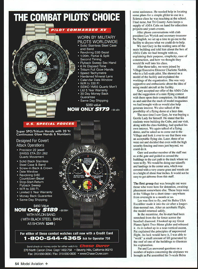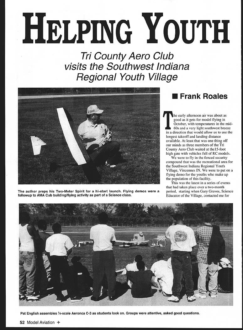 HELPING YOUTH Tn County Aero Club visits Southwest Indiana Regional Youth Village Frank Roales early afternoon air about good gets model flying October temperatures mid 60s very light southwest breeze direction would allow us use longest takeoff landing distance available least thing off minds three members Tn County Aero Club waited thel5-foot high gate vehicles full RC models fly fenced security compound recreational area Southwest Indiana Regional Youth Village Vincennes IN put flying demo youths make up population facility latest series events taken place over two-month period starting Gary Graves Science Educator Village contacted 52 Model Aviation or preps Two-Meter Spirit hi-start launch Flying demos followup AMA Cub buildinglflying activity part Science class Pat English assembles -scale Aeronca C-3 students look Groups attentive asked good questions some assistance needed help locating some plans simple glider use Science class teaching school Tn County Aero keeps supply AMA Cubs hand education projects youth events After phone conversations club president Les Wyrick secretary-treasurer Pat English set up time go out facility discuss what could help met Gary waiting area main building told him about box AMA Cubs brought us explaining purpose simplicity ease construction thought would fit well class After talks joined Village Executive Director Charlotte Nesbitt full-scale pilot showed us model facility explained workings organization very supportive enthusiastic about idea using model aircraft facility Gary accepted offer AIVIA Cubs suggestion mini flying contest upon completion thanked us said stack model magazines brought us would also help generate interest also talked possibility flying demo later date next time saw Gary buying Gentle Lady himself stated students building Cubs visit along class building sparked own interest again talked flying demo asked us come out Village look over see acceptable flying site Later three us went out decided high security fencing trees just beyond could Gary another member staff met us gate guided us around buildings cart path track fly would doing takeoffs landings center area covered very coarse grass weeds cut height about four inches would easy get airborne stuff first group brought out detention awaiting placement somewhere else boys Village short timeanywhere overnight month Les first fly Balsa USA Excaliber made air after longerthan-normal run After aerobatic flight model returned safely meantime hi-start stretched far fence across baseball diamond hooked up Great Planes Spirit Two-Meter glider released As rushed up near-vertical ascent Pat explained principles unpowered flight As luck would have able work small amount lift generated roof buildings illustrate explanation Pat Les answered questions number topics concerning airplanes brought Pat assembled -scale Balsa 54 Model Aviation LAGE JIG STATIONS MORE GATOR PRODUCTS Provides solid support accurate building Rugged 7ply aircraft plywood construction Three sizes available Standard tar fuse up 7-1/2 wide Jumbo tor fuse up 10 wide Giant Scale fuse up 15 wide Use building board base mount Uni-St rut Guide Rails versatile set-up Contains hardware & instructions including Uni-Strut information Box 4 Standard Jig Stations $2195 Box 4 Jumbo Jig Stations 395 Box 4 Giant Scale Jig Stations $3895 2 Five Ft Guide Rails & Mounting Nuts . $2295 MV-i Typhoon Nats FAI Winner Plans Parts available 909 1000 22 1140 versians Plug-in Wing Tube & Socket Sets 7/16 5/8 7/8 1-1/2 dia Special Lengths Order Plug-in Wing Adjusters 4-pack Adjust Both Wing Panels Plug-in Adjustable Stab Kits Micro-Adjustment far Both Stab Panels Soft-N-Safe Engine Mounts far 120 91 60 size engines Feather Life Glass Cloth 7 az Close Weave Fast Filling Lightest Finished Weight 2100 N Old Mill Rd Brookline MO 65619 y Phone 417-725-7755 VISA/MasterCard Welcomed $650 per tern S&H Comp Advantage Using tap-quality componen s developed Congratulations Red Max 1st place Winners refined over quarter century AMA Air Nationals experience RED MAX fuels specially 1998 AA Combat Larry Driskill engineered Maximum Performance Power 1998 hA JrCombat Skyler Skelly Protection RED MAX known sold 1998 hA Open Bob & Andy Mears PIES oil internationally best fuel can use 1998 Free Flight Bob Johannes model engine affordable prices MAC Scale Aerobatic Nationals have excellent customer service call us 1998 Advanced Michael J Kuper Visit website informationlpricing IRCHA Helicopter Internationals Model activities Racing Pattern Fun etc Fuel types Plane Helicopter Boat Car Jet etc Engine types 2 or4 cycle Glow Diesel Nitro Power blends 0% 75% 5% Oil blends RED MAX Synthetic / Syn -Castor **Customer special blends available Minimum gal Standard 4-gal 20-qt Cases Shipping UPS door 12 gal motorfreight commercial address Price breaks 412 20 60124 gal Special 4i~-nt nfl nrnid -Iiih orders I__Ill_J41 eI4IJ1 i [1 ques Military Civilian Helicopters Sailpianes hove wodds largest aircraft documentation collection 7400 different full color photo studies 1903-1998 350003-view line drawings 1999 Catalog/Guide 228 pogesl Only $8o 0 $1000 $1500 BobliankasAt ca&Aus oio$lt00 AIRCRAFT DOCUMENTATION 3114 Yukon Avenue a Mesa CA 92626 714 979-8058 1998 World Record Breakerl Bruce Bennett NAMBA Boat Nationals 1998 B-Stock Tunnel Russ Nachtweih 1998 Stock OPC Tunnel George Wittman 1998 A-OIB Mono Elden Huntling Numerous other awards year FHS Supply lncPO Box 9CloverSC 29710-0009 Sales 800 742-8484 Voice 803 222-7488 Internet FHSoiliaoLcom Fax 803 222-7285 Website httpIlmembersaalcomIFHSoil RED MAX Shirts Hats & Stickers available USA Aeronca C-3 questions asked very thoughtful deliberative part apparent kids genuinely interested demo just get out something else After getting usual much does cost received questions wood types glues covering discussions different types kits also received questions about radio worked its range way moved control surfaces Eventually time put club t