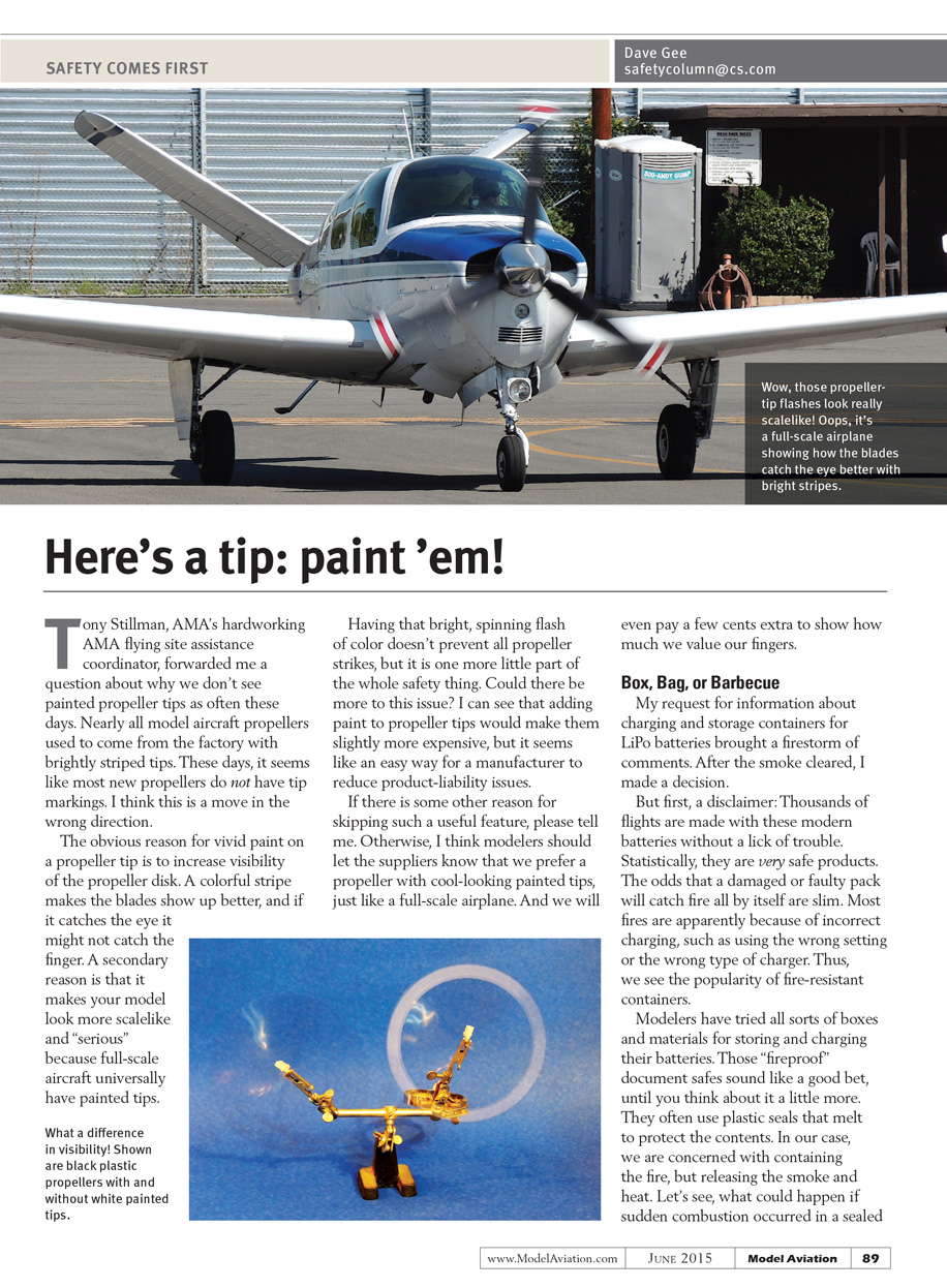 If there is some other reason for skipping such a useful feature, please tell me. Otherwise, I think modelers should let the suppliers know that we prefer a propeller with cool-looking painted tips, just like a full-scale airplane. And we will even pay a few cents extra to show how much we value our fingers.