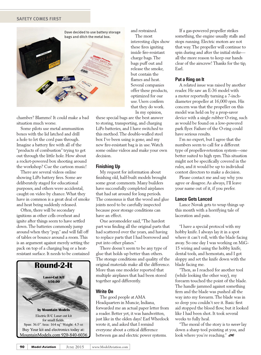 A related issue was raised by another reader. He saw an E-36 model with a motor reportedly turning a 7-inch-diameter propeller at 16,000 rpm. His concern was that the propeller on this model was held on by a “prop-saver” device with a single rubber O-ring, as would be found on a low-powered park flyer. Failure of the O-ring could have serious results.