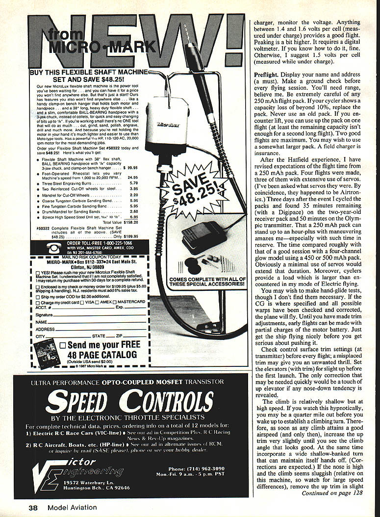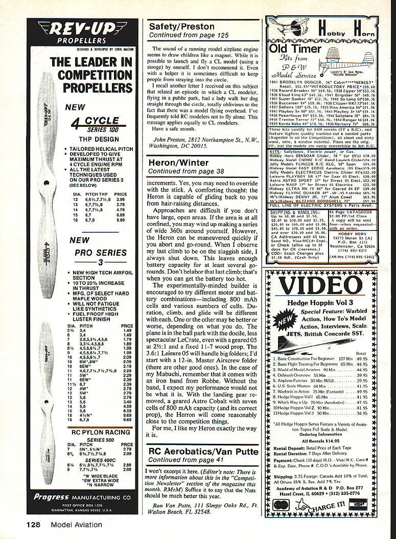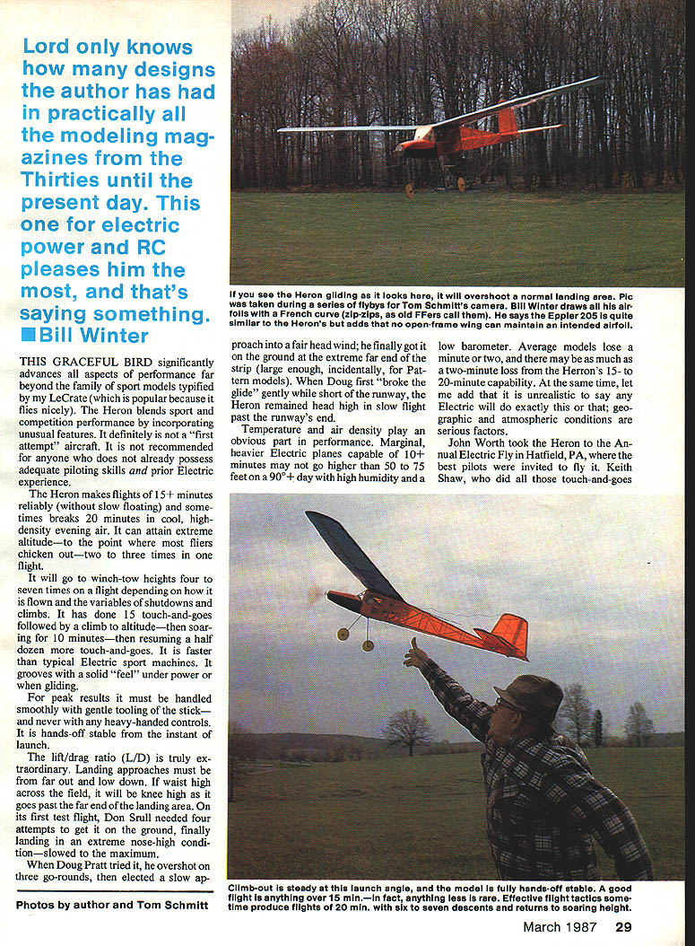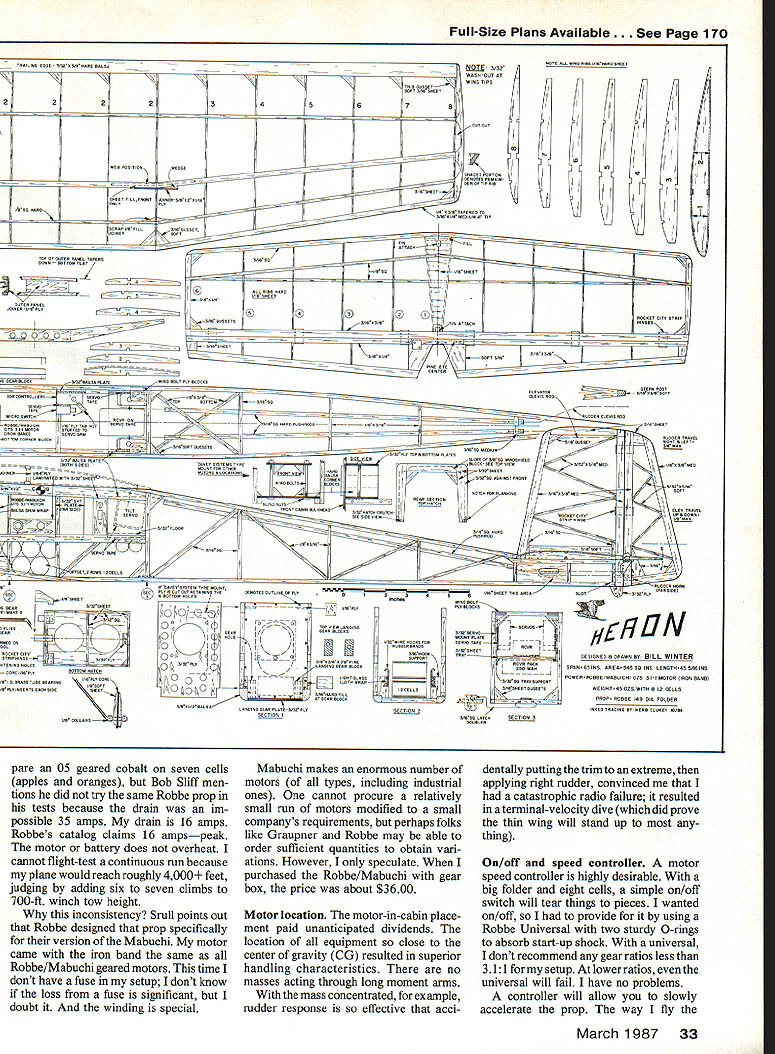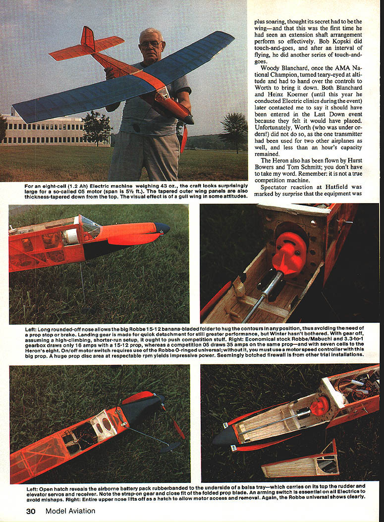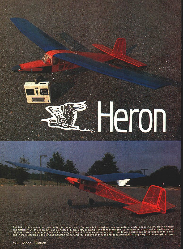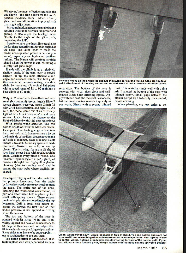 NO OCR TEXT Lord knows designs author has practically modeling mag azines Thirties until present day electric power RC pleases him thats saying something U Bill Winter THIS GRACEFUL BIRD significantly advances aspects performance far beyond family sport models typified LeCrate popular because flies nicely Heron blends sport competition performance incorporating unusual features definitely first attempt aircraft recommended anyone does already possess adequate piloting skills prior Electric experience Heron makes flights 15 minutes reliably slow floating some times breaks 20 minutes cool highdensity evening air can attain extreme altitudeto point fliers chicken outtwo three times flight will go winch-tow heights four seven times flight depending flown variables shutdowns climbs has done 15 touch-and-goes followed climb altitudethen soar ing 10 minutesthen resuming half dozen touch-and-goes faster typical Electric sport machines grooves solid feel under power gliding peak results must handled smoothly gentle tooling stick never heavy-handed controls hands-off stable instant launch lift/drag ratio LID truly ex traordinary Landing approaches must far out low down waist high across field will knee high goes past far end landing area its first test flight Don Srull needed four attempts get ground finally landing extreme nose-high condi tionslowed maximum Doug Pratt tried overshot three go-rounds elected slow ap proach fair head wind finally got ground extreme far end strip large enough incidentally Pat tern models Doug first broke glide gently short runway Heron remained head high slow flight past runways end Temperature air density play obvious part performance Marglnal heavier Electric planes capable 10 minutes may go higher 50 75 feet 900 day high humidity low barometer Average models lose minute two may much two-minute loss Herrons 15- 20-minute capability same time let add unrealistic say Electric will exactly geo graphic atmospheric conditions serious factors John Worth took Heron An nual Electric Fly Hatfield PA best pilots invited fly Keith Shaw did touch-and-goes March 1987 29 see Heron gliding looks will overshoot normal landing area Plc taken during series flybys Tom Schmitts camera Bill Winter draws air foils French curve zip-zips old FFers call says Eppler 205 quite similar Herons adds no open-frame wing can maintain intended airfoil Photos author Tom Schmiff Cllmbout steady launch angle model fully hands-off stable good flight anything over 15 minin fact anything less rare Effective flight tactics some time produce flights 20 mm six seven descents returns soaring height plus soaring thought its secret wingand first time seen extension shaft arrangement perform effectively Bob Kopski did touch-and-goes after interval flying did another series touch-andgoes Woody Blanchard once AMA Na tional Champion turned teary-eyed alti tude hand over controls Worth bring down Both Blanchard Heinz Koerner until year conducted Electric clinics during event later contacted say should have entered Last Down event because felt would have placed Unfortunately Worth under ders did transmitter used two other airplanes well less hours capacity remained Heron also has flown Hurst Bowers Tom Schmitt dont have take word Remember true competition machine Spectator reaction Hatfield marked surprise equipment Left Long rounded-off nose allowsthe big Robbe 15-12 banana-bladed folderto hug contours position thus avoiding need 0 prop stop brake Landing gear made quick detachment still greater performance Winter hasnt bothered gear off assuming high-climbing shorter-run setup ought push competition stuff Right Economical stock Robbe/Mabuchi 33-to-i gearbox draws 16 amps 15-12 prop whereas competition 05 draws 35 amps same propand seven cells Herons eight On/off motor switch requires use Robbe 0-ringed universal must use motorspeed controllerwith big prop huge prop disc area respectable rpm yields Impressive power Seemingly botched firewall other trial installations Left open natcn reveals airborne battery pack rubberbanded underside balsa traywhich carries Its top ruaaer elevator servos receiver Note strap-on gear close fit folded prop blade An arming switch essential Electrics avoid mishaps Right Entire upper nose lifts off hatch allow motor access removal Again Robbe universal shows clearly 30 Model Aviation i-or 1gm-call 1 Electric machine weighing 43 oz craft looks surprisingly large so-called 05 motor span 5V2 ft tapered outer wing panels also thickness-tapered down top visual effect gull wing some attitudes ,1gGN ay BILL WINTER 3/16 SO 3/16X3a v i5 I/8X3/8 MED 3/32X&16MED -1/16 SHEET ON lOP B BOTTOM N SHEET \ ROBSE ROBSE/MABUICH 075 31-I MOlOR I/8X3/16 SQ x l/8X3/16 LONGE RON S 3/16 SO L I/8X3/16 3/16 SO /8 SQ TOP SPAR N MEDIUM N ALL RIBS HARD 1/16 SHEET HARD BALSA 3/16X3/a MED 3/16XI/4 -y II 47 1/8SQ HARD 3/32 PLANKING BOTrOM B TOP 1/2 OZ GLASS CLOTHI/IS PLY CORE THINNED EPOXY 7 I/8Xi/4 SPRUCE SPARS TOP BOTTOM N N N /4 X 3/8 BALSA MEDIUM -46 N 7 entirely stock cheapie motor Robbe/Mabuchi uses run-of-the-mill Mabuchi has special winding suspect true also Graupner/Mabuchi new Mabuchi Polks has showingand pos sibly motor Goldberg has new Electric Gentle Lady combo 31to-i Robbe gearbox Robbes 15-12 banana-bladed folder eight 12 Ah cells draws 16 amps ground perhaps unloads much 12 amps flight roughly 60% drain similar-looking Mabuchi motors am inventor innovator Cu rious about forms aircraft dont develop design through repetitive building revisions along way draw upon vast fund others experiences through magazines combine things impress recipe objective Heron near top Electric food chain begin Don Srulls development popular Sparky scaled up old Lidgard Rubber model kitted Comet fascinated bent thinking concept slow-gliding LeCrate After several years watching spiring work giant folding props high reduction ratios produced phe nomenal climbs durations could see exciting flier capable 15 minutes Don arrived nigh