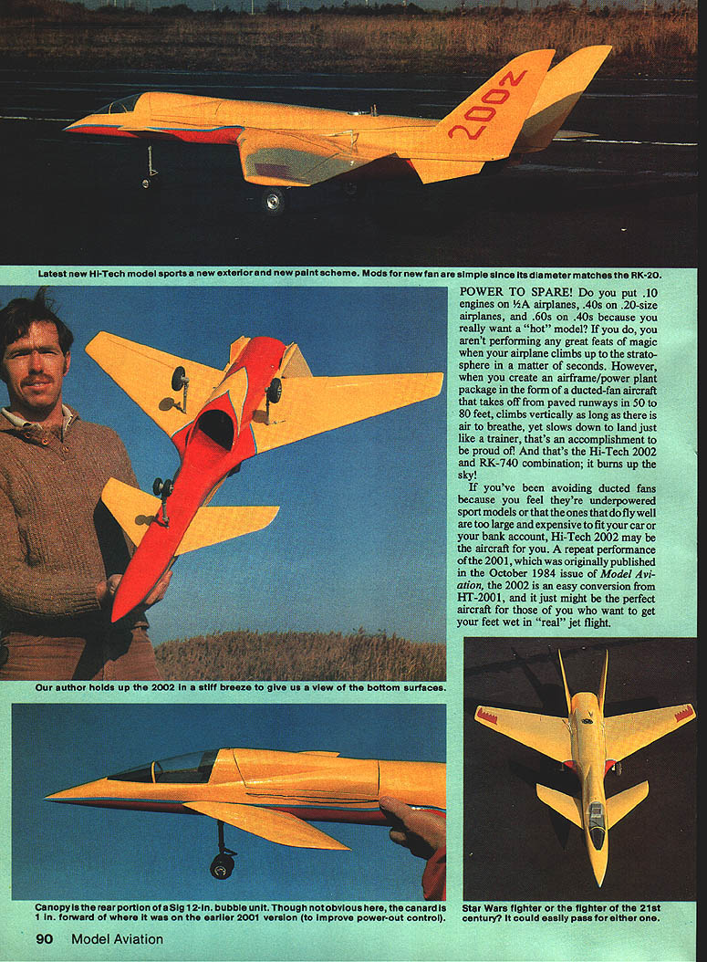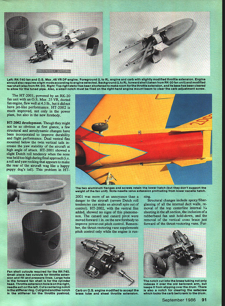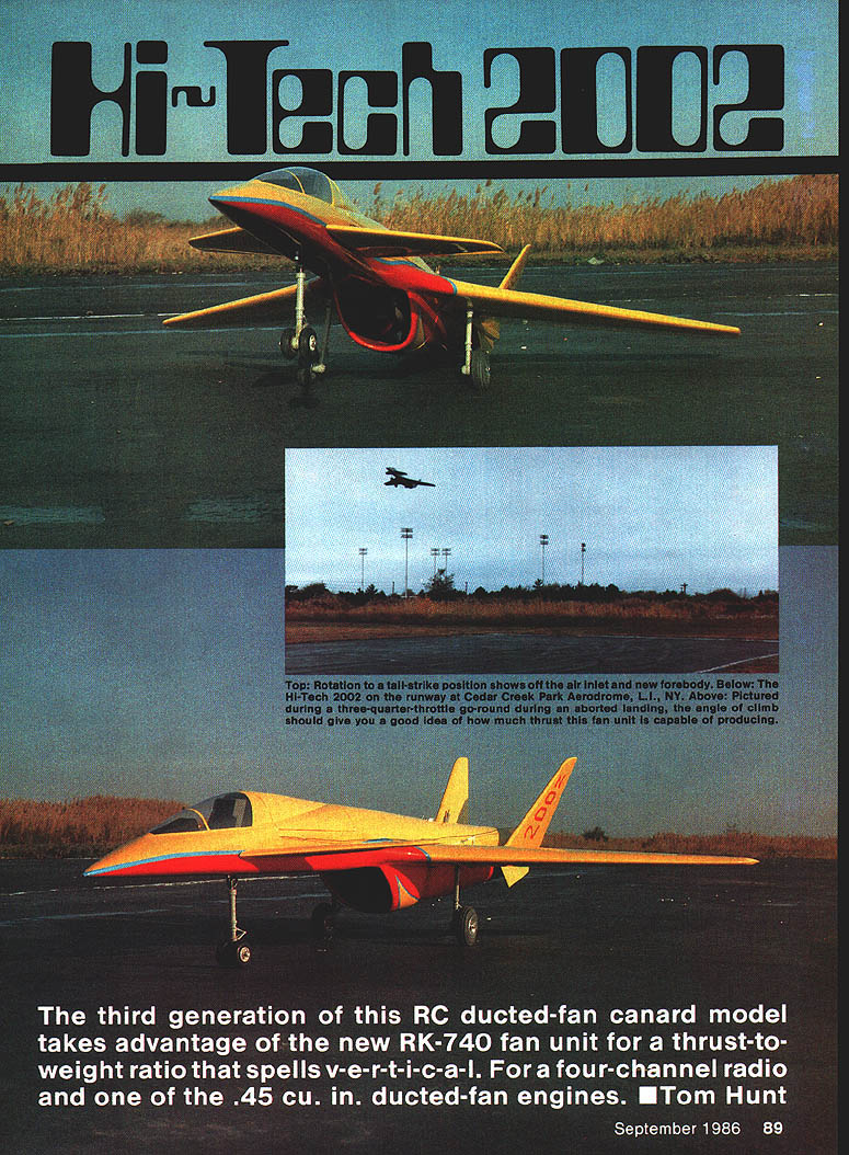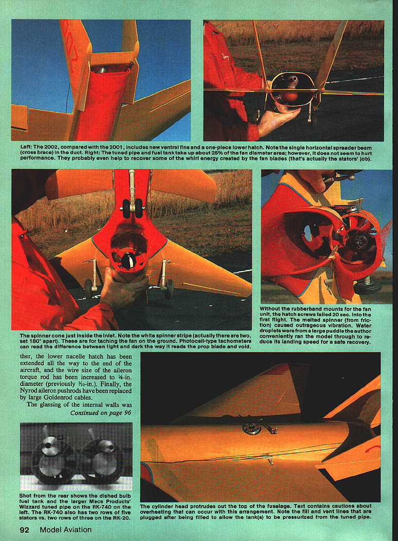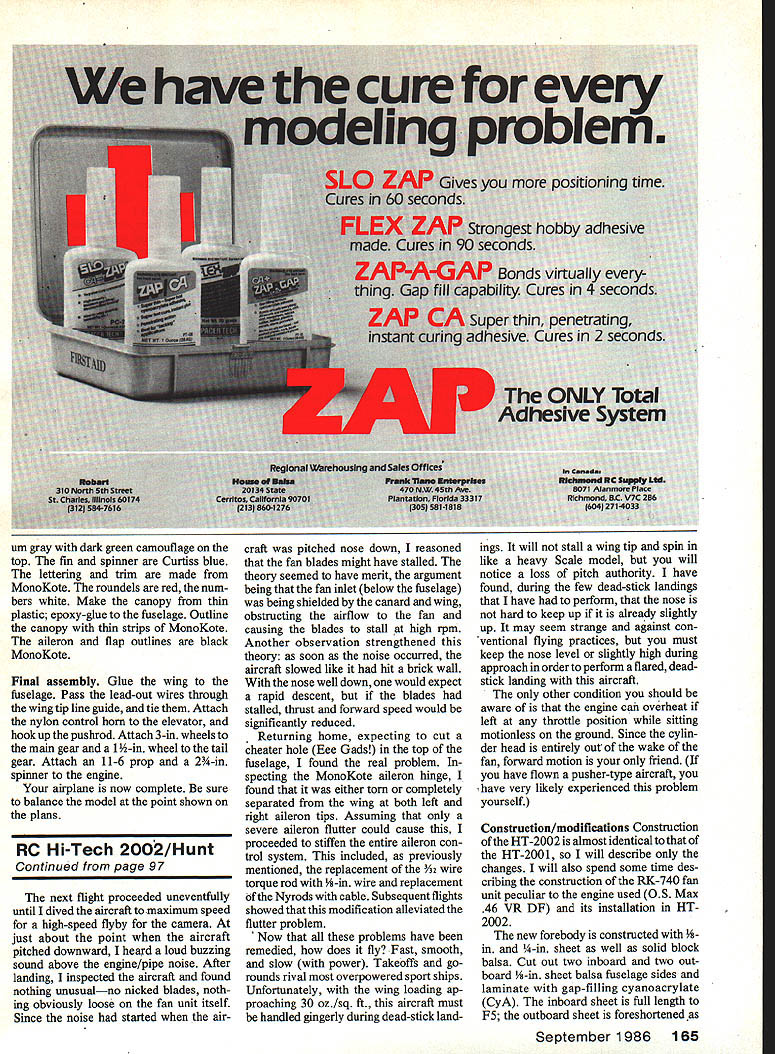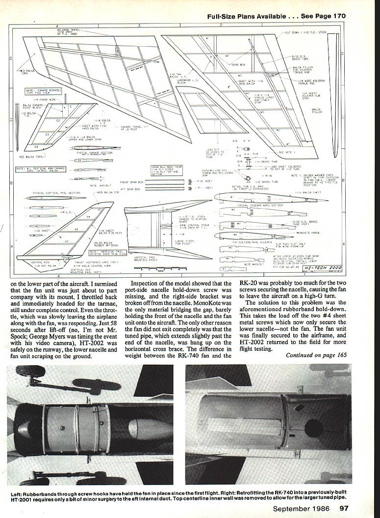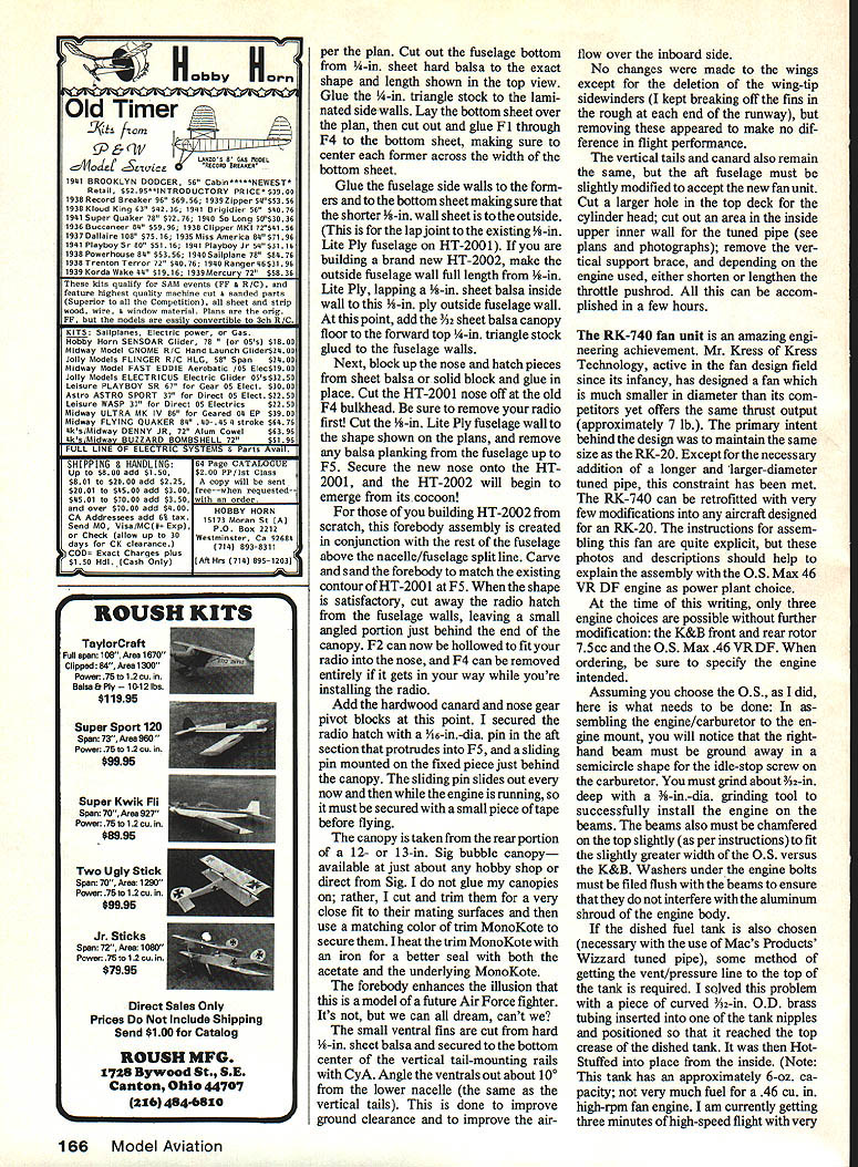 NO OCR TEXT 1 IN WUIU UT WflUfU U WUU U 90 Model Avpti vufuIUn Imeter mu SPARE airplaa 60a Ian irpiane cties matter Ho oi au paved iii os vertically e yet slowi r thats t thai u uie O combination burns uj ye nui ibel Kfleyre ones zcoun whichwi er 1984 02 ii just w et real jet UI MOLWi onversioa NO OCR TEXT NO OCR TEXT Full-Size Plans Available. See Page 170 SEE S,EEH 0 PASS SHEET BELLCPANCVFDA VERTICAL TAIL SODEPED SIHAND SPAUST AVEEL OSLAPVANE OFLONITIA SOP VIEDSASH FLLEAS CLTHWAH Ip WAL AIC S GLEHA TLPAES PIPE 2 -LBWALL lASSO2A rSIHAP BAIHIND -----N5---U FAD SF SEHA TAIL PASSEASLETINS HAILS ANS 55 GLASS T AND HATTOS SHEA WINS SLAFALESF INSSF AALS AFT SF FH 5 found necessary starter cone engages slightly off center began rattling around inlet uncontrol lably fractured 46 sheet balsa internal wall number places exhaust duct glassed order stiffen entire aft fuselage torsion small section top centerline exhaust duct removed accommodate larger tuned pipe used RK-740 vertical cross brace removed same reason lower nacelle hatch extended facilitate re moval fan unit its longer tuned pipe rubberband fan-unit-hold-down absolutely necessary intend keep fan unit inside aircraft during entire flight about mo ment increase aileron wire size replacement Nyrods cables required eliminate aileron flutter problem Flight testing Anticipations excep tional flight performance high after briefly experimenting modified HT 2001 aircraft gray aircraft new forebody First flights aircraft engine yet broken no pipe pressure essential optimum engine performance showed exceptional climb rate -throttle position go-round response generally found propellerdriven aircraft Unfortunately testing curtailed dead-stick landing terrain resembled face moon stepped HT-2002 afore mentioned refinements except strength ened nacelle hatch hold-down attachment Twenty seconds flight full throttle heard severe airframe vibration Did throw blade Did pick up some sort foreign matter runway continued fly aircraft few seconds until noticed deepening profile Left bottom side partiaiiyassembied fan unit shows needle valve protruding trom tfle inner engine snroud aluminum tube needle valve extended point small Allen wrench ora piece 1/16 music wire bentto Lehapeand held place Allen setscrew located top stock needle valve Right RK-20 foreground RK-740 nearly identical size Slight differences between pose no problem making direct substitution RK-740 planes previously equipped RK20 96 Model Aviation C PASS BLOODDOUTESILEASS DNA SANE APES EILSDJPUSAAOOSTSHS WINS SIDESOFAIS H PPEUSEASE FILES LTA STEPS SF OS HASS OUTSIDEAELISSESWV SAEU AL SLADAHPLT PUTT ANDHP SF OH FLYNAIFLELAVESEALASSO HHSLE NATE AL L 555 S FAAPEHS S SIT LOPE ALA NESSAAOAHST NALEW STsEAAISE SPELT OFTMANTlES HWCA 0 52 HASHINGES TSP VIEW5L5 5 OHS ALA SPINLAOFDA TSP HF IS C 6S OFTFT LAPD ITHASP HAIPSFAD TV VTESPODAPT TEE AL SHEA LAPHIIS CAPE -EI FL. P ALCAHAKBFLF IDF SANSF5HA5P5 BED flSEPT FINSHADS SHEET PFLIAASSSPLID BALSA VEATILA. Ak HINTING ASKHASP 5555 SAPS BALSATAB VIEW UDOSEDED 55 HsASS, ASLSWED HEAP POPTIONSEH 31$AMESLS55____________________________________________________________[v32][b17941085113000]] HGP OS END SF AIPISSES SOTE HEWOAF 54 AFTEDFAA ETc EUSEASE OS IOHPETED SAFA POD*A S BALSA IPSAFA 0 ODD NOSE SEAS ISUS APSOSNALSELVOS TO ESSE HI-TECH 2002 $ SAW LISP ESTE LFFT GODS SHIPTEO LOS CAHI2A 005 BAIS OLAP eatw acsItv CoIAerAAT SESOTFO OUT ONE OFALSD SF OAFSYOAARA SMAVO 02 FLOSSINGP P EUASS SODESSPHLCF SEEAAMVBPS OACAVO FOP ALAOAAA IAodor oa-o-s Full-Size Plans Available. See Page 170 C T DAMNT C STALl MED BALSAA AINEAAN TIPSTODD C AOl SE B AATNM AIDE AAEAON -AAI AASATOASNE DAD BAN CANADA TIAANARI SACTI NC-' MED BANA P PACT ASA BAASE VTCZZVE~TUVNICAiZDA A~2N CENTAM FINT-LETAN ACNE AL ALA ICATB PAD B MA N CA EPANT ADA SAC N TE S ALA MASHES NTA SALT TAA C NI N TAN N C AALL1 BAA8 DL ALEAS TA P P EATENS N TAPEAT TAAI ANBC Al MANC PlAN BJNN AS A3B ME TALE BANSA TE INCL TA C N TAA Al ESAN TEA 9CC A ILCAN S BA PET N CARAT C TI N INNA AL AC AMAMME EcH2Oo2 D lower part aircraft surmised fan unit just about part company its mount throttled back immediately headed tarmac still under complete control throt tle slowly leaving airplane along fan responding Just 58 seconds after lift-off no Im Mr Spock George Myers timing event video camera HT-2002 safely runway lower nacelle fan unit scraping ground Inspection model showed port-side nacelle hold-down screw missing right-side bracket broken off nacelle MonoKote material bridging gap barely holding front nacelle fan unit onto aircraft other reason fan did exit completely tuned pipe extends slightly past end nacelle hung up horizontal cross brace difference weight between RK-740 fan RK-20 probably too much two screws securing nacelle causing fan leave aircraft high-G turn solution problem aforementioned rubberband hold-down takes load off two #4 sheet metal screws now secure lower nacellenot fan fan unit finally secured airframe HT-2002 returned field flight testing Continued page 165 Left Rubberbands through screw hooks have held fan place since first flight Right Retrofitting RK-740 previously-built HT-2001 requires bit minor surgeryte aft Internal duct Top centerline inner wall removed ailowforthe largertuned pipe September 1986 97 urn gray dark green camouflage top fin spinner Curtiss blue lettering trim made MonoKote roundels red num bers white Make canopy thin plastic epoxy-glue fuselage Outline canopy thin strips MonoKote aileron flap outlines black MonoKote Final assembly Glue wing fuselage Pass lead-out wires through wingtip line guide tie Attach nylon control horn elevator hookup pushrod Attach 3-in wheels main gear 1-in wheel tail gear Attach 11-6 prop 2-in spinner engine airplane now complete sure balance model point shown plans RC Hi-Tech 2002/Hunt Continued page 97 next flight proceeded uneventfully until dived aircraft maximum speed high-speed flyby camera just about point aircraft pitched downward heard loud buzzing soun