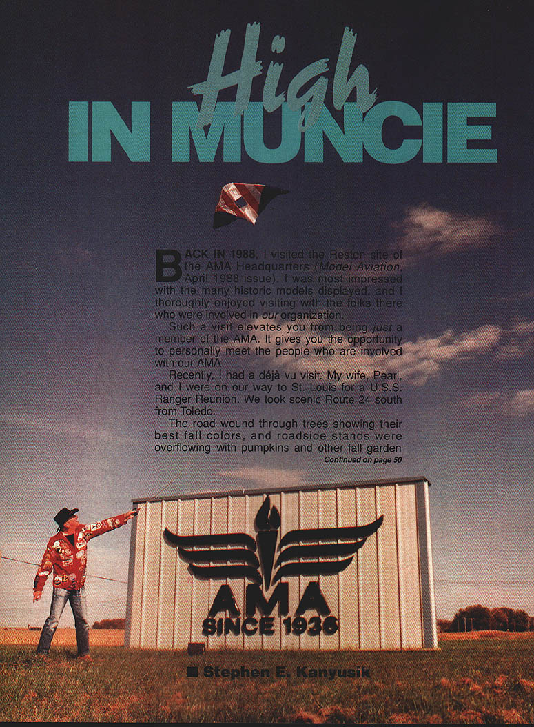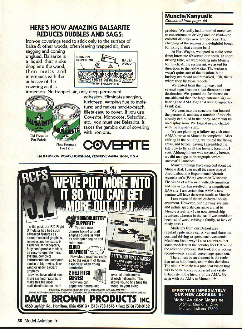 NO OCR TEXT HERES HOW AMAZING BALSARITE REDUCES BUBBLES AND SAGS Iron-on coverings tend stick surface balsa & other woods often leaving trapped air sagging coming unglued Balsarite liquid sinks deep wood melts intermixes adhesive covering ironed No trapped air deep permanent adhesion Eliminates sagging fuelcreep warping due mois ture makes hard-to-reach fillets easy cover use Coverite Monokote Solarfilm etc must use Balsarite takes gamble out covering iron-ons New Formula Film LOVERITE 420 BABYLON ROAD HORSHAM PENNSYLVANIA 19044 USA past R/C Flight Simulator has such advanced features smooth colorful graphics runways helipads 9 airplanes 8 helicopters fully configurable models easy-to-operate menu system complete instrumentation choice high-wing lowwing glider aircraft graphics Now have added exciting features make realistic simulation ever I M SOUIUDDLASTDI SUPPORTI* can now choosefrom4aircraft engine sounds well helicopter engine d rotor sound m. New cloud graphics really ad realism flying especially doing aerobatics 2 KB] PITCH CURVES Now can adjust normal inverted pitcfl helicopter allows fine tune model liking REQUIRES IBM OR COMPATIBLE COMPUTER SYSTEM COLOR GRAPHICS CAUR AND GAME PART SOONDBLASTER OR EQAITALENT RESOIRED FOR MOOT SOARD PEATORES SOUNDBLASTER IS UROISTERES TRADEMARK UP CREATIVE LABS INC DAVE BROWN PRODUCTS INC 4560 Layhigh Rd Hamilton Ohio 45013 738-1576 513 738-0152 MuncielKanyusik Continued page 48 produce really remind ourselves concentrate driving roadthe colorful displays peak changing seasons delightful bonus living climate belt Fort Wayne opted make some time Interstate 69 served needs short driving time tooling Muncie lunch restaurant asked directions AMA site waitress wasnt quite sure location busboy overheard remarked Oh thats fly models exited highway several signs became silent directors destination spotted farmhouse side large entrance sign bearing AMA logo designed Frank Zaic went structure housed personnel saw number models already exhibited lobby will display soon logged chatted friendly staff planning follow-up visit once AMAs move Muncie completed After visiting building toured flying areas before leaving assembled kite try fly historic locations visit Although no steady breeze did manage photograph several successful launches rumblings have emerged about Muncie deal can recall same type discord about Experimental Aircraft Associations BAA venture Wisconsin vision few men determination conviction has resulted magnificent BAA site am certain AMAs new venture will have same results Muncie am aware miles-from-the-site argument However highway systems airline specials can make visit Muncie reality can now attend ship reunions whereas past unable because work raising family lack ready cash Modelers Detroit area regularly pile car van share cost driving spend such weekends Modelers find way also am aware some modelers country feel left out selection process look voting recordonly small percentage speak out must element ranks takes hold leads makes decisions site Muncie practical vision will become very successful estab lished site history AMA Get high AMA Muncie odel Aviation BALSARITE