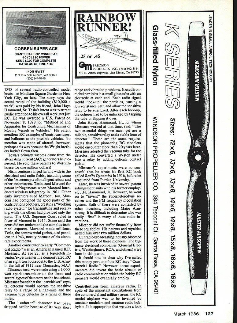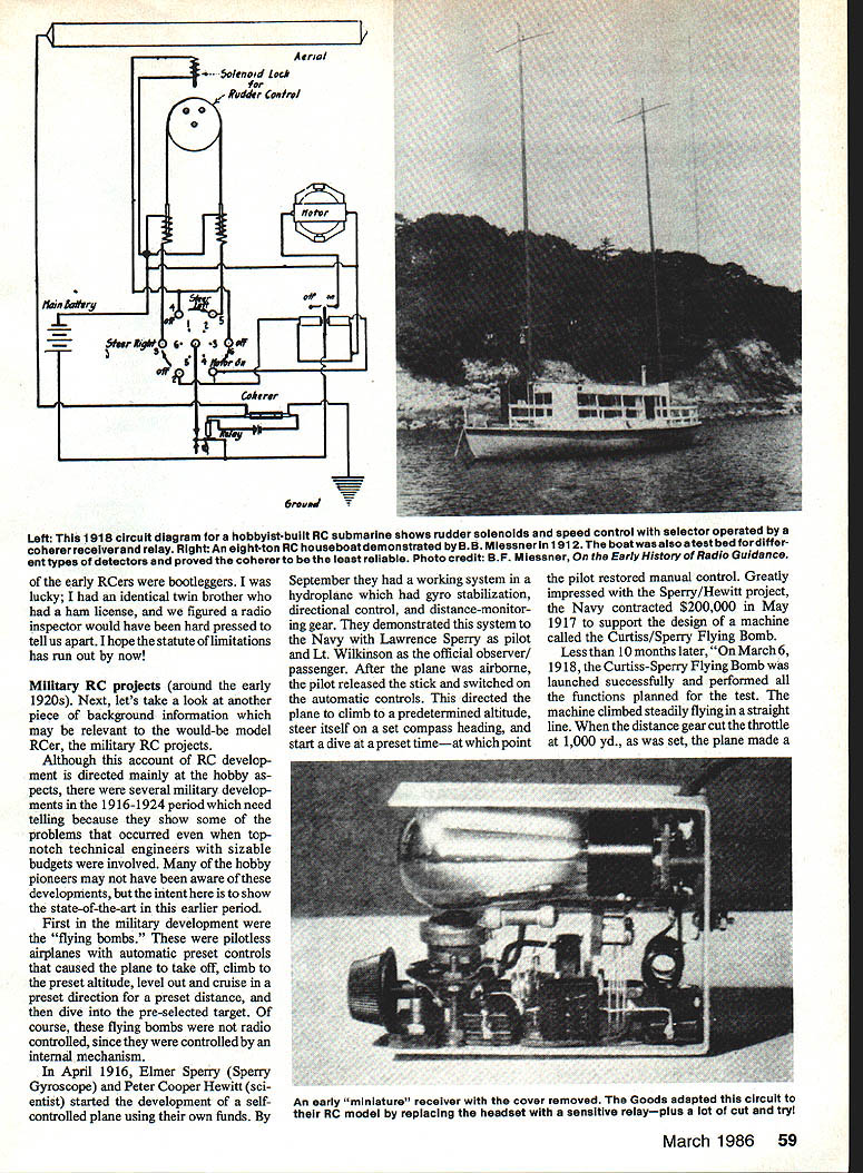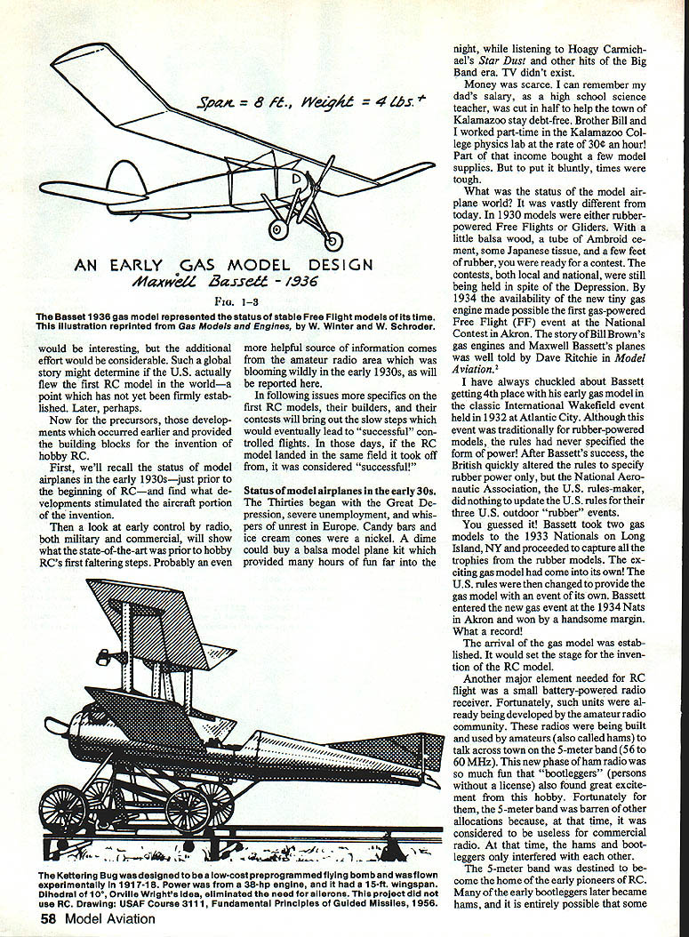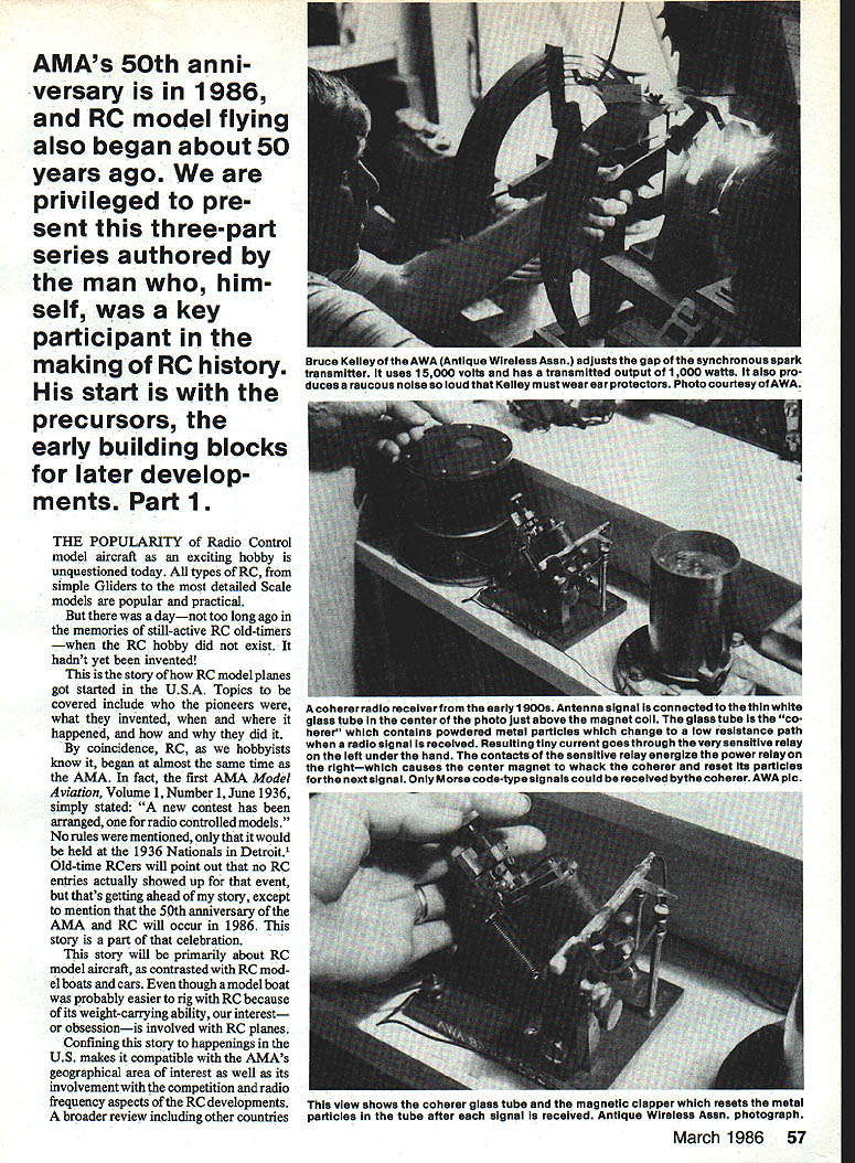 The Curtiss/Sperry Flying Bomb 191 7-1 8 Specified weigh 500 lb empty carry 81000-lb explosive ioad top speed 90 mph have range 50 miies itwas iaunched March 6 1918 foiiowed its fiight program forthe preset 1000 yards As resuit ciaimed be. first entirely auccessfui fiight automatic missiie country world Note ternaily preprogrammed fiight did invoive RC first step aiternative controi fiight US Navy photo #USN651 991 alt Good IJHist5ryofRC Flying Navy N-9 seaplane succeasfullyflown RC September 151924 Dahigren VA Navy Lt JJ Bailentine ofticerdirectiy belowthe propeller hub right Mr C B Mirick designerof radio control system second man Balientines left CC Middiebrook father RCerCarlton Middiebrookof Middiebrook Connection Photo courtesy Naval Surface Weapons Center AMAs 50th anni versary 1986 RC model flying also began about 50 years ago privileged pre sent three-part series authored man him self key participant making RC history start precursors early building blocks later develop ments Part 1 THE POPULARITY Radio Control model aircraft exciting hobby unquestioned today types RC simple Gliders detailed Scale models popular practical daynot too long ago memories still-active RC old-timers RC hobby did exist hadnt yet invented story RC model planes got started USA Topics covered include pioneers what invented happened did coincidence RC hobbyists know began almost same time AMA fact first AMA Model Aviation Volume 1Number 1June 1936 simply stated new contest has arranged radio controlled models No rules mentioned would held 1936 Nationals Detroit Old-time RCers will point out no RC entries actually showed up event thats getting ahead story except mention 50th anniversary AMA RC will occur 1986 story part celebration story will primarily about RC model aircraft contrasted RC mod el boats cars though model boat probably easier rig RC because its weight-carrying ability interest obsessionis involved RC planes Confining story happenings US makes compatible AMAs geographical area interest well its involvement competition radio frequency aspects RC developments broader review including other countries coherer radio receiver eariy 19008 Antenna signai connected thin white giass tube center photo just above magnet coii giass tube lathe co herer contains powdered metal particles change low resistance path radio signal received Resulting tiny current goes through very sensitive relay left under hand contacts sensitive relay energize power relay rightwhich causes center magnet whack coherer reset its particles forthe next signal Only Morse code-type signals couid received bythe coherer AWA plc view shows coherer glass tube magnetic clapper resets metal particles tube after signal received Antique Wireless Asan photograph March 1986 57 Bruce Kelley AWA Antique Wireless Asan adjusts gap synchronous spark transmitter uses 15000 volts has transmitted output 1000 watts also pro duces raucous noise ioud Keiley must wear ear protectors Photo courtesyofAWA Soa~ kle4A1 s D ~I----AN EARLY GAS MODEL 41axwll Basse 1936 DESIGN Fzu 13 Basset 1936 gas model represented status stable Free Flight models its time illustration reprinted Gas Models Engines W Winter W Schroder would interesting additional effort would considerable Such global story might determine US actually flew first RC model worlda point has yet firmly estab lished Later perhaps Now precursors develop ments occurred earlier provided building blocks invention hobby RC First well recall status model airplanes early 1930sjust prior beginning RCand find what de velopments stimulated aircraft portion invention look early control radio both military commercial will show what state-of-the-art prior hobby RCs first faltering steps Probably helpful source information comes amateur radio area blooming wildly early 1930s will reported following issues specifics first RC models builders contests will bring out slow steps would eventually lead successful con trolled flights days RC model landed same field took off considered successful Status model airplanes early 30s Thirties began Great De pression severe unemployment whis pers unrest Europe Candy bars ice cream cones nickel dime could buy balsa model plane kit provided hours fun far night listening Hoagy Carmich aels Star Dust other hits Big Band era TV didnt exist Money scarce can remember dads salary high school science teacher cut half help town Kalamazoo stay debt-free Brother Bill worked part-time Kalamazoo Col lege physics lab rate 304 hour Part income bought few model supplies put bluntly times tough What status model air plane world vastly different today 1930 models either rubberpowered Free Flights Gliders little balsa wood tube Ambroid ce ment some Japanese tissue few feet rubber ready contest contests both local national still being held spite Depression 1934 availability new tiny gas engine made possible first gas-powered Free Flight FF event National Contest Akron story ofBill Browns gas engines Maxwell Bassetts planes well told Dave Ritchie Model Aviation2 have always chuckled about Bassett getting 4th place early gas model classic International Wakefield event held 1932 Atlantic City Although event traditionally rubber-powered models rules never specified form power After Bassetts success British quickly altered rules specif rubber power National Aero nautic Association US rules-maker did nothing update US rules three US outdoor rubber events guessed Bassett took two gas models 1933 Nationals Long Island NY proceeded capture trophies rubber models ex citing gas model come its own US rules changed provide gas model event its own Bassett entered new gas event 1934 Nats Akron won handsome margin What record arrival gas model estab lished would set stage inven tion RC model Another major element needed RC flight small battery-powered radio receiver Fortunately such units al ready being developed amateur radio community radios being built used amateurs also called hanis talk across town 5-meter band 5