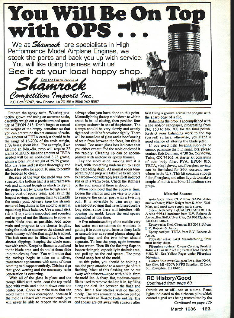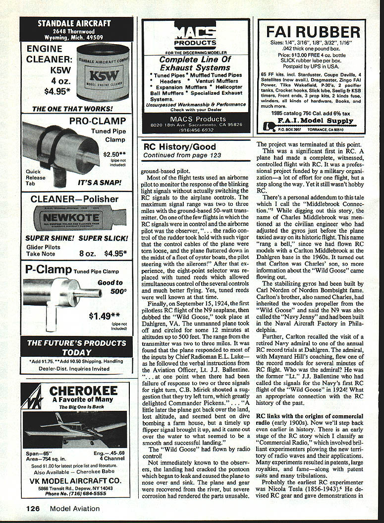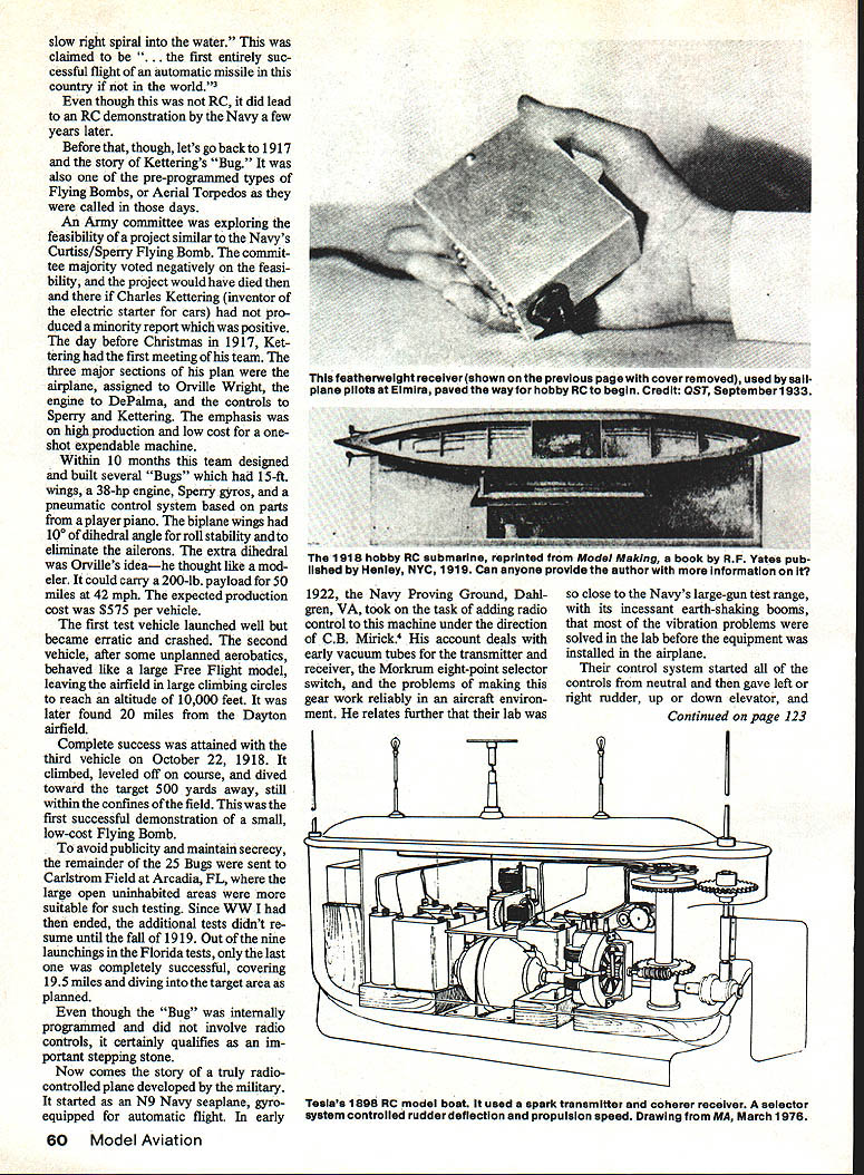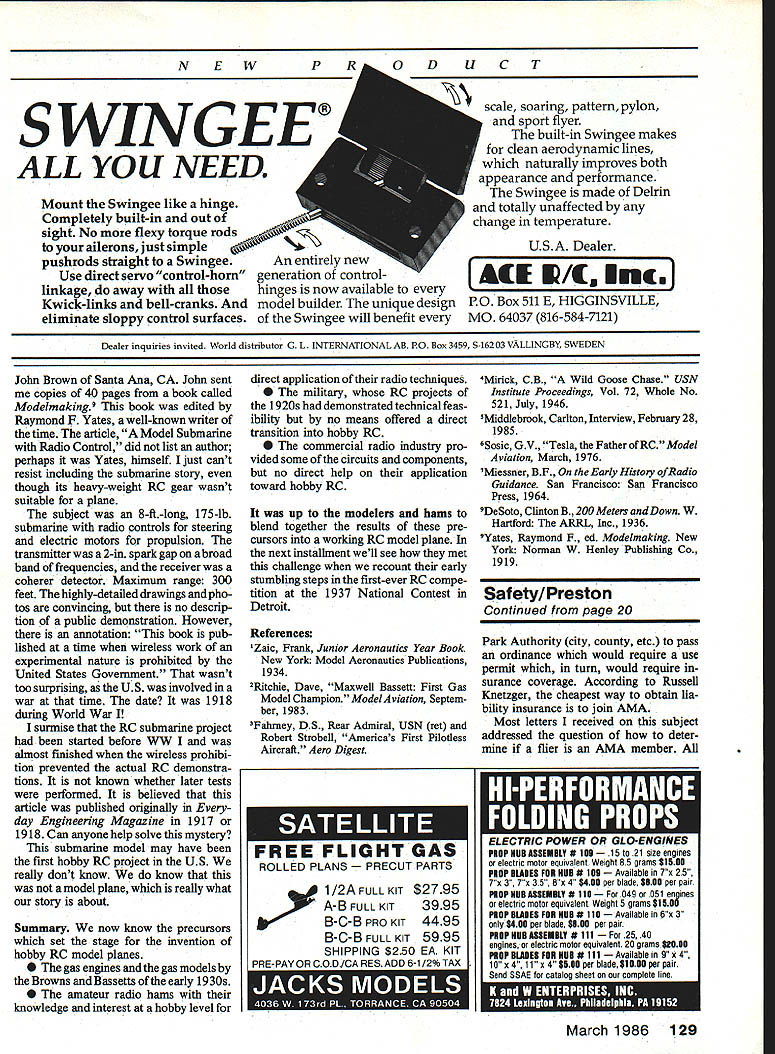 The Curtiss/Sperry Flying Bomb 191 7-1 8 Specified weigh 500 lb empty carry 81000-lb explosive ioad top speed 90 mph have range 50 miies itwas iaunched March 6 1918 foiiowed its fiight program forthe preset 1000 yards As resuit ciaimed be. first entirely auccessfui fiight automatic missiie country world Note ternaily preprogrammed fiight did invoive RC first step aiternative controi fiight US Navy photo #USN651 991 alt Good IJHist5ryofRC Flying Navy N-9 seaplane succeasfullyflown RC September 151924 Dahigren VA Navy Lt JJ Bailentine ofticerdirectiy belowthe propeller hub right Mr C B Mirick designerof radio control system second man Balientines left CC Middiebrook father RCerCarlton Middiebrookof Middiebrook Connection Photo courtesy Naval Surface Weapons Center AMAs 50th anni versary 1986 RC model flying also began about 50 years ago privileged pre sent three-part series authored man him self key participant making RC history start precursors early building blocks later develop ments Part 1 THE POPULARITY Radio Control model aircraft exciting hobby unquestioned today types RC simple Gliders detailed Scale models popular practical daynot too long ago memories still-active RC old-timers RC hobby did exist hadnt yet invented story RC model planes got started USA Topics covered include pioneers what invented happened did coincidence RC hobbyists know began almost same time AMA fact first AMA Model Aviation Volume 1Number 1June 1936 simply stated new contest has arranged radio controlled models No rules mentioned would held 1936 Nationals Detroit Old-time RCers will point out no RC entries actually showed up event thats getting ahead story except mention 50th anniversary AMA RC will occur 1986 story part celebration story will primarily about RC model aircraft contrasted RC mod el boats cars though model boat probably easier rig RC because its weight-carrying ability interest obsessionis involved RC planes Confining story happenings US makes compatible AMAs geographical area interest well its involvement competition radio frequency aspects RC developments broader review including other countries coherer radio receiver eariy 19008 Antenna signai connected thin white giass tube center photo just above magnet coii giass tube lathe co herer contains powdered metal particles change low resistance path radio signal received Resulting tiny current goes through very sensitive relay left under hand contacts sensitive relay energize power relay rightwhich causes center magnet whack coherer reset its particles forthe next signal Only Morse code-type signals couid received bythe coherer AWA plc view shows coherer glass tube magnetic clapper resets metal particles tube after signal received Antique Wireless Asan photograph March 1986 57 Bruce Kelley AWA Antique Wireless Asan adjusts gap synchronous spark transmitter uses 15000 volts has transmitted output 1000 watts also pro duces raucous noise ioud Keiley must wear ear protectors Photo courtesyofAWA Soa~ kle4A1 s D ~I----AN EARLY GAS MODEL 41axwll Basse 1936 DESIGN Fzu 13 Basset 1936 gas model represented status stable Free Flight models its time illustration reprinted Gas Models Engines W Winter W Schroder would interesting additional effort would considerable Such global story might determine US actually flew first RC model worlda point has yet firmly estab lished Later perhaps Now precursors develop ments occurred earlier provided building blocks invention hobby RC First well recall status model airplanes early 1930sjust prior beginning RCand find what de velopments stimulated aircraft portion invention look early control radio both military commercial will show what state-of-the-art prior hobby RCs first faltering steps Probably helpful source information comes amateur radio area blooming wildly early 1930s will reported following issues specifics first RC models builders contests will bring out slow steps would eventually lead successful con trolled flights days RC model landed same field took off considered successful Status model airplanes early 30s Thirties began Great De pression severe unemployment whis pers unrest Europe Candy bars ice cream cones nickel dime could buy balsa model plane kit provided hours fun far night listening Hoagy Carmich aels Star Dust other hits Big Band era TV didnt exist Money scarce can remember dads salary high school science teacher cut half help town Kalamazoo stay debt-free Brother Bill worked part-time Kalamazoo Col lege physics lab rate 304 hour Part income bought few model supplies put bluntly times tough What status model air plane world vastly different today 1930 models either rubberpowered Free Flights Gliders little balsa wood tube Ambroid ce ment some Japanese tissue few feet rubber ready contest contests both local national still being held spite Depression 1934 availability new tiny gas engine made possible first gas-powered Free Flight FF event National Contest Akron story ofBill Browns gas engines Maxwell Bassetts planes well told Dave Ritchie Model Aviation2 have always chuckled about Bassett getting 4th place early gas model classic International Wakefield event held 1932 Atlantic City Although event traditionally rubber-powered models rules never specified form power After Bassetts success British quickly altered rules specif rubber power National Aero nautic Association US rules-maker did nothing update US rules three US outdoor rubber events guessed Bassett took two gas models 1933 Nationals Long Island NY proceeded capture trophies rubber models ex citing gas model come its own US rules changed provide gas model event its own Bassett entered new gas event 1934 Nats Akron won handsome margin What record arrival gas model estab lished would set stage inven tion RC model Another major element needed RC flight small battery-powered radio receiver Fortunately such units al ready being developed amateur radio community radios being built used amateurs also called hanis talk across town 5-meter band 5
