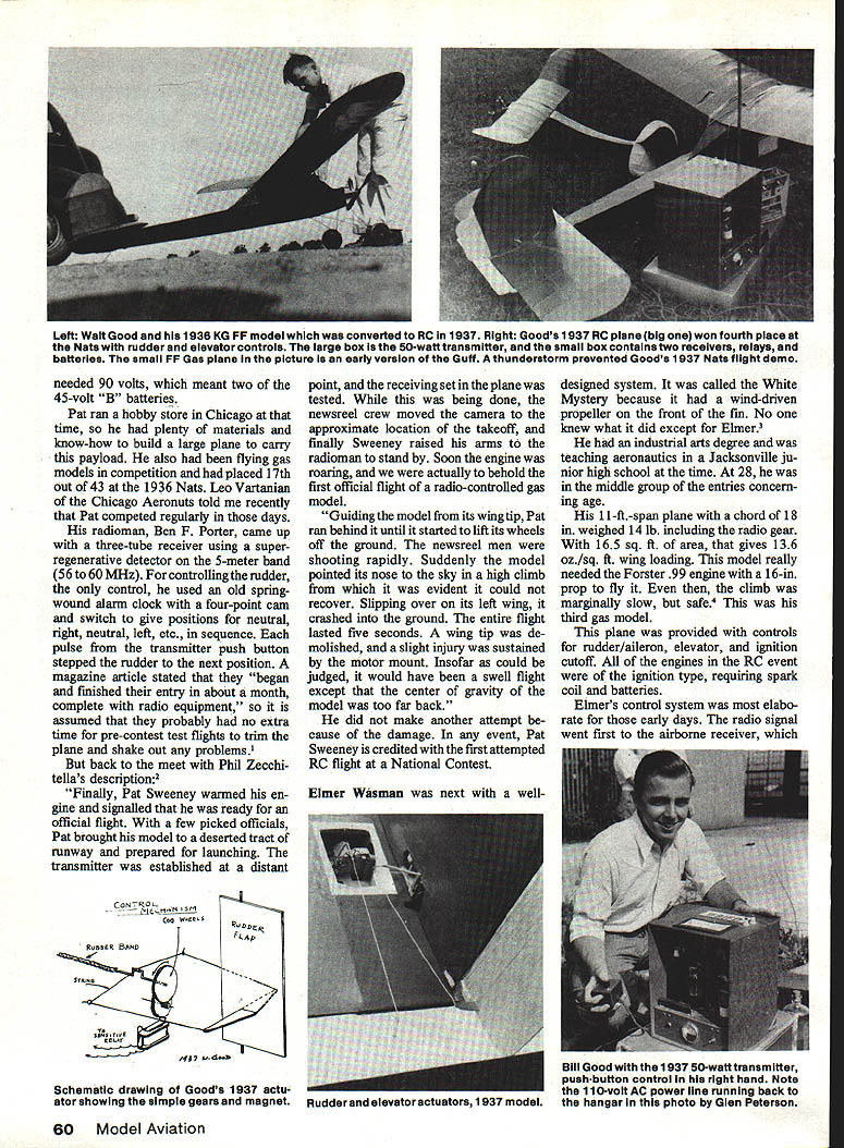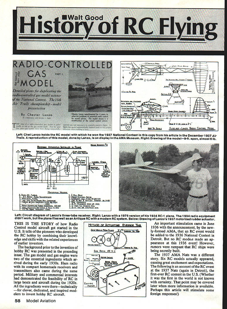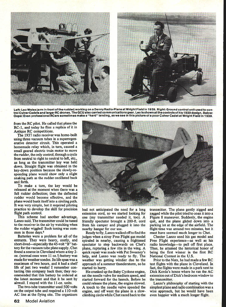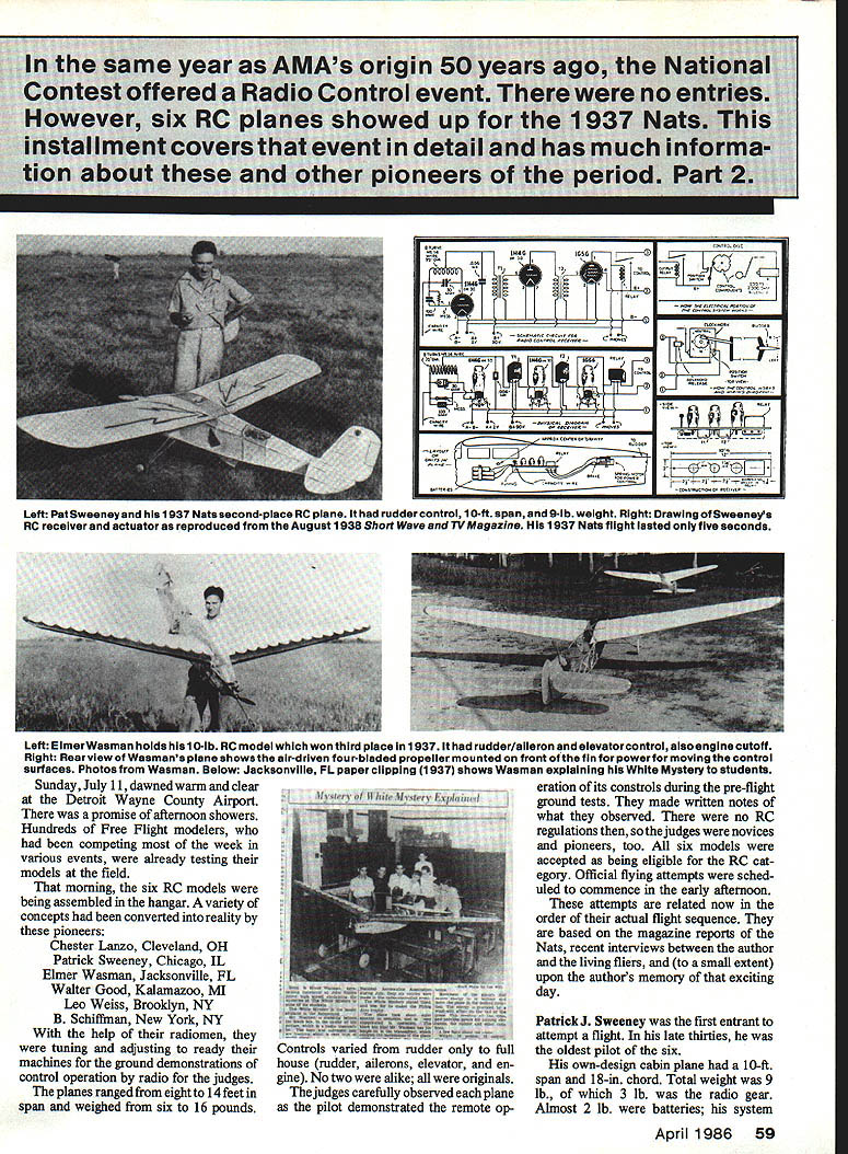&RLEru5ELAGE O RRDIO CONTROL MoML fl4 fS_________________________________________________ Left Chet Lanzo holds RC model won 1937 NatIonal Contest copy artIcle December 1937 Air Trails reproduction model done Lahzo display AMA Museum Right Drawing modelS-ft span almost 6 lb i 5- cT flozsnsL Z TRGET SWRLUN0 1NI4 CONDEN5ER 00 THIS IS THE STORY Radio Control model aircraft got started US tells pioneers developed RC hobby combining knowl edge skills related experiences earlier inventors background prior invention hobby RC presented preceding issue gas model gas engine two essential ingredients ar rived during early 193 Os Ham radio its compact homemade receivers transmitters also came during same period Military commercial interests demonstrated feasibility RC large boats aircraft during 1920s ingredients theretechnically clever dedicated inspired mod elers invent hobby RC aircraft HOOO L-XMi[ IA0LllNOALIhArhi1LWfl Left Circuit diagram Lanzos three-tube receiver Right Lanzo 1976 version 1934 RC-1 plane 1934 radio equipment didnt work butthe plane flies well Antique RC modern RC system Below Drawing Lanzos 1937 motorized rudder actuator METHOD Acmxrnis DDF TAB An important stimulation came June ____________1936 announcement new m Win. FWiw CLinicly-formed AMA RC event would added 1936 National Contest Detroit no RC models made ap pearance 1936 event However rumors rampant RC ships _____________being secretly built 1937 AMA Nats different wiREstory Six RC models actually appeared PILAY 14r L7Z]causing great excitement expectations following account RC event 1937 Nats again Detroit first-ever RC contest US Whether first world known certainty point may covered r information available Perhaps article will stimulate some foreign responses 58 Model Aviation z-D ~ imI iAxJdImmY ~.44 U Iq41-46 re p t40 Awm 1I 0 RECEIWIG APPARKrU8 INSTAUI V IN PLANic Left PatSweeneyand 1937 Nats second-place RC plane rudder control 10-ft span 9-lb weight Right Drawing Sweeneys RC receiver actuator reproduced August1938 Short Wave TV Magazine 1937 Nets flight lasted five seconds Left Elmer Wasman holds 1 0-lb RC model won third place 1937 rudder/aileron elevatorcontrol also engine cutoff Right Rear view Wasmans piano shows air-driven four-biaded propeller mounted front fin powerfor moving control surfaces Photos Wasman Below Jacksonville FL paper clipping 1937 shows Wasman explaining White Mystery students Sunday July 11 dawned warm clearerat ion its constrols during pre-flight Detroit Wayne County Airportground tests made written notes promise afternoon showerswhat observed no RC Hundreds Free Flight modelers whoregulations judges novices competing week inand pioneers too six models various events already testing theiraccepted being eligible RC catmodels fieldegory Official flying attempts sched morning six RC models wereuled commence early afternoon being assembled hangar variety attempts related now concepts converted reality byorder actual flight sequence pioneersare based magazine reports Chester Lanzo Cleveland OHNats recent interviews between author Patrick Sweeney Chicago ILand living fliers small extent Elmer Wasman Jacksonville FLupon authors memory exciting Walter Good Kalamazoo MIday Leo Weiss Brooklyn NY B Schiffinan New York NY help radiomen tuning adjusting ready machines ground demonstrations control operation radio judges planes ranged eight 14 feet span weighed six 16 pounds Patrick J Sweeney first entrant attempt flight late thirties oldest pilot six own-design cabin plane 10-ft span 18-in chord Total weight 9 lb 3 lb radio gear Almost 2 lb batteries system April 1986 59 p OO0It0MoooIJ046.IIlGGI00.4jJ o-Thi-i Controls varied rudder full house rudder ailerons elevator en gine No two alike originals judges carefully observed plane pilot demonstrated remote op Left Wait Good 1936KG FF model converted RC 1937 RIght Goods 1937 RC plane big won fourth place Nats rudder elevator controls large box 50-watt transmitter email box contains two receivers relays batteries small FF Gas plane picture early version Guff thunderstorm prevented Goods 1937 Nats flight demo needed 90 volts meant two 45-volt B batteries Pat ran hobby store Chicago time plenty materials know-how build large plane carry payload also flying gas models competition placed 17th out 43 1936 Nats Leo Vartanian Chicago Aeronuts told recently Pat competed regularly days radioman Ben F Porter came up three-tube receiver using superregenerative detector 5-meter band 56 60 MHz controlling rudder control used old springwound alarm clock four-point cam switch give positions neutral right neutral left etc sequence pulse transmitter push button stepped rudder next position magazine article stated began finished entry about month complete radio equipment assumed probably no extra time pre-contest test flights trim plane shake out problems1 back meet Phil Zecchi tellas description2 Finally Pat Sweeney warmed en gine signalled ready official flight few picked officials Pat brought model deserted tract runway prepared launching transmitter established distant Schematic drawing Goods 1937 actu ator showing simple gears magnet point receiving set plane tested being done newsreel crew moved camera approximate location takeoff finally Sweeney raised arms radioman stand Soon engine roaring actually behold first official flight radio-controlled gas model Guiding model its wingtip Pat ran behind until started lift its wheels off ground newsreel men shooting rapidly Suddenly model pointed its nose sky high climb evident could recover Slipping over its left wing crashed ground entire flight lasted five seconds wing tip de molished slight injury sustained motor mount Insofar could judged would have swell flight except center gravity model too far back did make another attempt cause damage event Pat Sweeney credited first attempted RC flight National Contest Elmer Wasman next welldesigned system called White Mystery because wind-driven propeller front fin No knew what 