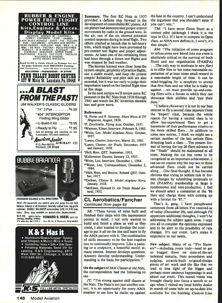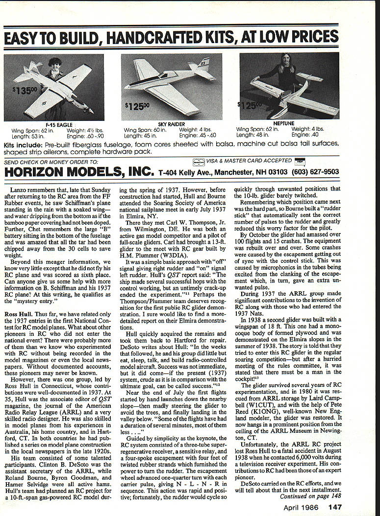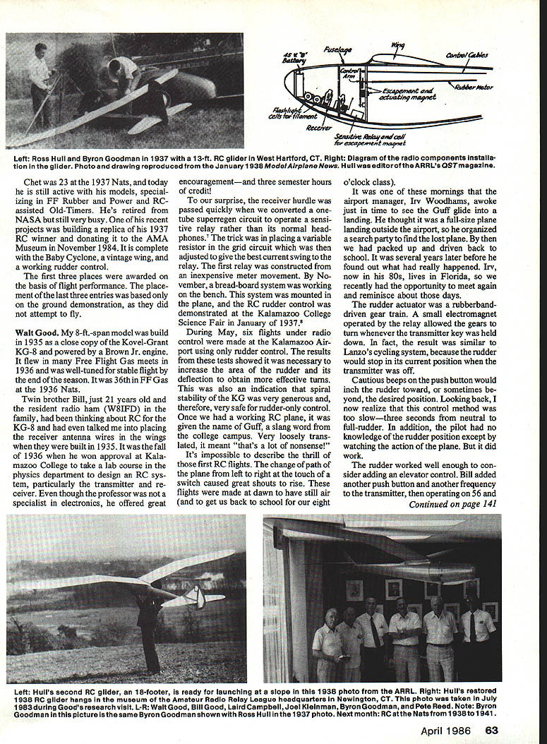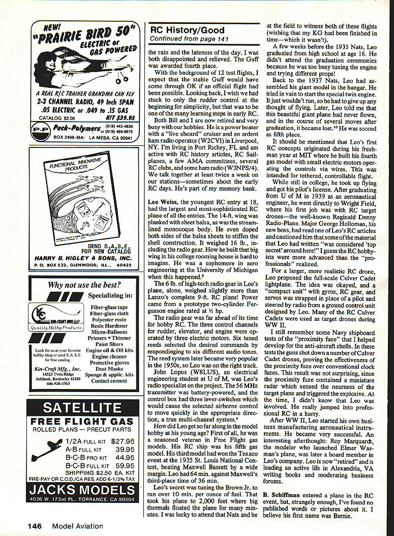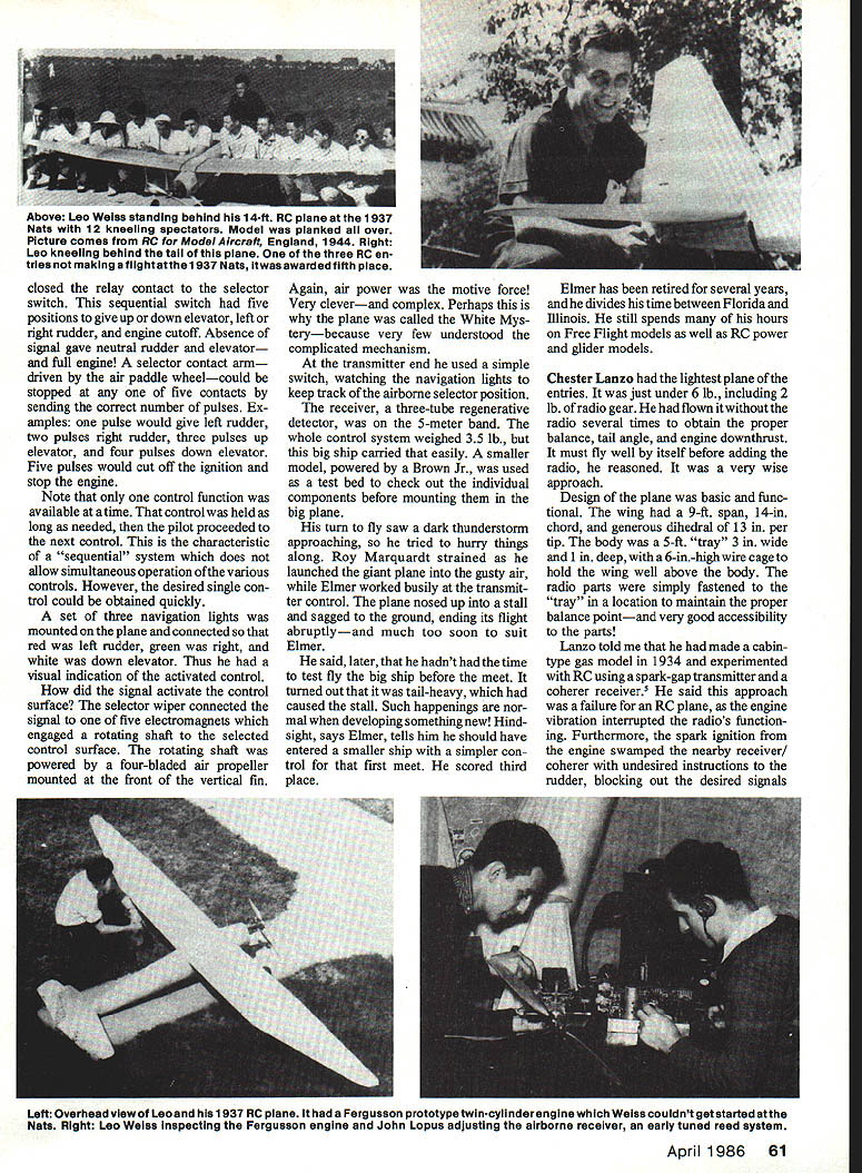 &RLEru5ELAGE O RRDIO CONTROL MoML fl4 fS_________________________________________________ Left Chet Lanzo holds RC model won 1937 NatIonal Contest copy artIcle December 1937 Air Trails reproduction model done Lahzo display AMA Museum Right Drawing modelS-ft span almost 6 lb i 5- cT flozsnsL Z TRGET SWRLUN0 1NI4 CONDEN5ER 00 THIS IS THE STORY Radio Control model aircraft got started US tells pioneers developed RC hobby combining knowl edge skills related experiences earlier inventors background prior invention hobby RC presented preceding issue gas model gas engine two essential ingredients ar rived during early 193 Os Ham radio its compact homemade receivers transmitters also came during same period Military commercial interests demonstrated feasibility RC large boats aircraft during 1920s ingredients theretechnically clever dedicated inspired mod elers invent hobby RC aircraft HOOO L-XMi[ IA0LllNOALIhArhi1LWfl Left Circuit diagram Lanzos three-tube receiver Right Lanzo 1976 version 1934 RC-1 plane 1934 radio equipment didnt work butthe plane flies well Antique RC modern RC system Below Drawing Lanzos 1937 motorized rudder actuator METHOD Acmxrnis DDF TAB An important stimulation came June ____________1936 announcement new m Win. FWiw CLinicly-formed AMA RC event would added 1936 National Contest Detroit no RC models made ap pearance 1936 event However rumors rampant RC ships _____________being secretly built 1937 AMA Nats different wiREstory Six RC models actually appeared PILAY 14r L7Z]causing great excitement expectations following account RC event 1937 Nats again Detroit first-ever RC contest US Whether first world known certainty point may covered r information available Perhaps article will stimulate some foreign responses 58 Model Aviation z-D ~ imI iAxJdImmY ~.44 U Iq41-46 re p t40 Awm 1I 0 RECEIWIG APPARKrU8 INSTAUI V IN PLANic Left PatSweeneyand 1937 Nats second-place RC plane rudder control 10-ft span 9-lb weight Right Drawing Sweeneys RC receiver actuator reproduced August1938 Short Wave TV Magazine 1937 Nets flight lasted five seconds Left Elmer Wasman holds 1 0-lb RC model won third place 1937 rudder/aileron elevatorcontrol also engine cutoff Right Rear view Wasmans piano shows air-driven four-biaded propeller mounted front fin powerfor moving control surfaces Photos Wasman Below Jacksonville FL paper clipping 1937 shows Wasman explaining White Mystery students Sunday July 11 dawned warm clearerat ion its constrols during pre-flight Detroit Wayne County Airportground tests made written notes promise afternoon showerswhat observed no RC Hundreds Free Flight modelers whoregulations judges novices competing week inand pioneers too six models various events already testing theiraccepted being eligible RC catmodels fieldegory Official flying attempts sched morning six RC models wereuled commence early afternoon being assembled hangar variety attempts related now concepts converted reality byorder actual flight sequence pioneersare based magazine reports Chester Lanzo Cleveland OHNats recent interviews between author Patrick Sweeney Chicago ILand living fliers small extent Elmer Wasman Jacksonville FLupon authors memory exciting Walter Good Kalamazoo MIday Leo Weiss Brooklyn NY B Schiffinan New York NY help radiomen tuning adjusting ready machines ground demonstrations control operation radio judges planes ranged eight 14 feet span weighed six 16 pounds Patrick J Sweeney first entrant attempt flight late thirties oldest pilot six own-design cabin plane 10-ft span 18-in chord Total weight 9 lb 3 lb radio gear Almost 2 lb batteries system April 1986 59 p OO0It0MoooIJ046.IIlGGI00.4jJ o-Thi-i Controls varied rudder full house rudder ailerons elevator en gine No two alike originals judges carefully observed plane pilot demonstrated remote op Left Wait Good 1936KG FF model converted RC 1937 RIght Goods 1937 RC plane big won fourth place Nats rudder elevator controls large box 50-watt transmitter email box contains two receivers relays batteries small FF Gas plane picture early version Guff thunderstorm prevented Goods 1937 Nats flight demo needed 90 volts meant two 45-volt B batteries Pat ran hobby store Chicago time plenty materials know-how build large plane carry payload also flying gas models competition placed 17th out 43 1936 Nats Leo Vartanian Chicago Aeronuts told recently Pat competed regularly days radioman Ben F Porter came up three-tube receiver using superregenerative detector 5-meter band 56 60 MHz controlling rudder control used old springwound alarm clock four-point cam switch give positions neutral right neutral left etc sequence pulse transmitter push button stepped rudder next position magazine article stated began finished entry about month complete radio equipment assumed probably no extra time pre-contest test flights trim plane shake out problems1 back meet Phil Zecchi tellas description2 Finally Pat Sweeney warmed en gine signalled ready official flight few picked officials Pat brought model deserted tract runway prepared launching transmitter established distant Schematic drawing Goods 1937 actu ator showing simple gears magnet point receiving set plane tested being done newsreel crew moved camera approximate location takeoff finally Sweeney raised arms radioman stand Soon engine roaring actually behold first official flight radio-controlled gas model Guiding model its wingtip Pat ran behind until started lift its wheels off ground newsreel men shooting rapidly Suddenly model pointed its nose sky high climb evident could recover Slipping over its left wing crashed ground entire flight lasted five seconds wing tip de molished slight injury sustained motor mount Insofar could judged would have swell flight except center gravity model too far back did make another attempt cause damage event Pat Sweeney credited first attempted RC flight National Contest Elmer Wasman next welldesigned system called White Mystery because wind-driven propeller front fin No knew what 