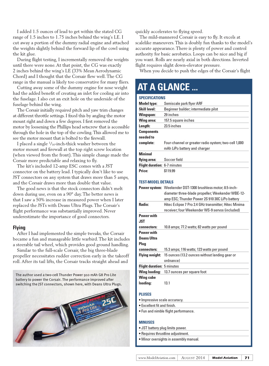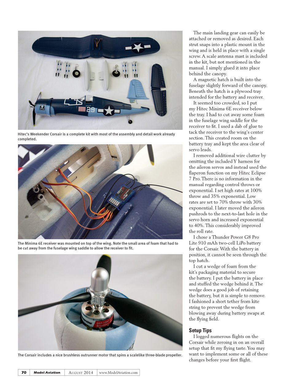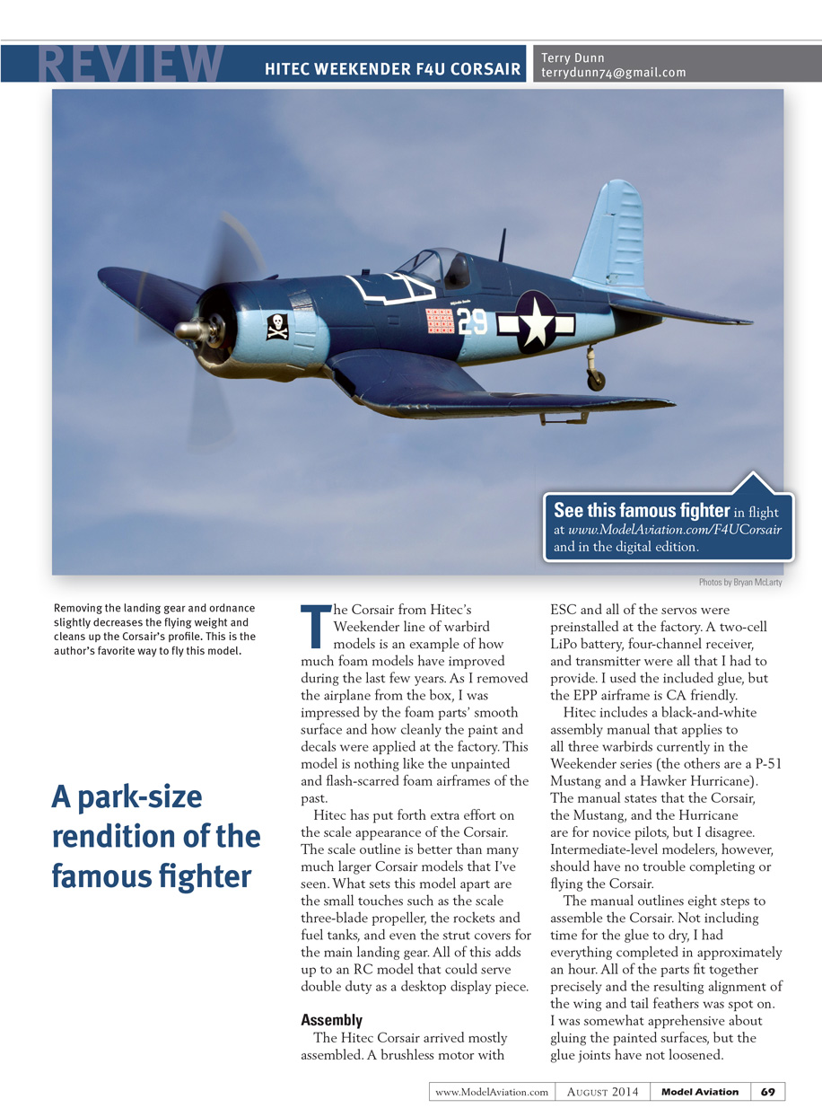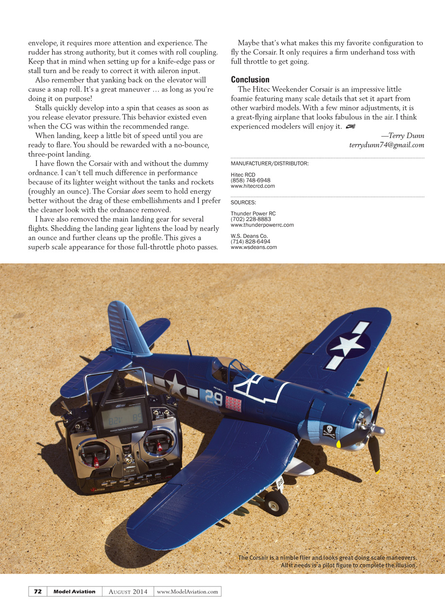The Hitec Weekender Corsair is an impressive little foamie stuffed with many scale details that set it apart from other warbird models. With just a few minor adjustments, it is a great flying airplane that looks fabulous in the air. I think experienced modelers will enjoy it.[dingbat]