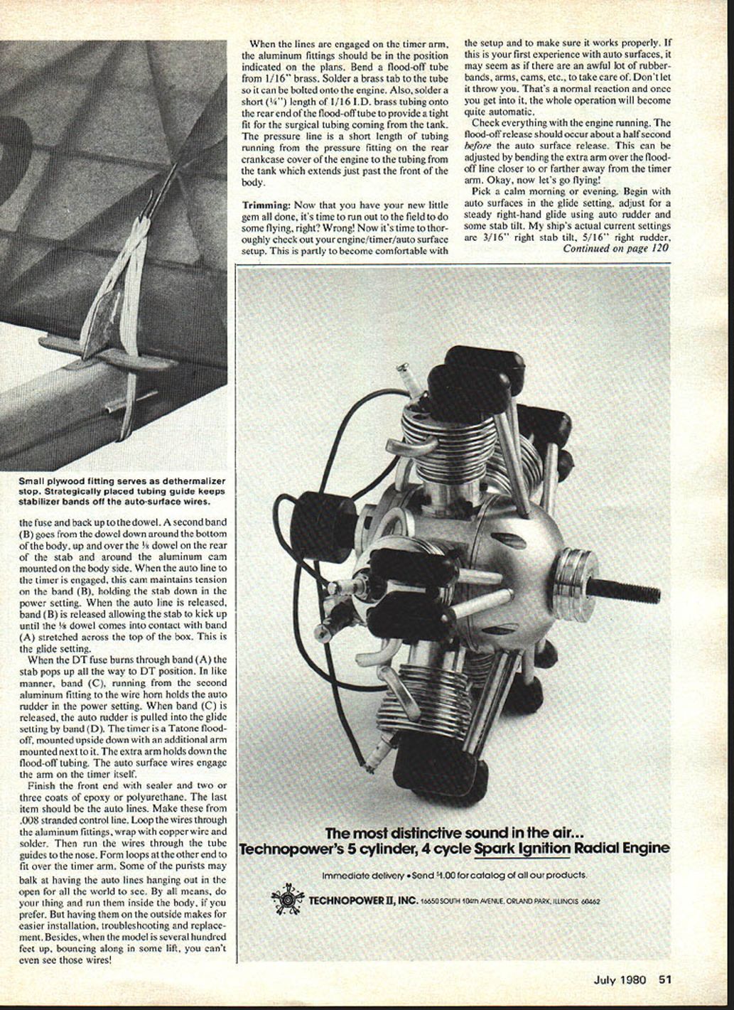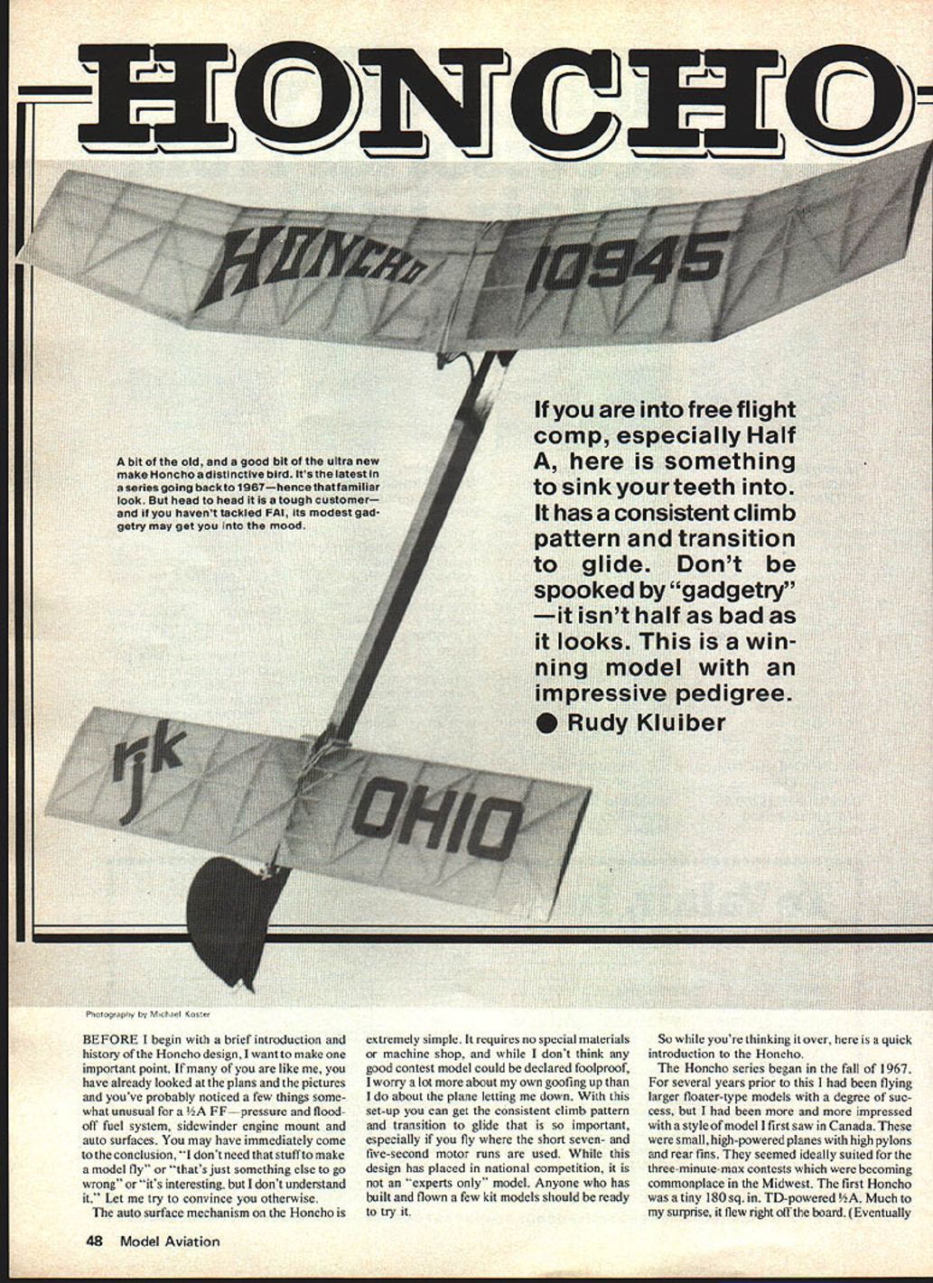 Phoo9rphy Oy BEFORE begin brief introduction history Honcho design want make important point like have already looked plans pictures youve probably noticed few things some what unusual 2A FFpressure floodoff fuel system sidewinder engine mount auto surfaces may have immediately come conclusion dont need stuff make model fly thats just something else go wrong its interesting dont understand Let try convince otherwise auto surface mechanism Honcho extremely simple requires no special materials machine shop dont think good contest model could declared foolproof worry lot about own goofing up about plane letting down set-up can get consistent climb pattern transition glide important especially fly short seven- five-second motor runs used design has placed national competition experts model Anyone has built flown few kit models should ready try So youre thinking over quick introduction Honcho Honcho series began fall 1967 several years prior flying larger floater-type models degree suc cess more impressed style model first saw Canada small high-powered planes high pylons rear fins seemed ideally suited three-minute-max contests becoming commonplace Midwest first Honcho tiny 180 sq TD-powered Much surprise flew right off board Eventually 48 Model Aviation 3132 SOYAHE SPASCE TOP B GOTTESS USE BALSA IN TIPS -1 VA WASH OUT 1 \ V7 N V63 VA U P16 TYPVA 110 m 232 SHEET SPLIT BOWEL PEYS -1/32 PLY \%LAY REACE \V6f DTYPTYP V32 TOP 2-S/A VA WASP OUT-I VP WASH IN- _________ CENTER VAR PLY TIP 232 PLY1/16 SPSH SIPESHAL MACESI 232 RLBAER REVS- CEsI POWER-I PLY 16525 REST VA VA LAHECAPAL LAYOUT 3132 GMAT --I/I6S I/Al SPRUCE SCALE TO FIT WINS \hJIIl1lIhItiCU,, VERY PUPS216 PLY ST STOP hit l5 ljI26TSP AUTTOWVl6 31Av vAOU-O RECES [v32][b-1-10-1-10]]A5O AREA IAREArAUTO SURFACE WARES VA B ~74 SB SABPLSOA SPARS 31MMACC 3132ALLSA TAMA IBAUUPI-lAP PLY 35165 80*23PYLON TO HEREFI *P-ABA SIPASPES CA ERE LOP BM- UPEES15 136 SEPSlAB BE MASS SSBERA2SPYLBSAPESAPR MASS ASPEYREST ~.- [ZIVXZZ2ZSABREYBSE UPPERBOTTOMOLEWpp~ TARE RETAIL26 PLY STAB PERFECT MAPLE MO CAR MOUSTS BOTTOM BlEW VP SPARSE MESS PAStAS PAl SIPPLY ABTA EPEPY ALLEY RASPER SYPAS NA SUALE ALAS SAP tZZZii!I77ZZZ32VAR SLY SPRY VA TSP 16BATTOW26SY IREWY LiflIZZ 2-SB S/AC SPIT 216 AAPRL ALABI TARE 232 TIPAPRS PLY WPPRES 6 PLY rziIZIZIIIIIZixx11PR SABLESUR-SLY ILIThLARL PEW eyI] 032 ALUPS PITYPABS ALL MATERIAL BALSA EXCEPT AS NOTES VP 3/AI/A DOWELVA SHEET232 TYP216 ISP RIPS HONCHO 1/2 COMPETITION DESIGN DESGNED B DRAWN BY Rd KLUIBER TRACING BY JOE DEMARCO AA--1j\fwJ VP OUPEL 2S2PL1BA yBS SiRE co C%I w CD 4 0 w w Cd w -J 4 -J 4 ci z 4 -J 0 w N C0 -j -J proved too small consistency needed successful contest flying 400 sq TD-15powered ship scaled up /3A model placed second 1969 Nats Phila delphia Since Honcho has built sizes classes 02 payload Class C has continued well including first B several other places various Nats As recently 1978 Nats Lake Charles LA Honchos placed third hA third Auto surfaces added ships starting 1970 Once again can thank Canadian friends original auto serface arrangement although have made some modifi cations Likewise Honcho design has changed over years although basic layout remains much same use particular engine/auto surface set-up requires TD 049 KirnKraft needle valve assembly pressurized backplate preferably enlarged venturi items may available through local hobby shops can obtain Joe Klause Kustom Kraftsmanship may also want look line completely reworked TD engines have used some time may set back few dollars really worthwhile investment engine will easier tune stands gain some power well end article list several sources competition items may want try Construction Wing Stab relatively straight forward structure should present problems however few particulars would like cover especially may have built wing stab using diagonal union-jack type construction regard wing make spar notches ribs main panels prior construction Glue diagonal ribs tip ribs notches cut notches time razor straightedge using plan July 1980 49 3/32 PANG TIP VA SQUARE 3/32 ASS PLY MAPUES 216 SQUARE3 Left In glide mode stabilizer up rudder right after cams released Right power mode stabilizer down rudder left held bands aluminum cams Once trimmed Honcho requires no attention average contest ship notches main panel ribs guide Also note full depth braces wing joints also 1/32 sheet web between top bottom main spars also think much better build washout washin wing panels very beginning rather attempting twist doping using steam same basic procedure holds true stab Notch straight ribs prior con struction cut notches diagonals after glued place may seem tedious process will make much accurate construction really easier long run will probably help make some practice notches scrap wood order insure good fit spars Cover wing stab good grade Japanese tissue After covering before doping mount various keys hooks etc wing stab Mount /s dowel rear stab carving filing half-round groove trailing edge area epoxying dowel Reinforce area patch silk Give wing three four coats nitrate dope cut 50-50 Two three coats stab will Fuelproof epoxy polyurethane finish can thinned somewhat try brush very sparingly except areas likely come contact exhaust spary such bottom center wing along front stab Fuselage Essentially body profile Starduster type layout built flat its side except some variations nose area beam mounts strong easy install allow use pressurized Thackdoor essential part engine/timer auto-surface operation sequence body construction follows Pin down quarter-grain sheet 1/16 X 3 balsa body side Draw body profile sheet Glue op bottom longerons nose tail Add some s sq uprights nose supports pylon Add 1/32 X s strips longerons rear body order center sub rudder Make up pylon hard t add pruce strips top pylon Glue pylon Add second s sq longerons top bottom run rear pylon sub rudder begins Add sub rudder Add 1/32 X ps top sub rudder Add motor mounts Have engine handy point check snug fit