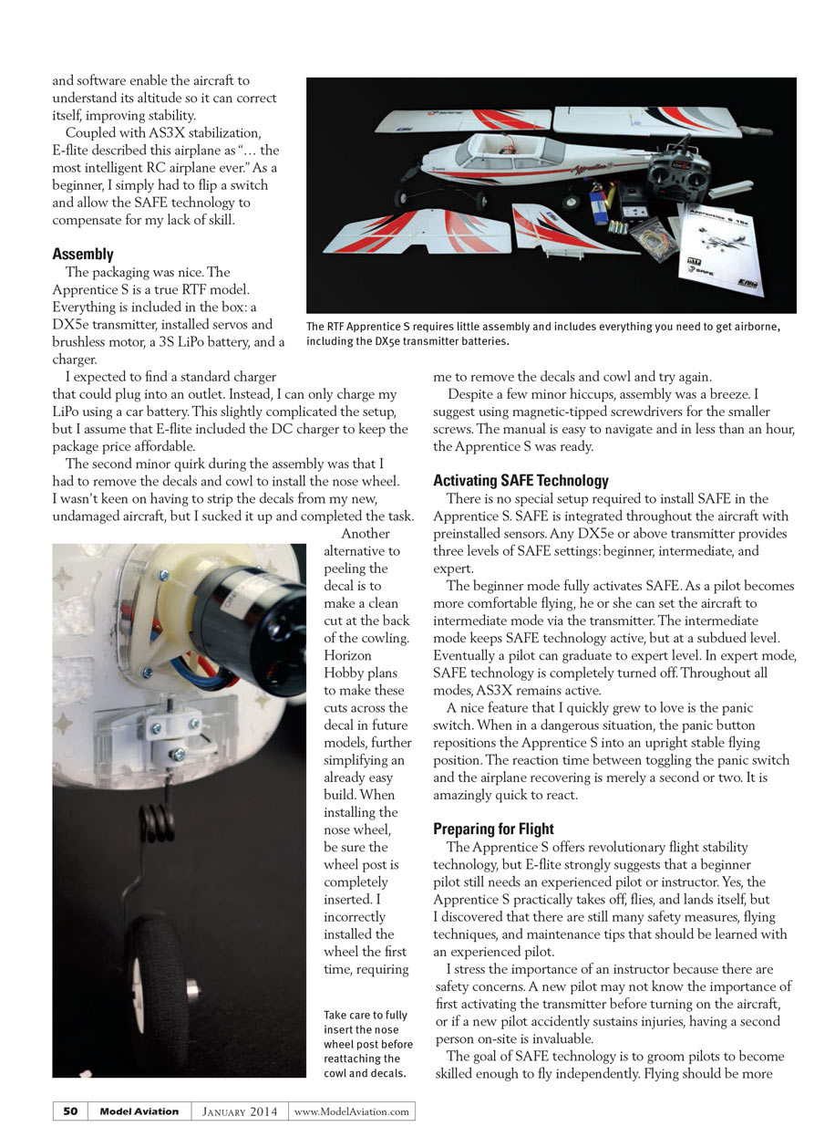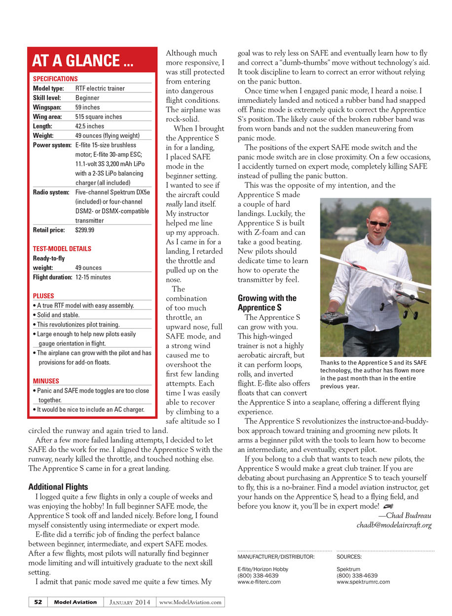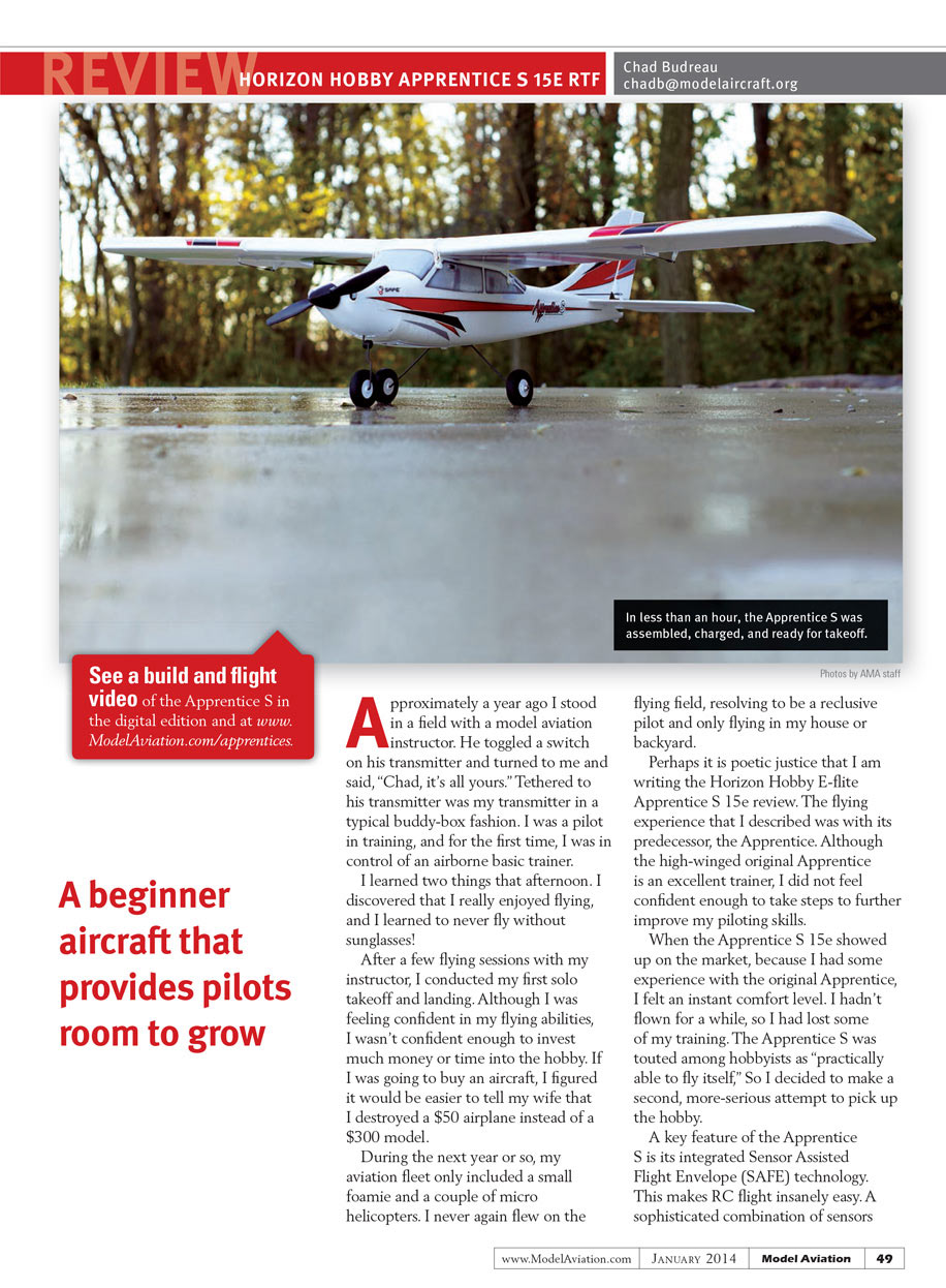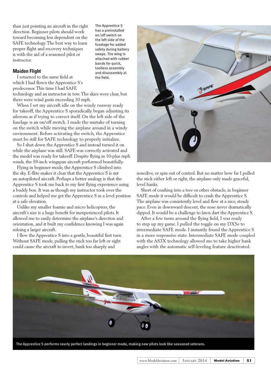 The Apprentice S offers revolutionary flight stability technology, but E-flite is quick to indicate that a beginner pilot still needs an experienced pilot or instructor. Yes, the Apprentice S practically takes off, flies, and lands itself, but I quickly learned that there are still many safety measures, flying techniques, and maintenance tips that should be learned with an experienced pilot.