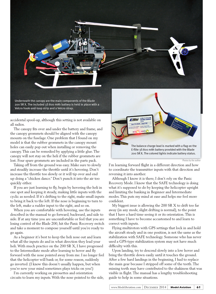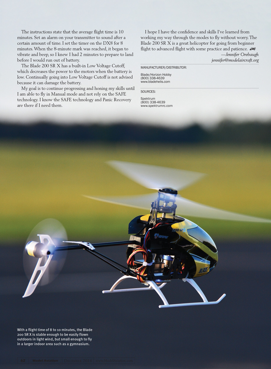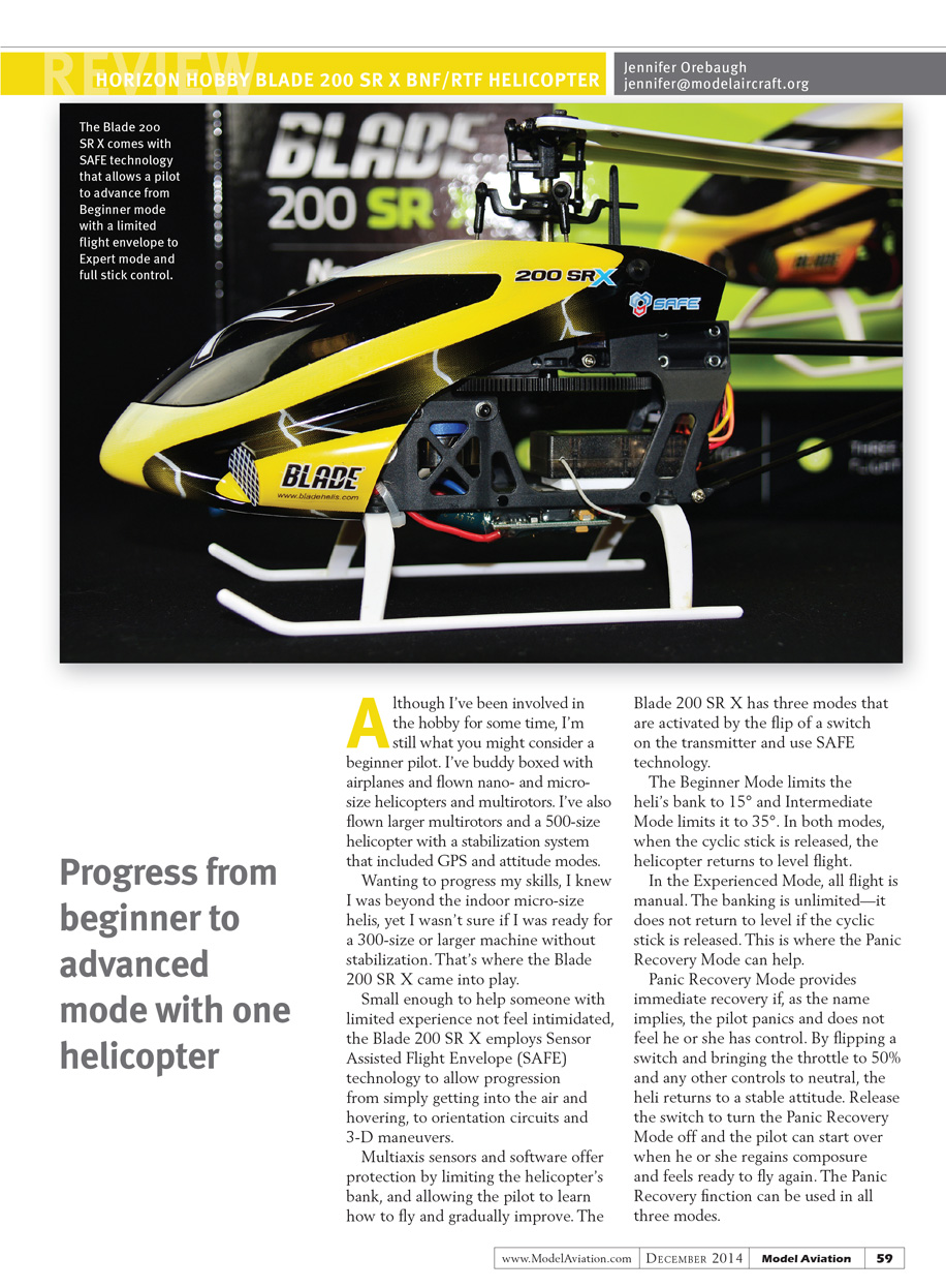 Multiaxis sensors and software offer protection by limiting the bank of the helicopter, and allowing the pilot to learn how to fly and gradually improve. The Blade 200 SR X has three modes that are activated by the flip of a switch on the transmitter and use SAFE technology.