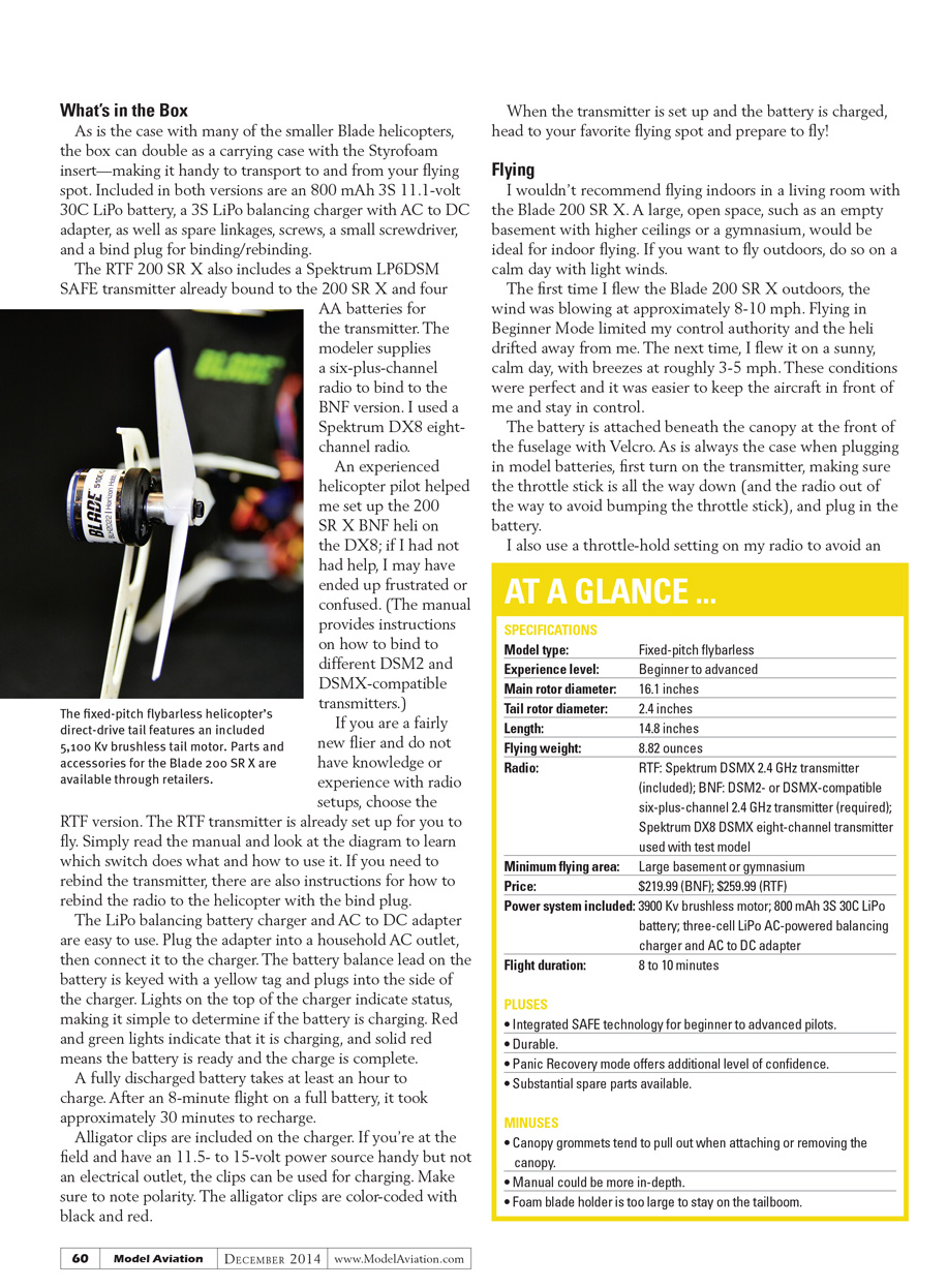 The RTF 200 SR X also includes a Spektrum LP6DSM SAFE transmitter already bound to the 200 SR X and four AA batteries for the transmitter. The modeler supplies a six-plus-channel radio to bind to the BNF version. I used a Spektrum DX8 eight-channel radio.