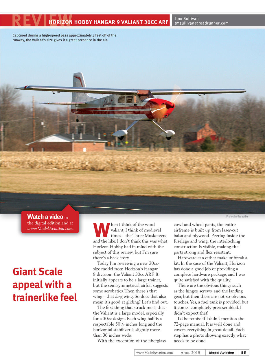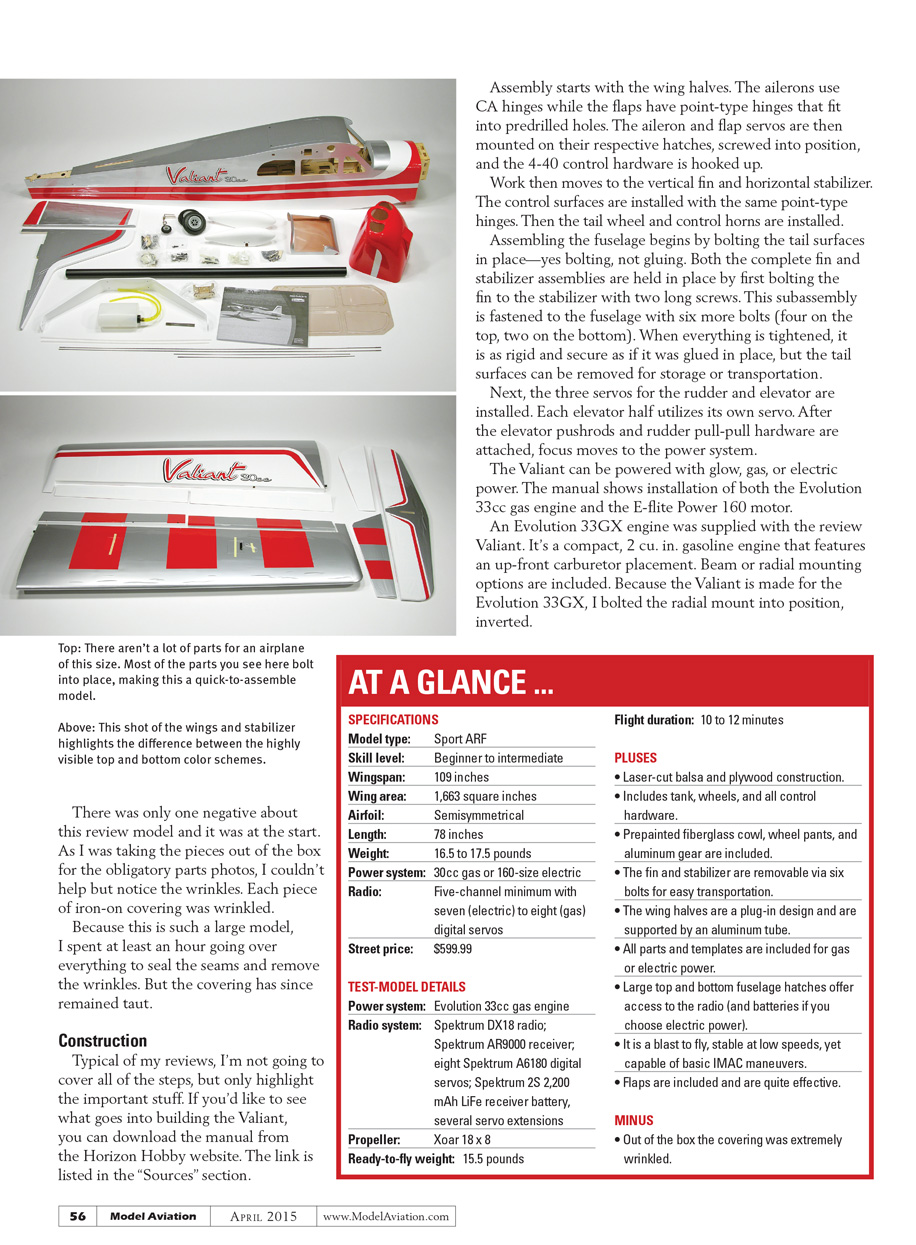 The first thing that struck me is that the Valiant is a large model, especially for a 30cc design. Each wing half is a respectable 501/2 inches long and the horizontal stabilizer is slightly more than 36 inches wide.