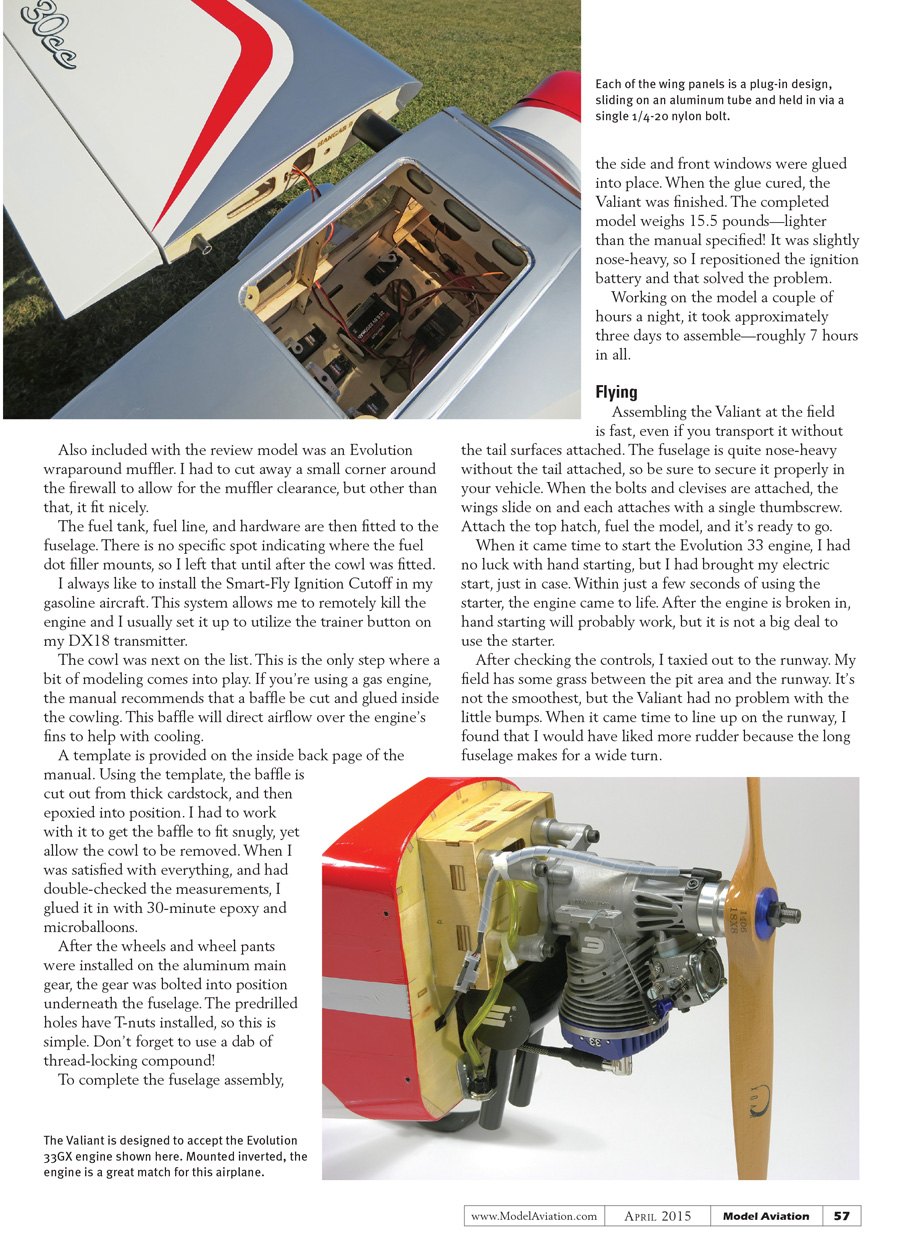 Assembling the Valiant at the field is fast, even if you transport it without the tail surfaces attached. The fuselage is quite nose-heavy without the tail attached, so be sure to secure it properly in your vehicle. When the bolts and clevises are attached, the wings slide on and attach with a single thumbscrew each. Attach the top hatch, fuel the model, and it’s ready to go.