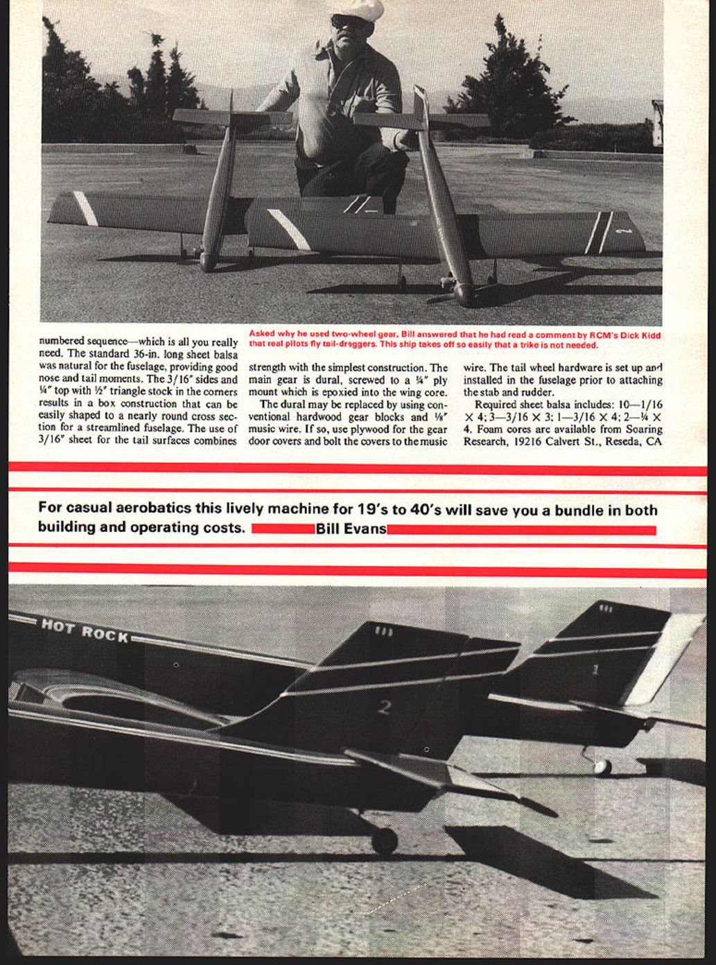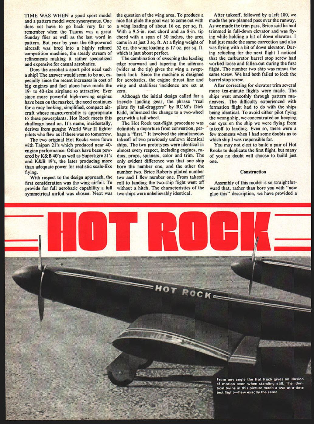 TIME WAS WHEN good sport model pattern model synonymous does have go back very far remember Taurus great Sunday flier well last word pattern year year 60-powered aircraft bred highly refined competition machine steady stream refinements making rather specialized expensive casual aerobatics Does acrobatic sport pilot need such ship answer would seem no es pecially since recent increases cost big engines fuel alone have made 19- 40-size airplane attractive Ever since powerful high-revving engines have market need continues racy looking simplified compact air craft manenverabiliy appropriate powerplants Hot Rock meets challenge head Its name incidentally derives gungho World War II fighter pilots flew no tomorrow two original Hot Rocks flown Taipan 21s produced near 40engine performance Others have pow ered K&B 40s well Supertigre 21s K&B 19s later producing adequate power realistic scale-like flying respect design approach first consideration wing airfoil provide full acrobatic capability full symmetrical airfoil chosen Next question wing area produce nice flat glide goal come out wing loading about 16 oz per sq ft 95-in root chord 8-in tip chord span 50 inches area came just 3 sq ft flying weight 52 oz wing loading 17 oz per sq ft just about perfect combination sweeping leading edge rearward tapering aikrons wider tip gives wing sweptback look Since machine designed aerobatics engine thrust line wing stabilizer incidence set zero Although initial design called tricycle landing gear phrase real pilots fly tail-draggers RCMs Dick Kidd influenced change two-wheel gear tail wheel Hot Rock test-flight procedure definitely departure convention per haps first involved simultaneous takeoff two previously unflown identical ships two prototypes identical almost respect including engines ra dios props spinners color trim evident difference ship bore number other number two Brice Roberts piloted number two flew number takeoff roll landing two-ship flight went off hitch characteristics two ships unbelievably identical After takeoff followed left 180 made pre-planned pass over runway As made trim pass Brice said trimmed full-down elevator fly ing holding bit down elevator just made same correction also flying bit down elevator Dur ing refueling next flight noticed carburetor barrel stop screw worked loose fallen out during first flight number two ship minus same screw both failed lock barrel stop screw After correcting elevator trim several ten-minute flights made ships went smoothly through pattern ma neuvers difficulty experienced formation flight ships being identical avoid either pilot flying wrong ship concentrated keeping eyes ship flying takeoff landing few moments some doubts ship responsible may elect build pair Hot Rocks duplicate first flight no doubt will choose build just Construction Assembly model straightfor ward rather bore now glue description have provided strength simplest construction main gear dural screwed mount epoxied wing core dural may replaced using con ventional hardwood gear blocks /s music wire use plywood gear door covers bolt covers music wire tail wheel hardware set up installed fuselage prior attaching stab rudder Required sheet balsa includes 10 1 / 16 X 4 33/16 X 3 13/16 X 4 2 X 4 Foam cores available Soaring Research 19216 Calvert St Reseda CA casual aerobatics lively machine 19s 40s will save bundle both building operating costsBill Asked used two-wheel gear Bill answered read comment RcMs Dick Kidd numbered sequencewhich really real pilots fly tail-draggers ship takes off easily trike needed need standard 36-in long sheet balsa natural fuselage providing good nose tail moments 3/16 sides triangle stock corners results box construction can easily shaped nearly round cross sec tion streamlined fuselage use 3/16 sheet tail surfaces combines 91335 Cost $600 plus $200 postage California residents add 6% CA state tax now sequence.. 1 Read instructions several times tht thoroughly understand 2 Cut four pieces out sheet a 3 Glue pm strips leading trailing edges foam wing panels sure keep foam panels bending warping pinning strips Set assembly aside dry 4 Cut out fuselage parts top doublers sides formers etc 5 Lay fuselage top flat surface pin down 6 Run bead glue top inside edge fuselage sides pin fuselage top 7 Glue pin length ngle along top inside edge fuselage Push pins angle outside fuselage will make easy remove pins later 8 Glue pin two plywood mers firewall 9 Glue pin outside fuselage sides ngle bottom cor ners run between front edge fuselage former #1 former #2 rearward wing trailing edge tail fuselage 10 Glue pin bottom sheeting fuselage sure pins left re maining through fuselage bottom inside removed 11 Glue filler blocks engine compartment shown plans 12 Cut ten sheets 1/16 X 4 sheet length 25 Splice five sheets together using masking tape either Zap white glue Same five sheets allow dry 13 Trim sand leading trailing edges 1/16 sheeting will fit over nicely 14 Splice together 1/16 sheets have two sheets 1/16 X 20 X 25 Cut four pieces wing sheeting diagonal 10 9 15 Bond 1/16 sheeting wing cores contact cement use LightDex No matter what contact cement use test first piece scrap also have used 1/16 plywood skinning re quires no splicing stronger balsa 16 Remove fuselage assembly board 17 Cut out 1/8 spinner ring sand nose fuse square glue spinner ring 18 Trim sand wing panels airfoil shape 19 Cut two pieces t 25 long tapering 1 1 Trim sand pieces shape shown ailerons lightening holes 1 centers optional 20 Join wing panels 5-minute epoxy place k under wing tip dihedral Continued page 98 44 Model Aviation dural gear attaches plywood blocks sheet metal screws whole epoxied wing wire gear may substituted attaching gear inner sides plywood blocks engine fits neatly small compartment does detract streamlined appear ance yet readily accessible 19 produces adequate performance realistic flying open rear end ot tuselage provides stralgnt line pusnroo patn tne elevator no