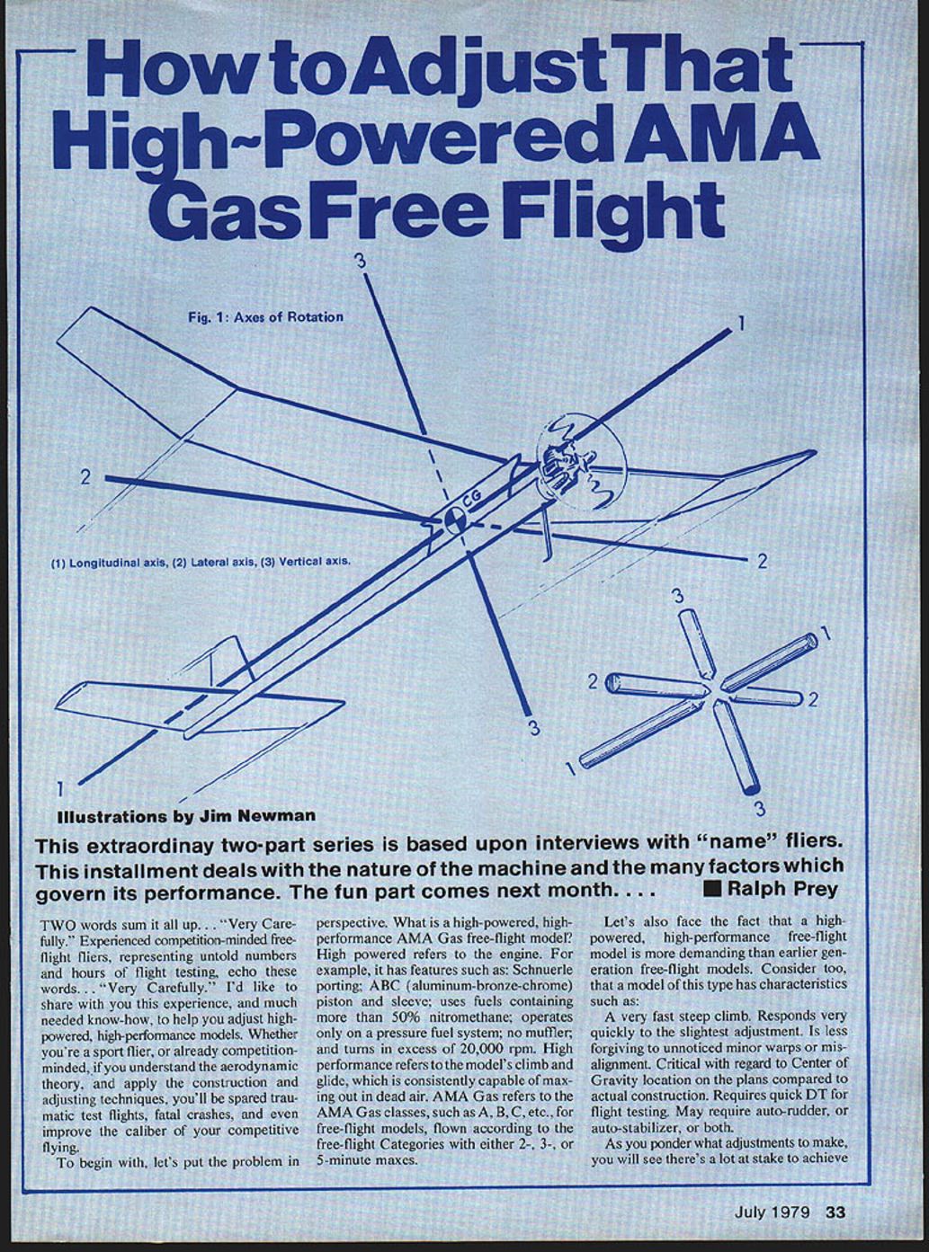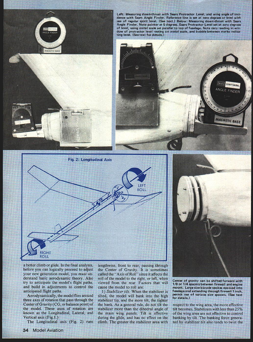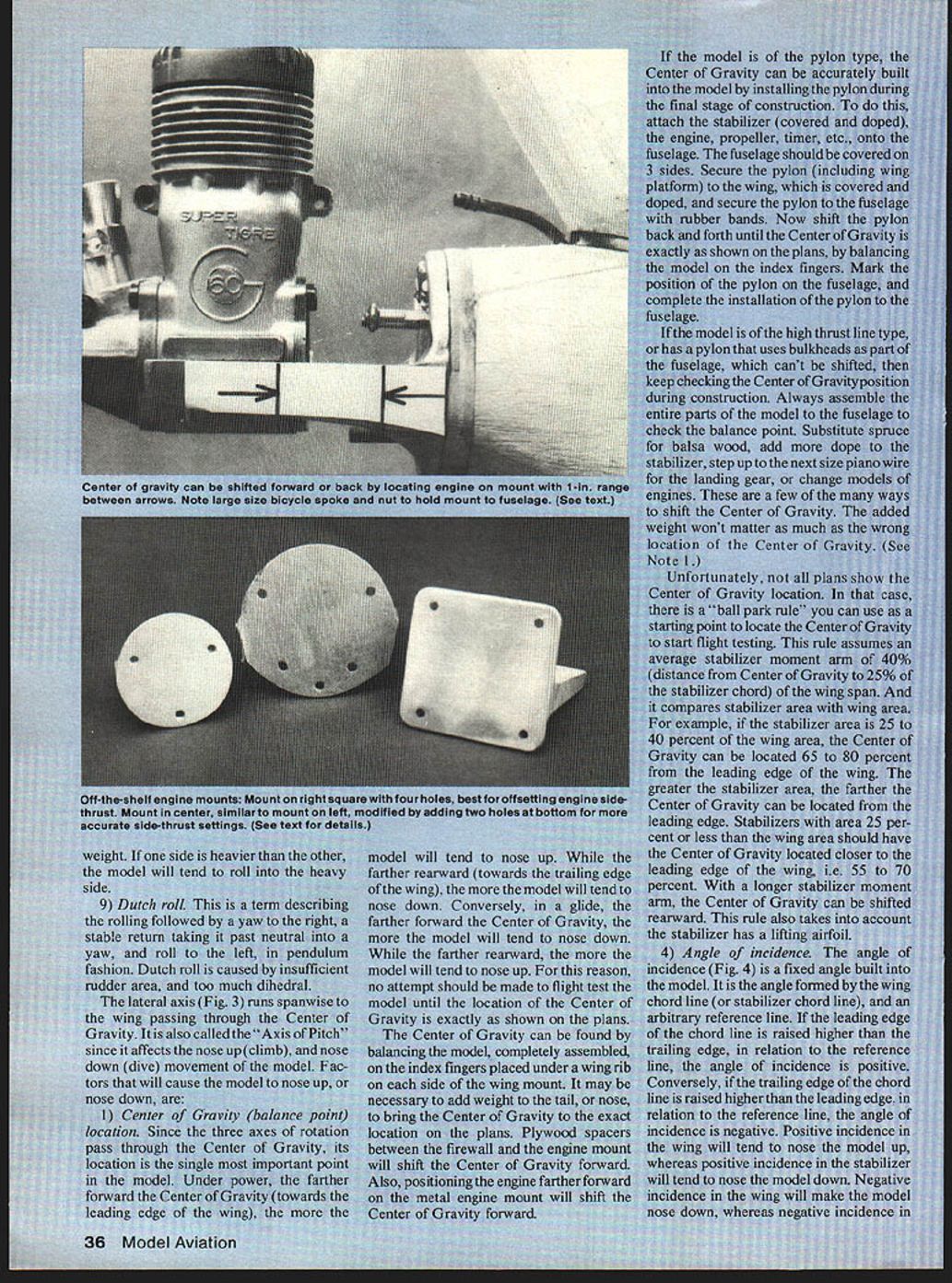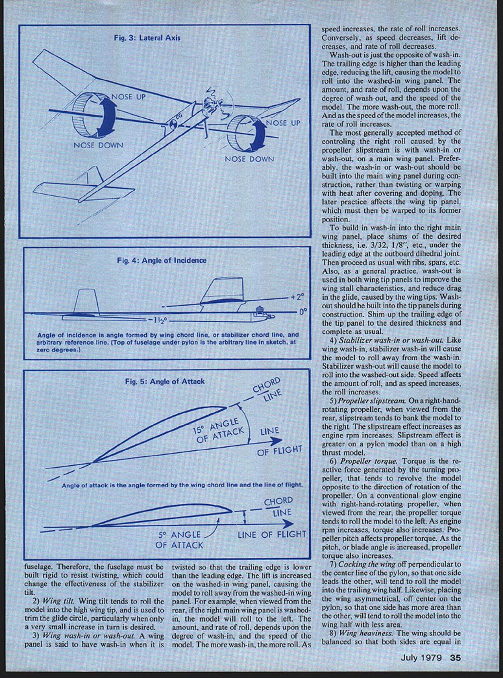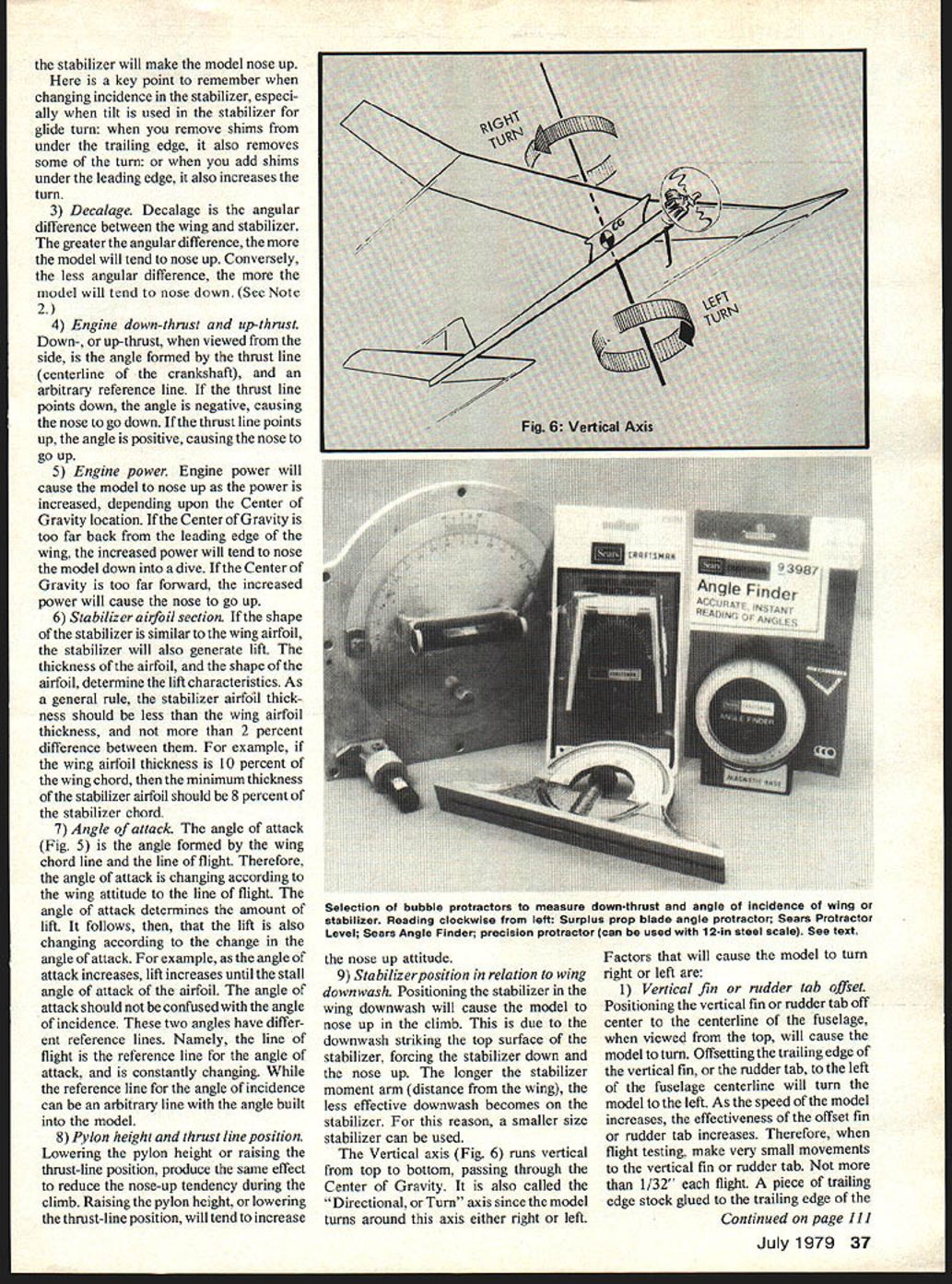 2 Later Vehigh-powen s free-flight o engui such Sc im-bronze--c s fuels co methane Axis Ice V alp level gthwise front Center Gr NO OCR TEXT g fl mount out WO d bY ddIO Ot l will tend r r rearward toWs e wing e down Convets forward C model wili farther re model will tend ton no attempt shOkld b d until th loc iodel irraVitY C inSi CO e plOP ft6 eClllC se po add r few r Gr el 1 Center stabilizer will make model nose up key point remember changing incidence stabilizer especi ally tilt used stabilizer glide turn remove shims under trailing edge also removes some turn add shims under leading edge also increases turn 3 Decalage Decalage angular difference between wing stabilizer greater angular difference the model will tend nose up Conversely less angular difference the model will tend nose down See Note 2 4 Engine down-thrust up-thrust Down- up-thrust viewed side angle formed thrust line centerline crankshaft arbitrary reference line thrust line points down angle negative causing nose go down thrust line points up angle positive causing nose go up 5 Engine power Engine power will cause model nose up power increased depending upon Center Gravity location Center Gravity too far back leading edge wing increased power will tend nose model down dive Center Gravity too far forward increased power will cause nose go up 6 Stabilizer airfoil section shape stabilizer similar wing airfoil stabilizer will also generate lift thickness airfoil shape airfoil determine lift characteristics As general rule stabilizer airfoil thick ness should less wing airfoil thickness 2 percent difference between example wing airfoil thickness 10 percent wing chord minimum thickness stabilizer airfoil should 8 percent stabilizer chord 7 Angle attack angle attack Fig 5 angle formed wing chord line line flight Therefore angle attack changing according wing attitude line flight angle attack determines amount lift follows lift also changing according change angle attack example angle attack increases lift increases until stall angle attack airfoil angle attack should confused angle incidence two angles have differ ent reference lines Namely line flight reference line angle attack constantly changing reference line angle incidence can arbitrary line angle built model 8 Pylon height thrust line position Lowering pylon height raising thrust-line position produce same effect reduce nose-up tendency during climb Raising pylon height lowering thrust-line position will tend increase nose up attitude 9 Stabilizerposition relation wing downwash Positioning stabilizer wing downwash will cause model nose up climb due downwash striking top surface stabilizer forcing stabilizer down nose up longer stabilizer moment arm distance wing less effective downwash becomes stabilizer reason smaller size stabilizer can used Vertical axis Fig 6 runs vertical top bottom passing through Center Gravity also called Directional Turn axis since model turns around axis either right left Factors will cause model turn right left 1 Vertical fin rudder tab offset Positioning vertical fin rudder tab off center centerline fuselage viewed top will cause model turn Offsetting trailing edge vertical fin rudder tab left fuselage centerline will turn model left As speed model increases effectiveness offset fin rudder tab increases Therefore flight testing make very small movements vertical fin rudder tab 1/32 flight piece trailing edge stock glued trailing edge Continued page 111 July 1979 37 Selection bubble protractors measure downthrust angle incidence wing stabilizer Reading clockwise left Surplus prop blade angle protractor Sears Protractor Level Sears Angle Finder precision protractor can used 12-in steel scale See text HOBBYPOXY FORMULA 3 THIXOTROPIC EPOXY GLUE NO SAGS. NORIJNS. NO DR PS. Formula 3 specially formulated gel-like viscosity allowing applied vertical surfaces thin edges other problem areas other glues just run off makes Formula 3 perfect planking building up reinforcing fillets joints sealing cracks filling holes joining poorly fitted badly die-crushed parts . hundred other things youve always wished kind glue now its made Hobbypoxy leader epoxy glues model building Formula 3 packaged two four-ounce cans has working time hour cures hard overnight mmmiv minuws L Division Pettit Paint co Inc 36 Pine Street Rockaway NJ 07866 RC Pylon/Hager continued page 28 28 West Coast race held Mile Square Park Fountain Valley CA hosted QMRC Vince Stag naro CD 17 fliers braved cold winds rain hail snow yes snow southern California sounds like Ohio Due weather four rounds flown Tom Christopher Bob Novak tied lead Tom took prize since fast time 1395 want keep readers informed what going racing throughout country Send us contest reports anything else would like share readers Bill Hager 5200 Rye Dr Dayton OH 45424 AMA Free Flight/Prey continued page 37 vertical fin makes excellent tab instead cutting fin Different thicknesses balsa wood can glued trailing edge stock increase turn wood can shaved off trailing edge stock decrease turn tab used turn adjustment no specific location shown plans locate tab near base trailing edge vertical fin Locating tab near top vertical fin will tend cause rolling effect around Longitu dinal axis well turn thereby achieve desired results 2 Right-or-left engine thrust Right- left-thrust viewed top angle formed line drawn lengthwise through center crankshaft measured either right left center line fuselage Cocking engine thrust line off center will cause model turn direction engine thrust line Engine thrust offset effective low speeds speed increased thrust offset becomes less effective rea son thrust offset used primarily control initial part climb vertical fin rudder tab offset used control remainder power climb Finally model must have stability Without stability around axis rota tion doomed self destruction Stability ability model resist changes normal flight also ability upset outside force such gust wind recover return normal flight des