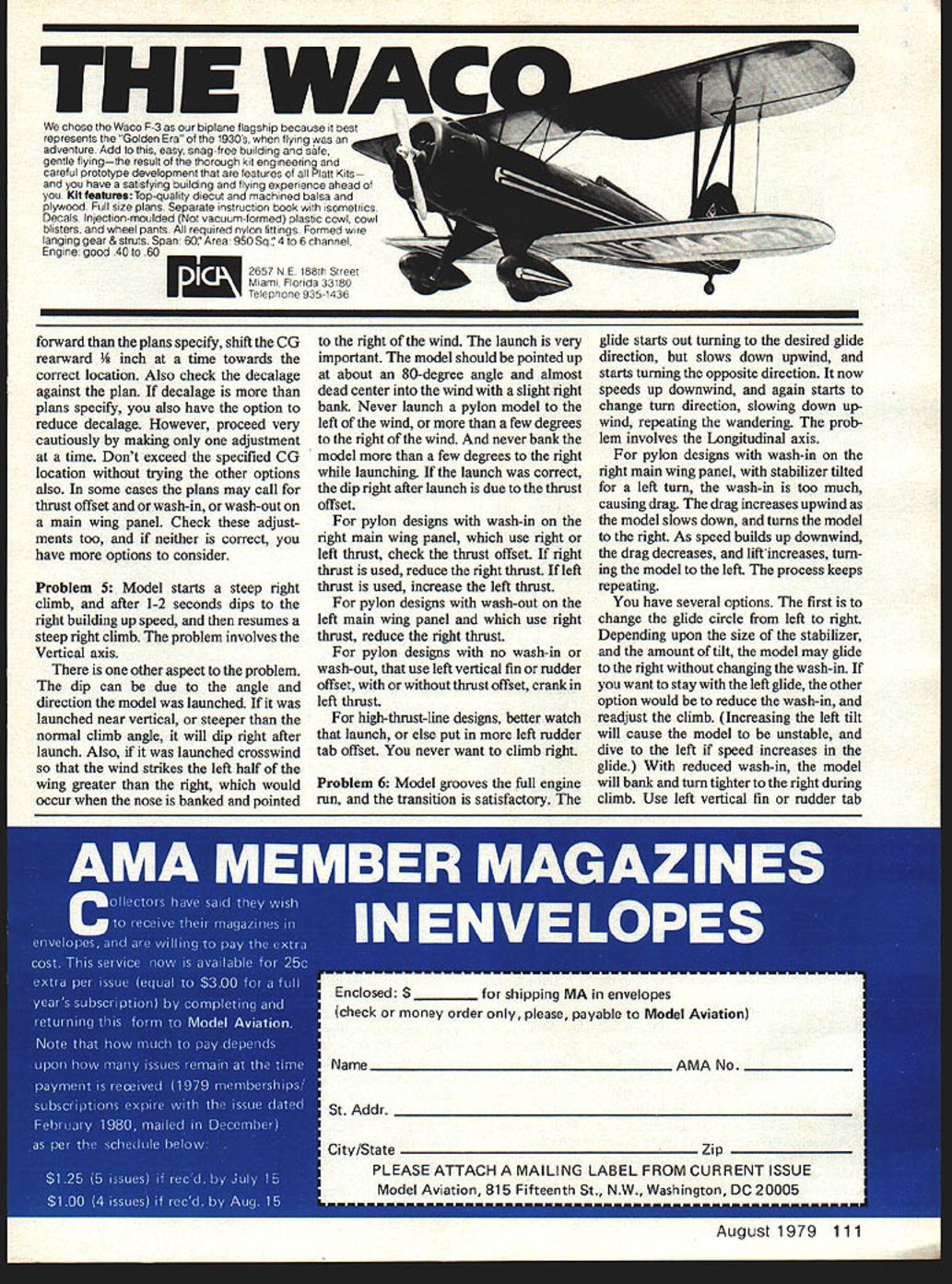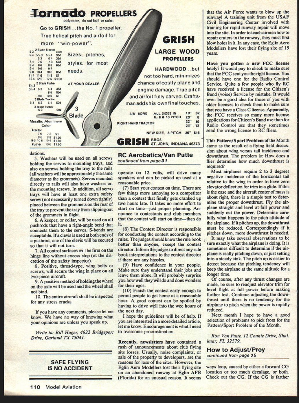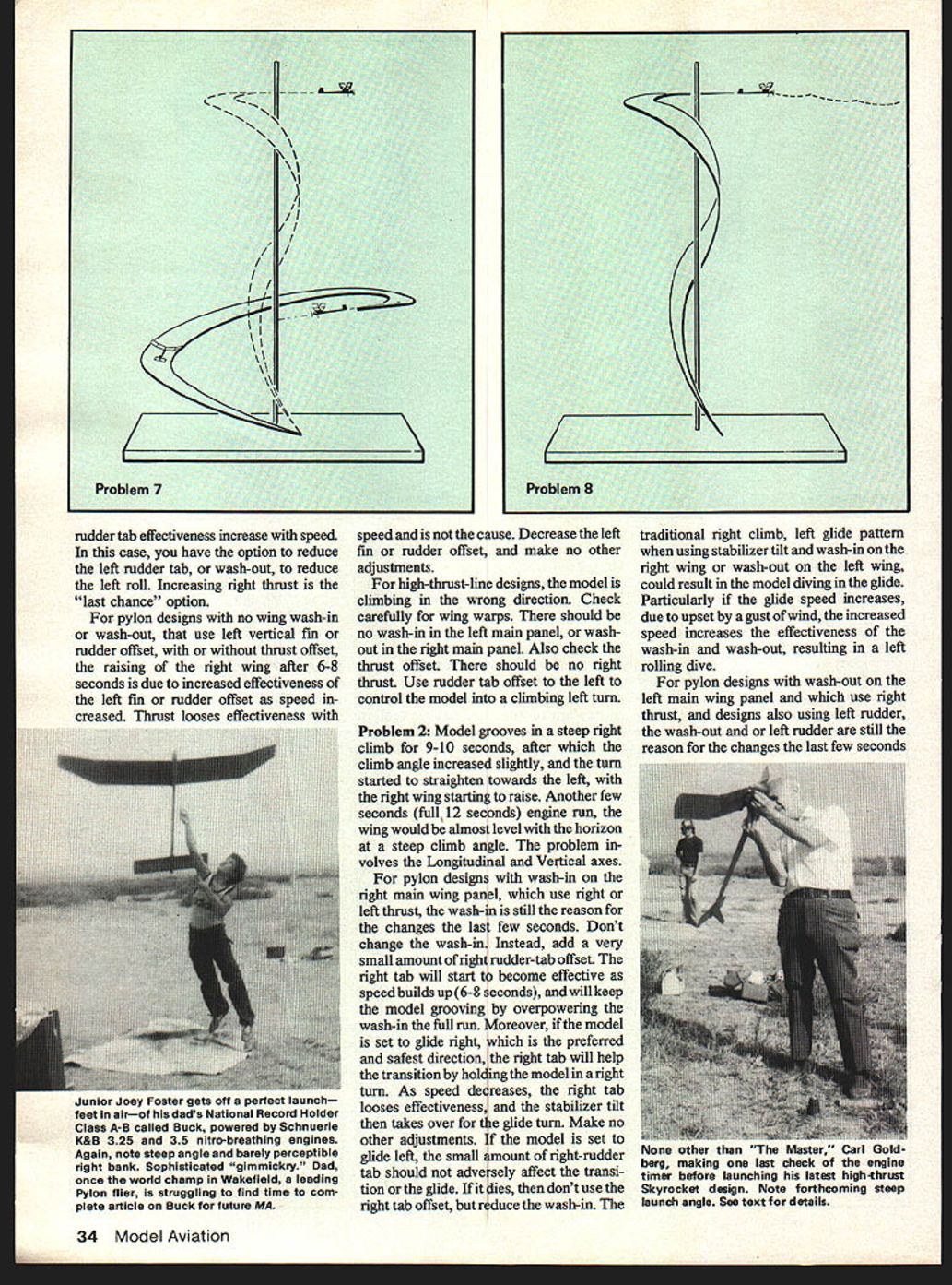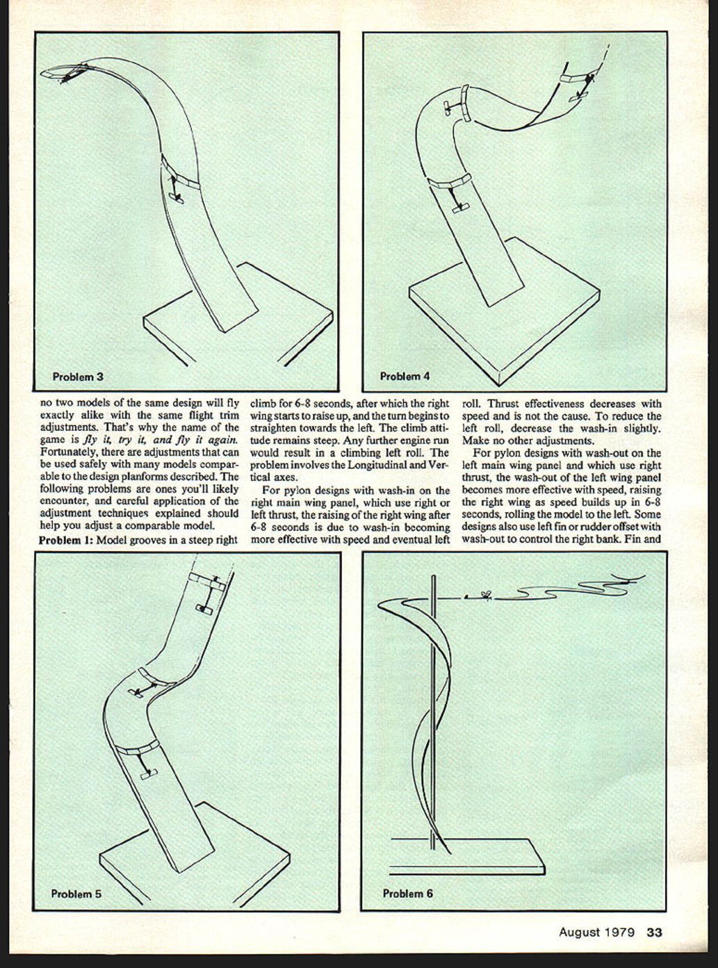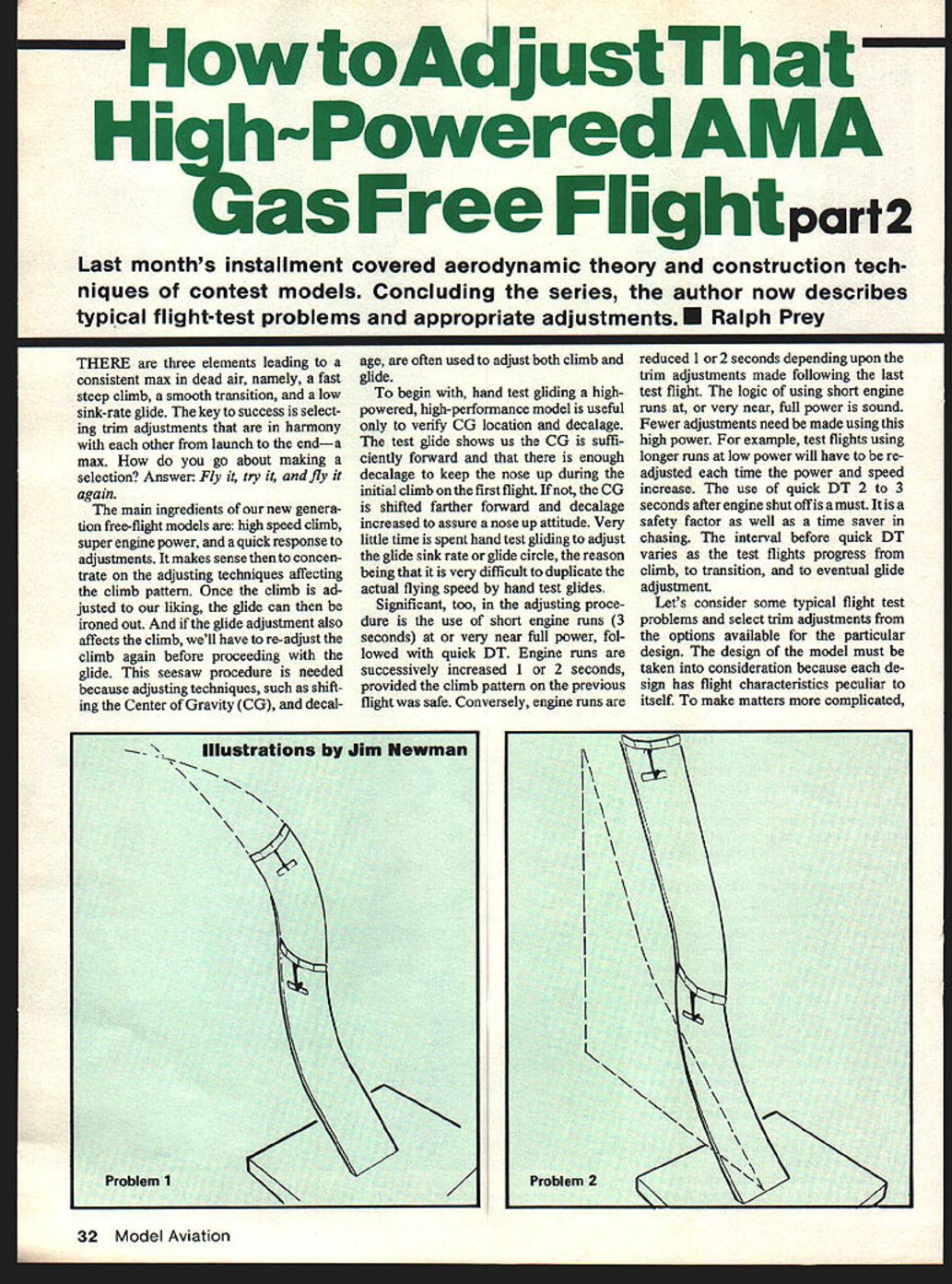 How toAd justThat High-Powered AMA Gas Free Flightpart2 Last months installment covered aerodynamic theory construction tech niques contest models Concluding series author now describes typical flight-test problems appropriate adjustmentsE Ralph Prey THERE three elements leading consistent max dead air namely fast steep climb smooth transition low sink-rate glide key success select ing trim adjustments harmony other launch enda max go about making selection Answer Fly try fly again main ingredients new genera tion free-ffight models high speed climb super engine power quick response adjustments makes sense concen trate adjusting techniques affecting climb pattern Once climb ad justed liking glide can ironed out glide adjustment also affects climb well have re-adjust climb again before proceeding glide seesaw procedure needed because adjusting techniques such shift ing Center Gravity CG decalage often used adjust both climb glide begin hand test gliding highpowered high-performance model useful verify CG location decalage test glide shows us CG suffi ciently forward enough decalage keep nose up during initial climb first flight CG shifted farther forward decalage increased assure nose up attitude Very little time spent hand test gliding adjust glide sink rate glide circle reason being very difficult duplicate actual flying speed hand test glides Significant too adjusting proce dure use short engine runs 3 seconds very near full power fol lowed quick DT Engine runs successively increased 1 2 seconds provided climb pattern previous flight safe Conversely engine runs reduced 1 2 seconds depending upon trim adjustments made following last test flight logic using short engine runs very near full power sound Fewer adjustments need made using high power example test flights using longer runs low power will have re adjusted time power speed increase use quick DT 2 3 seconds after engine shut off must safety factor well time saver chasing interval before quick DT varies test flights progress climb transition eventual glide adjustment Lets consider some typical flight test problems select trim adjustments options available particular design design model must taken consideration because de sign has flight characteristics peculiar itself make matters complicated 32 Model Aviation - Illustrations Jim Newman \ \ N Problem 1 I\ \ K N N N Problem2N no two models same design will fly exactly alike same flight trim adjustments Thats name game fly try fly again Fortunately adjustments can used safely models compar able design planforms described following problems ones youll likely encounter careful application adjustment techniques explained should help adjust comparable modeL Problem 1 Model grooves steep right climb 6-8 seconds after right wing starts raise up turn begins straighten towards left climb atti tude remains steep Any further engine run would result climbing left roll problem involves Longitudinal Ver tical axes pylon designs wash-in right main wing panel use right left thrust raising right wing after 6-8 seconds due wash-in becoming effective speed eventual left roll Thrust effectiveness decreases speed cause reduce left roll decrease wash-in slightly Make no other adjustments pylon designs wash-out left main wing panel use right thrust wash-out left wing panel becomes effective speed raising right wing speed builds up 6-8 seconds rolling model left Some designs also use left fm rudder offset wash-out control right bank Fin II-\ August 1979 33 LI K Problem 4 Problem 3 / Problem 5 / K Problem 6 f / rudder tab effectiveness increase speed case have option reduce left rudder tab washout reduce left roll Increasing right thrust last chance option pylon designs no wing wash-in wash-out use left vertical fin rudder offset thrust offset raising right wing after 6-8 seconds due increased effectiveness left fin rudder offset speed creased Thrust looses effectiveness speed cause Decrease left fin rudder offset make no other adjustments high-thrust-line designs model climbing wrong direction Check carefully wing warps should no washin left main panel wash out right main panel Also check thrust offset should no right thrust Use rudder tab offset left control model climbing left turn Problem 2 Model grooves steep right climb 9-10 seconds after climb angle increased slightly turn started straighten towards left right wing starting raise Another few seconds full 12 seconds engine run wing would almost level horizon steep climb angle problem volves Longitudinal Vettical axes pylon designs wash-in right main wing panel use right left thrust wash-in still reason changes last few seconds Dont change wash-in Instead add very small amount right rudder-tab offset right tab will start become effective speed builds up 6-8 seconds will keep model grooving overpowering wash-in full run Moreover model set glide right preferred safest direction right tab will help transition holding model right turn As speed decreases right tab looses effectiveness stabilizer tilt takes over glide turn Make no other adjustments model set glide left small amount right-rudder tab should adversely affect transi tion glide dies dont use right tab offset reduce wash-in traditional right climb left glide pattern using stabilizer tilt wash-in right wing wash-out left wing could result model diving glide Particularly glide speed increases due upset gust wind increased speed increases effectiveness wash-in wash-out resulting left rolling dive pylon designs wash-out left main wing panel use right thrust designs also using left rudder wash-out left rudder still reason changes last few seconds 34 Model Aviation \ I II / / / Problem 7 / Problem 8 junior Joey Foster gets off perfect launch feet airof dads National Record Holder Class A-B called Buck powered Schnuerle K&B 325 35 nitro-breathing engines Again note steep angle barely perceptible right bank Sophisticated gimmickry Dad once world champ Wakefield leading Pylon flier struggling find time co