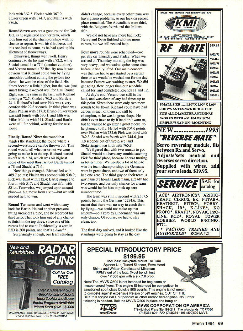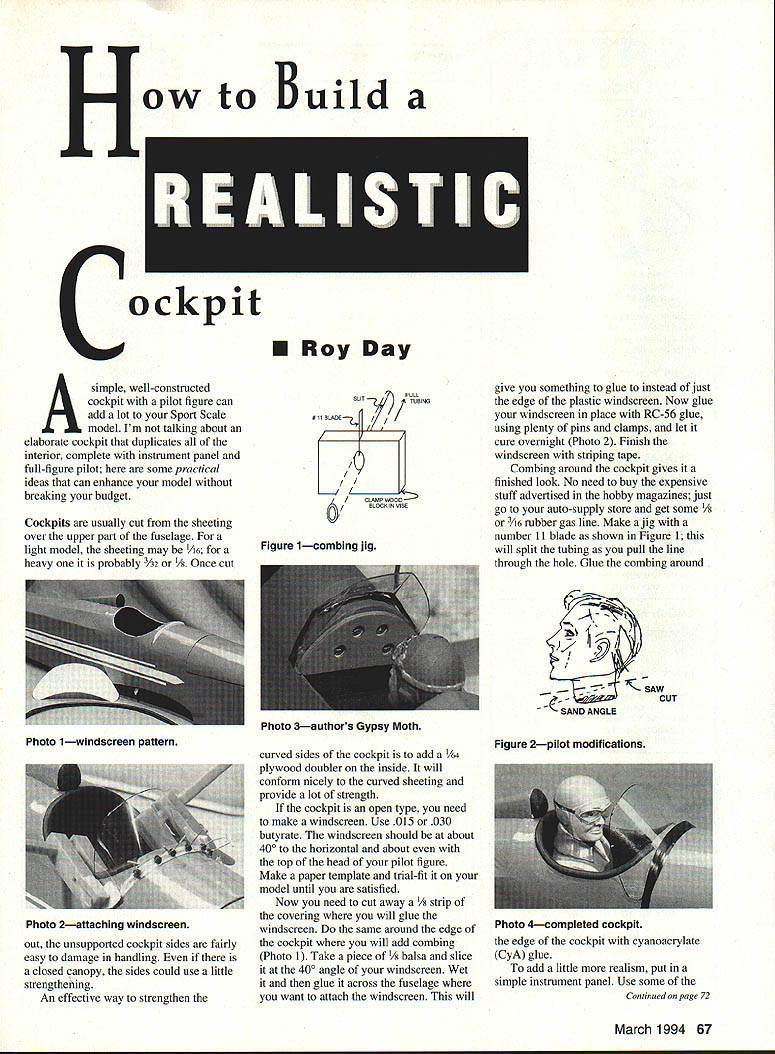 How Build U Roy Day simple well-constructed cockpit pilot figure can add lot Sport Scale model Im talking about elaborate cockpit duplicates interior complete instrument panel full-figure pilot some practical ideas can enhance model breaking budget Cockpits usually cut sheeting over upper part fuselage light model sheeting may 146 heavy probably A2 1/8 Once cut out unsupported cockpit sides fairly easy damage handling closed canopy sides could use little strengthening An effective way strengthen PULL BUT/p TUBING BliBLABE/ / O / CABP\BOOD BLOCK N 1SE Figure 1combing jig curved sides cockpit add /64 plywood doubler inside will conform nicely curved sheeting provide lot strength cockpit open type need make windscreen Use 015 030 butyrate windscreen should about 400 horizontal about top head pilot figure Make paper template trial-fit model until satisfied Now need cut away 1/g strip covering will glue windscreen same around edge cockpit will add combing Photo 1 Take piece /s balsa slice 400 angle windscreen Wet glue across fuselage want attach windscreen will give something glue instead just edge plastic windscreen Now glue windscreen place RC-56 glue using plenty pins clamps let cure overnight Photo 2 Finish windscreen striping tape Combing around cockpit gives finished look No need buy expensive stuff advertised hobby magazines just go auto-supply store get some 1/8 /6 rubber gas line Make ajig number 11 blade shown Figure 1 will split tubing pull line through hole Glue combing around -S SAW SAND ANGLECUT Figure 2pilot modifications edge cockpit cyanoacrylate CyA glue add little realism put simple instrument panel Use some Continued page 72 March 1994 67 ockpit Photo 1windscreen pattern Photo 3authors Gypsy Moth Photo 2attaching windscreen Photo 4completed cockpit GEITOR R/C Products Inc MV-i TYPHOON Now choose 3 versions size style class 4-Strokeconstruction Wing Area 909 Square Inch Wing Span 70 /2 nch Length 68 /2 /4 Inch Advanced technology design precision aerobat ice competition Light weight all-balsa construction plug-in adjustable wing stab panels Detailed plans three different versions Plans 909 Sq Version 2 Sheets$1495 Plans- 1000 Sq Version 2 Sheets$1495 Plans 1085 Sq 0 Version 2 Sheets$1595 Fiberglass Cowl$1995 Clear CanopySi 495 Rib/Former Kit Specify Version$12500 PLUG-IN WING ADJUSTER KIT z*zz~ Two glass-filled nylon brackets used wing panel key wing panel front rear allowing quick accurate adjustment straight flight Complete hardware instructions 2-Pack wing panel $795 4-Pack both wing panels $1295 PLUG-IN ADJUSTABLE STAB KIT Now can optimize stab incidence best flight characteristics pair glass-filled nylon adjusters included provide simple quick micro screw adjustment smaller front stab tube Main tube alloy aluminum matching phenolic socket Complete Package 5995 WING TUBE AND SOCKET SETS Aluminum alloy tubing plug-in wings Includes special slip-fit phenolic sQckets build wing panels Special lengths order 7/1 6 dia x 2 ft precision fit sockets $695 5/8 dia x 2ff precision tit sockets $1095 7/8 dia x 2 ft precision fit sockets $1195 1-1/4 dia x 2 ft $995 1-1/2 dia x3ft $1495 GEITOR R/C Products Inc 3713 Pompano Drive Pensacola FL 32514 904/494-0203 904/494-0207 VISA/MasterCard Welcomed $400 per item SH esidents add 8% Tax PylonlYeager Continued page 64 toward front cage smacked face onto something cut him So now hes standing paint scrapings him blood dripping down quite frankly CD could handle quite emotional point werent sure going continue cage made same stuff use America looked like chain-link wasnt wire diameter smaller rather being flexible very stiff because point wires cross its welded together making entire cage too stiff absorb shock moving mass So stood around after 40 minutes CD calmed down somewhat went Henry turned 735 Richard continued march great 694 Shadel didnt get fly because Heat Seven Australias Bruce deChastel got same situation Jett smacked same cage later told plane straightened out probably could have saved cage wasnt way again think CD shook up before should have seen him now no reasoning him point racing suspended day few heats short completing round kinda stood around waiting see what going happen no word management Jury out course talking CD people Bob Brown Jury member told language barrier impossible make guy understand occasion have accidents Thats have protection course workers no doubt cage two guys involved would have able save planes worst would have happened would have crashed ground pylon judge would have battery needs call write B&P Associates PO Box 22054 Waco TX 76702-2054 817662-5587 looked around said tsk tsk about 6 pm Team Managers meeting scheduled 730 since stopped early asked CD would move meeting time up talked over agreed meeting probably would nothing shouting affair because everyone axe grind During day confrontation between CD German team manager Dont know what said ended German guy giving CD up-to-your-elbow type gesture both stomped off Tuesday morning dawned dawned Although werent flying until 7 am CD wanted us 6 tarn radios course still dark out Everyone pitted big square vehicles parked headlights put planes together stand around waiting dawn day dawn came before fog cleared did discovered something new race course took several yards fencing plastic type see around construction sites overlapped edge-to-edge wove rope through ending great big plastic fence took monstrosity tied pylon poles top spread bottom out tent-style staked ground around Pylons Two Three wondered pylon judge could see through junk Now obstruction eight 10 feet out onto course started racing again immediately problems Shadel still scheduled finish Round Six registered cut time followed several other people also given cuts explanation pylon judge people flying dangerous flying close pole gave cuts wasnt case flying inside polehe gave cuts being close complained CD didnt understand what saying Round Six finally concluded Richard held lead 3457 point