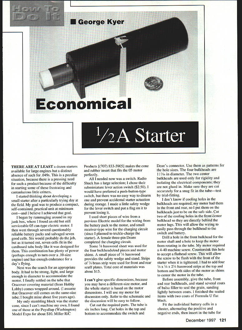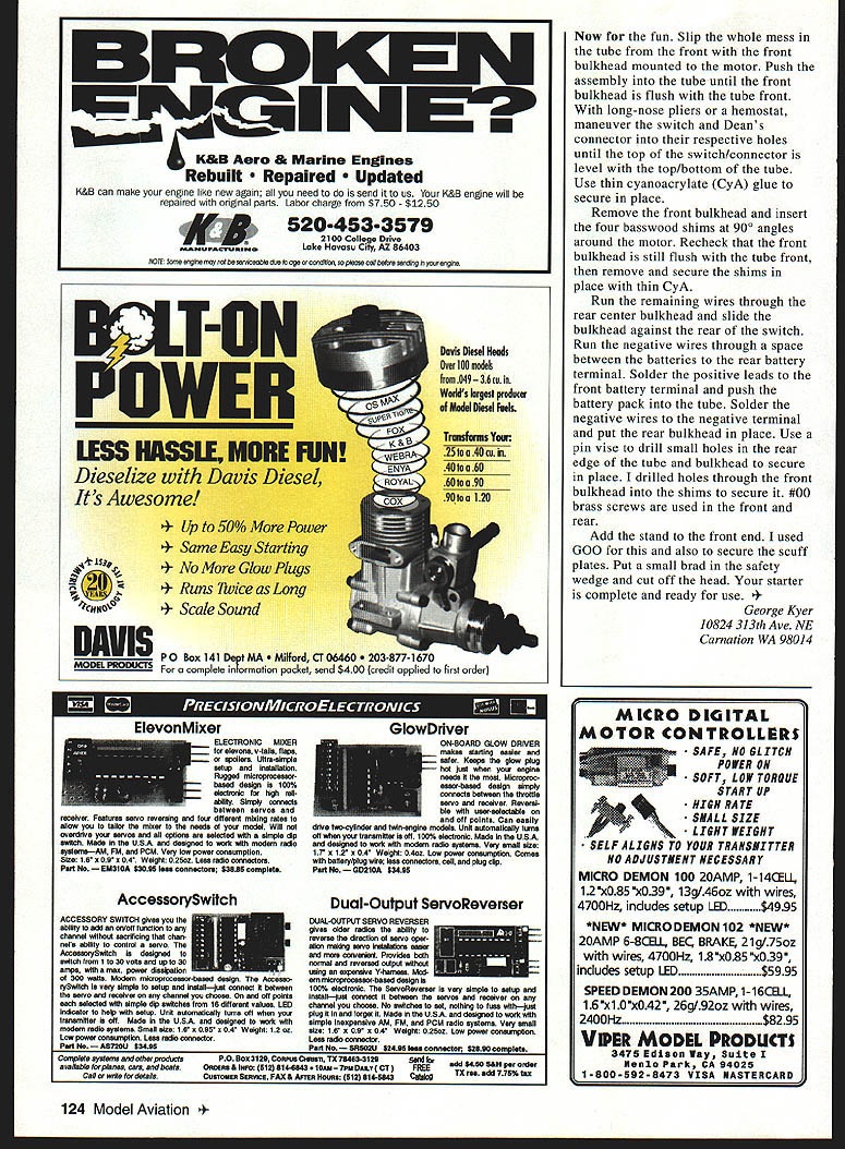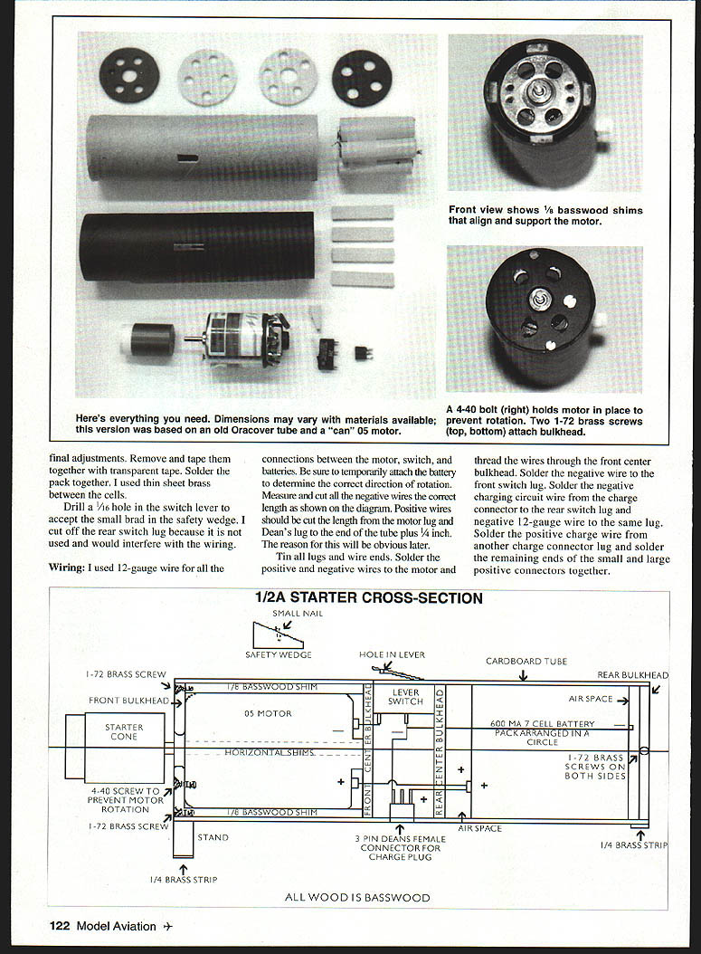 THERE ARE AT LEAST dozen starters available large engines distinct absence such 049s peculiar situation because pressing need such product because difficulty starting some frustrating cantankerous little critters started thinking about developing small starter after particularly trying day field goal produce compact self-contained practical unit minimum costand believe achieved goal began rummaging around junk box found old still serviceable 05 can-type electric motor went through several questionably reliable battery packs salvaged seven good cells Six would probably job turned out seven cells fit cardboard tube body like designed combination has plenty power perhaps enough turn over 10-size engine has enough endurance days flying Next search appropriate body strong light large enough diameter accommodate motor finally settled tube Oracover covering material Hobby Lobby comes wrapped around assume Oracover still comes same-size tube bought about five years ago stumbling block starter cone since cant machine own found Puyallup Washington Model Expo about $10 Miller R/C Products [707 833-5905] makes cone rubber insert fits 05 motor perfectly needed now switch Radio Shack has large selection chose subminiature lever action switch $250 would have preferred push-button-type switch no easy way disarm prevent accidental starter actuation during storage made little safety wedge lever switch put flag prevent losing used short pieces wire previous Electric model wiring battery pack motor small receiver-type wire charging circuit since planned trickle-charge starter female three-pin Deans completed charging circuit Some l/ basswood sheet used four bulkheads/end pieces motor shims small piece wood provides safety wedge stand Strips s strip used front rear scuff plates Total cost materials about $15 cant give specific dimensions because may have different-size motor whole starter based motor dimensions will use motor discussion Refer schematic discussion will easy follow Cut out required parts tube six inches long Cut holes top bottom accommodate switch Deans connector Use patterns hole sizes four bulkheads 111/16 diameter two center bulkheads used rigidity isolating electrical components glued Make sure cut accurately snug fit tubetest trial-fitting dont know cooling holes bulkheads required motor front rear put bulkheads just safe side Cut two cooling holes front-center bulkhead directly behind motor lugs will allow wiring easily pass through bulkhead switch battery Drill hole front bulkhead motor shaft hole keep motor rotating tube motor required 4-40 machine screw Countersink hole accept flathead screw will allow screw flush front starter tightened add four x basswood strips top bottom both sides motor shims center motor tube Before assembly give tube front rear bulkheads stand several coats balsa filler seal grain sanding lightly between coats finished sealed items two coats Formula U flat black Fit individual battery cells cluster alternating positive negative ends insert tube December 1997 121 conomical final adjustments Remove tape together transparent tape Solder pack together used thin sheet brass between cells Drill 66 hole switch lever accept small brad safety wedge cut off rear switch lug because used would interfere wiring Wiring I used 12-gauge wire connections between motor switch batteries sure temporarily attach battery determine correct direction rotation Measure cut negative wires correct length shown diagram Positive wires should cut length fmm motor lug Deans lug end tube plus reason will obvious later Tin lugs wire ends Solder positive negative wires motor thread wires through front center bulkhead Solder negative wire front switch lug Solder negative charging circuit wire charge connector rear switch lug negative 12-gauge wire same lug Solder positive charge wire another charge connector lug solder remaining ends small large positive connectors together 1/2A STARTER CROSS-SECTION SMALL NAIL CARDBOARD TUBE 1-72 BRASS SCREW FRONT BULKHEAD [fTElL LL1 4 40 SCREW TO ENT MOTOR ROTATION REAR BULKHEAD 1/8 I3ASSWUOU SHIMLEVER AIRSPACE 600 MA 7 CELL BATTERY 05 MOTORL SVTCH ___ ____ B____ PACKARRANGEDINA -CIRCLE HORIZONTAL5HIMS1-72 BRASS F-SCREWS ON UZBOTH SIDES 3 0 I/B_BASSWOODSHIM____________________ 1-72 BRASS SCREW STAND 3 PIN DEANS FEMALE CONNECTOR FOR CHARGE PLUG AIR SPACE K 1/4 BRASS STRIP 1/4 BRASS STRIP ALL WOOD IS BASSWOOD 122 Model Aviation t view shows 1/8 basswood shims align support motor 4-40 bolt right holds motor place Heres everything need Dimensions may vary materials available prevent rotation Two 1-72 brass screws version based old Oracover tube can 05 motor top bottom attach bulkhead KS SAFETY WEDGE HOLE IN LEVER LESS HISSLE MORE FUN Dieselize Davis Diesel Its Awesome L4 50% Power Same Easy Starting No Glow Plugs Runs Twice Long e Sound P0 Box 141 Dept MA ord CT 06460 87-iO7O complete inrmation pocket send $400 credit applied first order vuu~ 4IfMOvO DAVIS MODEL PRODUCTS Now fun Slip whole mess tube front front bulkhead mounted motor Push assembly tube until front bulkhead flush tube front long-nose pliers hemostat maneuver switch Deans connector respective holes until top switch/connector level top/bottom tube Use thin cyanoacrylate CyA glue secure place Remove front bulkhead insert four basswood shims 900 angles around motor Recheck front bulkhead still flush tube front remove secure shims place thin CyA Run remaining wires through rear center bulkhead slide bulkhead against rear switch Run negative wires through space between batteries rear battery terminal Solder positive leads front battery terminal push battery pack tube Solder negative wires negative terminal put rear bulkhead place Use pin vise drill small holes rear edge tube bulkhead secure place drilled holes through front bulkhead shims secure #00 brass screws used front rear Add stand front end used GOO also secure scuff plates Put small brad safety wedge cut off head starter complete ready use ge Kyer