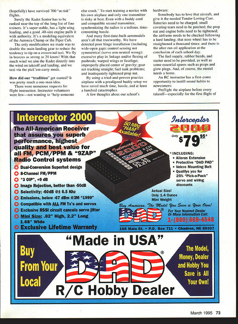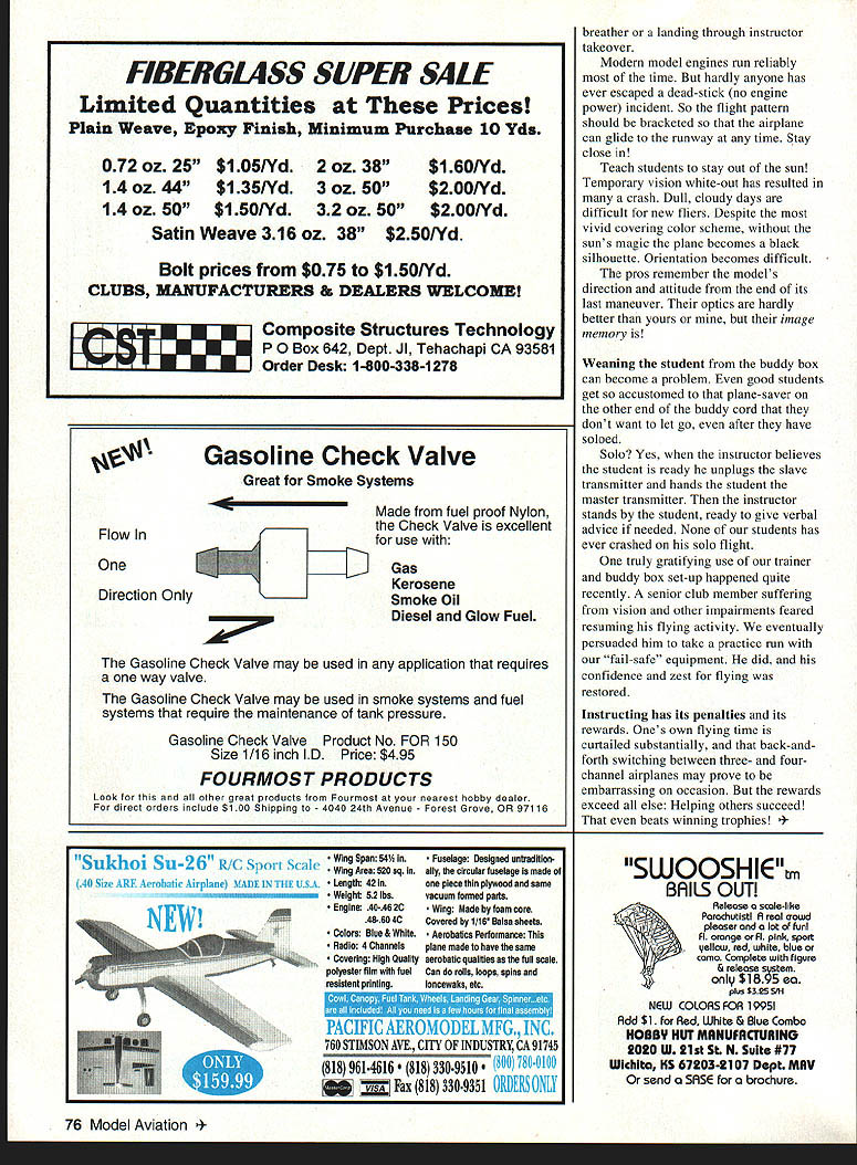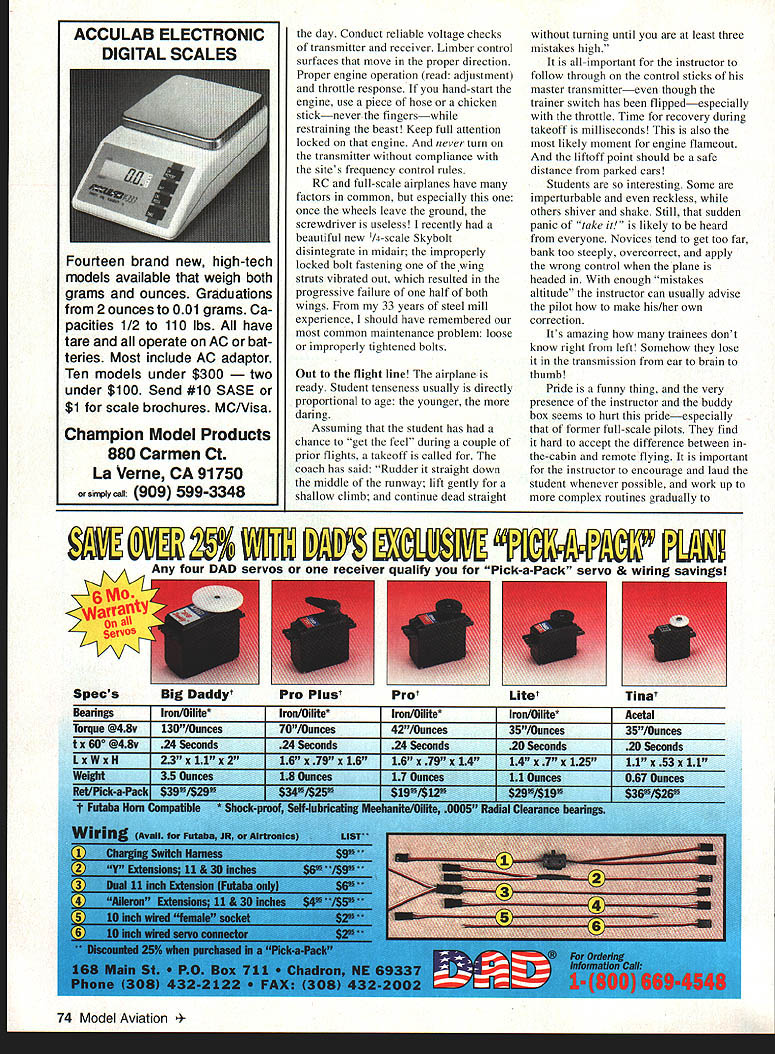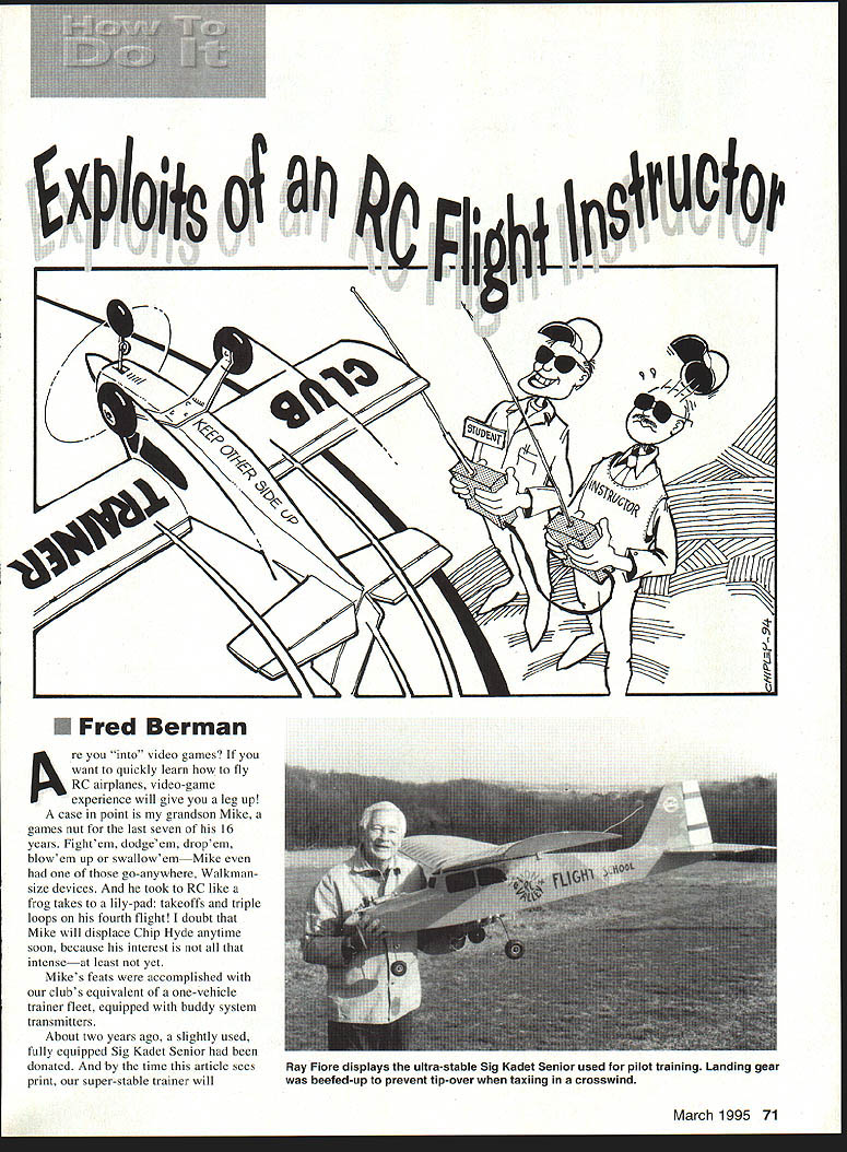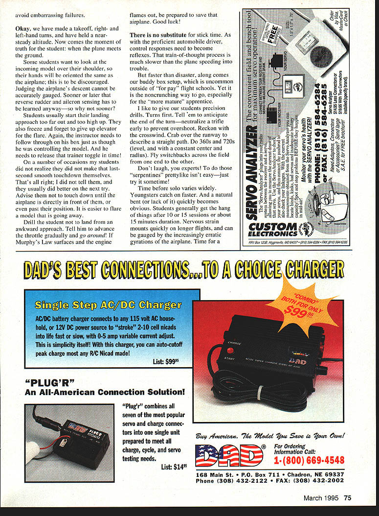 xNo9 o an______ Fred Berman re video games want quickly learn fly RC airplanes video-game experience will give leg up case point grandson Mike games nut last seven 16 years Fightem dodgeem dropem blowem up swallowemMike go-anywhere Walkman size devices took RC like frog takes lily-pad takeoffs triple loops fourth flight doubt Mike will displace Chip Hyde anytime soon because interest intenseat least yet Mikes feats accomplished clubs equivalent one-vehicle trainer fleet equipped buddy system transmitters About two years ago slightly used fully equipped Sig Kadet Senior donated time article sees print super-stable trainer will March 1995 71 Ray Fiore displays ultra-stable Sig Kadet Senior used pilot training Landing gear beefed-up prevent tip-over taxiing crosswind hopefully have survived 700 risk flights Surely Kadet Senior has ranked near top long list fine trainers Its super stable has light wing loading good 40-size engine pulls authority Its modeling equivalent Aeronca Champ Piper Cub modification made double main landing gear reduce tendency tip crosswind taxi fly breezes strong 20 knots much wind aim Kadet directly wind takeoff landing taxi via pickem-carry mode did tradition get started pretty much one-man idea numerous requests flight instruction Instructor volunteers fewnot wanting help someone else crash start training novice own airplane transmitter risky best buddy cord compatible second transmitter synchronizing radios tedious timeconsuming hassle first-time-built aeromodels arent trustworthy have detected poor hinge installation including wide-open gap control sensing symmetrical servo arm neutral wrong excessive play linkage and/or flexing pushrods warped wings fuselage improperly placed center gravity gear tracking straight fuel tank problems inadequately tightened prop nut using tried-and-proven practice airplane prealigned buddy setup have saved much time hassle least hundred catastrophes few thoughts about schools hardware Somebody has love aircraft give needed Tender Loving Care Batteries need charged small covering tears need patched prop nut engine bolts need tightened airframe needs checked following hard landing nose wheel has straightened thousand times after-run oil application conclusion school day fuel supply rubber bands starter need provided well some essential spares such props glow plugs course model needs home An RC instructor has first-come opportunity instill sound habits newcomers Preflight airplane before takeoffespecially first flight March 1995 73 day Conduct reliable voltage checks transmitter receiver Limber control surfaces move proper direction Proper engine operation read adjustment throttle response hand-start engine use piece hose chicken stickneverthe fingers.-while restraining beast Keep full attention locked engine never turn transmitter compliance sites frequency control rules RC full-scale airplanes have factors common especially once wheels leave ground screwdriver useless recently beautiful new /4-scale Skybolt disintegrate midair improperly locked bolt fastening wing struts vibrated out resulted progressive failure half both wings 33 years steel mill experience should have remembered common maintenance problem loose improperly tightened bolts Out flight line airplane ready Student tenseness usually directly proportional age younger daring Assuming student has chance get feel during couple prior flights takeoff called coach has said Rudder straight down middle runway lift gently shallow climb continue dead straight turning until least three mistakes high all-important instructor follow through control sticks master transmittereven though trainer switch has flippedespecially throttle Time recovery during takeoff milliseconds also likely moment engine flameout liftoff point should safe distance parked cars Students interesting Some imperturbable reckless others shiver shake Still sudden panic take itis likely heard everyone Novices tend get too far bank too steeply overcorrect apply wrong control plane headed enough mistakes altitude instructor can usually advise pilot make his/her own correction Its amazing trainees dont know right left Somehow lose transmission ear brain thumb Pride funny thing very presence instructor buddy box seems hurt prideespecially former full-scale pilots find hard accept difference between inthe-cabin remote flying important instructor encourage laud student whenever possible work up complex routines gradually JEI Any four DAD servos receiver quality Pick-a-Pack servo & wiring savingsl ~1/\IN 74 Model Aviation LAB ELECTRONIC DIGITAL SCALES Fourteen brand new high-tech models available weigh both grams ounces Graduations 2 ounces 001 grams Ca pacities 1/2 110 lbs have tare operate AC bat teries Most include AC adaptor Ten models under $300 under $100 Send #10 SASE $1 scale brochures MC/Visa Champion Model Products 880 Carmen Ct La Verne CA 91750 909 599-3348 SpecsBig DaddytPro PlustProtTinat avoid embarrassing failures Okay have made takeoff right- left-hand turns have held nearsteady altitude Now comes moment truth student plane meets ground Some students want look incoming model over shoulder hands will oriented same airplane discouraged Judging airplanes descent cannot accurately gauged Sooner later reverse rudder aileron sensing has learned anywayso sooner Students usually start landing approach too far out too high up also freeze forget give up elevator flare Again instructor needs follow through box just though controlling model needs release trainer toggle time number occasions students did realize did make lastsecond smooth touchdown themselves Thats right did tell usually did better next try Advise touch down until airplane directly front past position easier flare model going away Drill student land awkward approach Tell him advance throttle gradually go around Murphys Law surfaces engine flames out prepared save airplane Good luck no substitute stick time As proficient automobile driver control respo