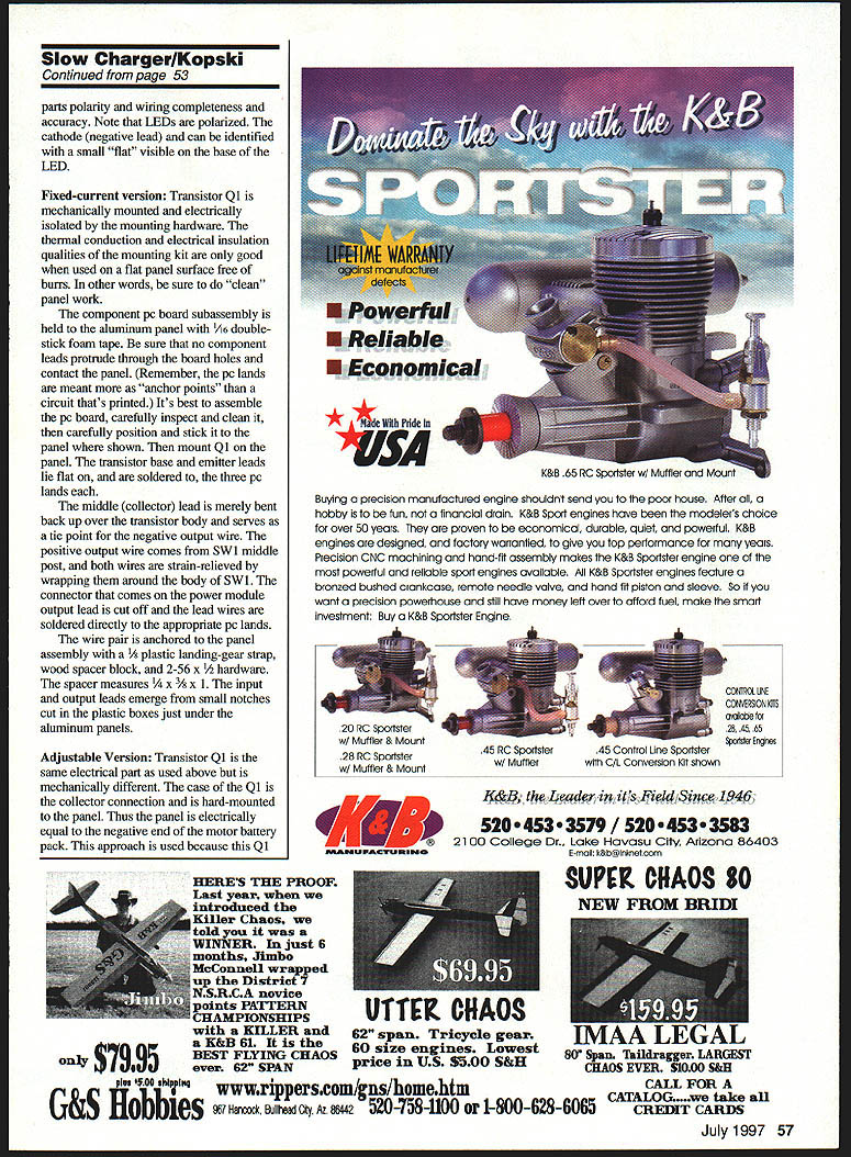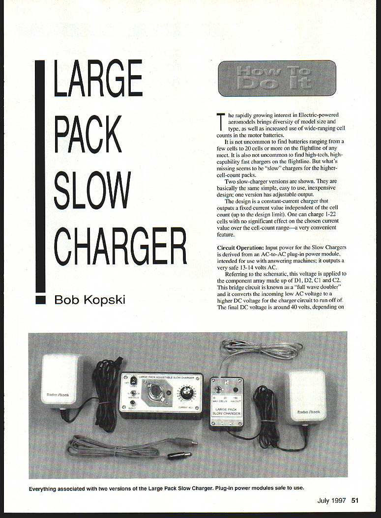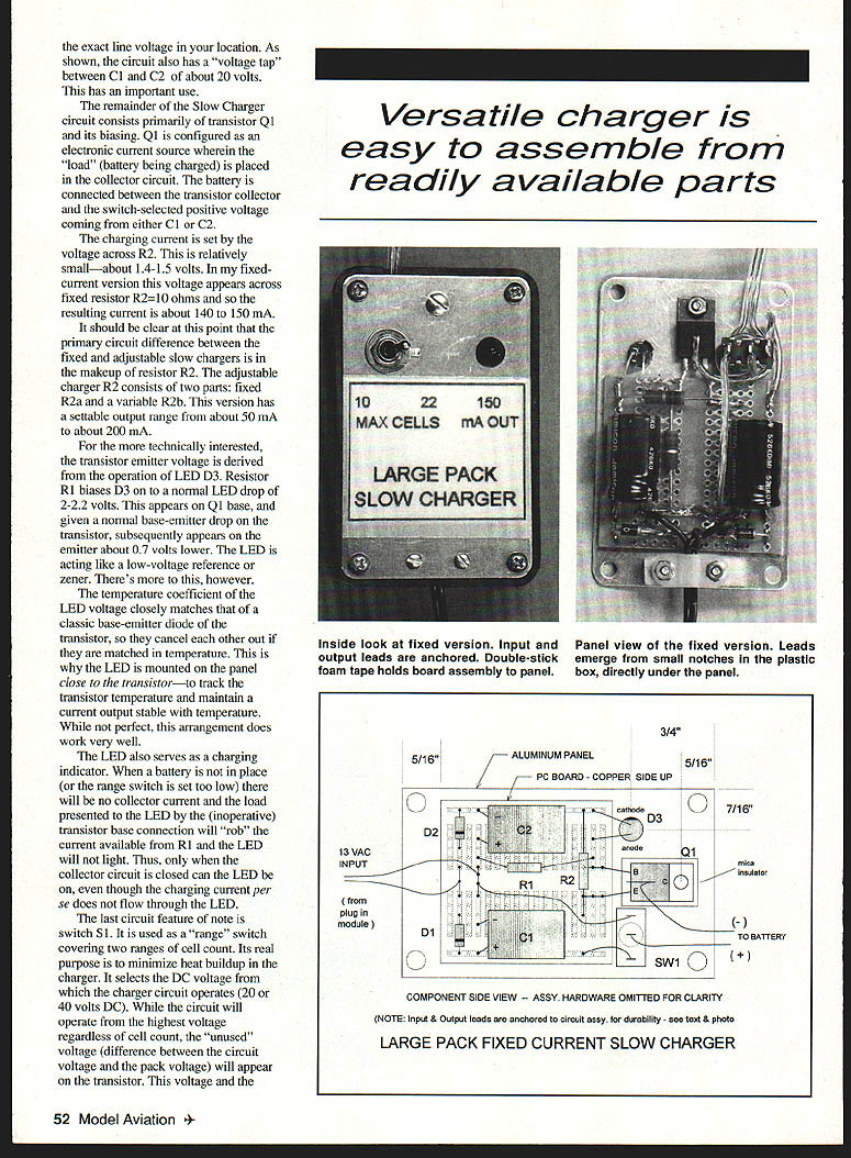 LARGE PACK SLOW CHARGER U Bob Kopski rapidly growing interest Electric-powered aeromodels brings diversity model size type well increased use wide-ranging cell counts motor batteries uncommon find batteries ranging few cells 20 cells flightline meet also uncommon find high-tech highcapability fast chargers flightline whats missing seems slow chargers highercell-count packs Two slow-charger versions shown basically same simple easy use inexpensive design version has adjustable output design constant-current charger outputs fixed current value independent cell count up design limit can charge 1-22 cells no significant effect chosen current value over cell-count rangea very convenient feature Circuit Operation Input power Slow Chargers derived AC-to-AC plug-in power module intended use answering machines outputs very safe 13-14 volts AC Referring schematic voltage applied component array made up Dl D2 Cl C2 bridge circuit known full wave doubler converts incoming low AC voltage higher DC voltage charger circuit run off final DC voltage around 40 volts depending July 1997 51 Everything associated two versions Large Pack Slow Charger Plug-in power modules safe use exact line voltage location As shown circuit also has voltage tap between Cl C2 about 20 volts has important use remainder Slow Charger circuit consists primarily transistor Qi its biasing Qi configured electronic current source wherein load battery being charged placed collector circuit battery connected between transistor collector switch-selected positive voltage coming either Cl C2 charging current set voltage across R2 relatively smallabout 14-15 volts fixedcurrent version voltage appears across fixed resistor R2 10 ohms resulting current about 140 150 mA should clear point primary circuit difference between fixed adjustable slow chargers makeup resistor R2 adjustable charger R2 consists two parts fixed R2a variable R2b version has settable output range about 50 mA about 200 mA technically interested transistor emitter voltage derived operation LED D3 Resistor Ri biases D3 normal LED drop 2-22 volts appears Qi base given normal base-emitter drop transistor subsequently appears emitter about 07 volts lower LED acting like low-voltage reference zener Theres however temperature coefficient LED voltage closely matches classic base-emitter diode transistor cancel other out matched temperature LED mounted panel close transistorto track transistor temperature maintain current output stable temperature perfect arrangement does work very well LED also serves charging indicator battery place range switch set too low will no collector current load presented LED inoperative transistor base connection will rob current available Ri LED will light Thus collector circuit closed can LED though charging current per se does flow through LED last circuit feature note switch Si used range switch covering two ranges cell count Its real purpose minimize heat buildup charger selects DC voltage charger circuit operates 20 40 volts DC circuit will operate highest voltage regardless cell count unused voltage difference between circuit voltage pack voltage will appear transistor voltage easy assemble readily available parts 13 VAC INPUT plug module 3/4 5/16 PC BOARD COPPER SIDE UP 7/16 D3 mica insulator R1RO swi Q COMPONENT SIDE VIEW HARDWARE OMITTED FOR CLARITY NOTE Input & Output leads anchored Circuit assy durability see text & photo LARGE PACK FIXED CURRENT SLOW CHARGER C TO BATTERY 0 D2 Dl ALUMINUM PANEL 52 Model Aviation atile charger Inside look fixed version Input Panel view fixed version Leads output leads anchored Double-stick emerge small notches plastic foam tape holds board assembly panel box directly under panel Inside panel adjustable version Wiring point-to-point pc board serves parts holder Sm Dl 20 VOC LEAD VOLTAGE RECTIFIER DOUBLER SUBASSEMBLY COMPONENT VIEW COPPER SIDE DOWN NOT TO SAIE D2 0 VOC LEAD NOTE Thia pae Ia IadrieaIIy 08W 0 0 0 PANEL WIRING BOT VIEW I- hardware details omitted clarity 314- 0 0 I/A110/lal/E eeW0 114Q,114 -lie baeI -2 18 0 PANEL BOTTOM ViEW 2314 LARGE PACK ADJUSTABLE SLOW CHARGER anodecathode 15118 318 transistor current combine make transistor power translates transistor heat range switch merely allows use lowest wasted power value given pack size minimize heating transistor mounted larger capable heat sink no switch would needed further word about heat order Both slow charger versions have tested extensively including temperature sensor measurements As shown designs operate safelybut charger panels can get hot depending particular cell count charge current measured normal worst-case panel temperature condition no cells high current setting about l5O F quite hot touch perfecfly safeabout what closed cars interior surfaces might reach hot summer sun average actual use panel temperature will hover around 9O-12O F Construction Notes chargers built entirely Radio Shack parts listed current 1997 catalog no matter get parts strongly suggested follow panel assembly layouts shown have evolved work well version uses some RS universal pc- board material used parts holder circuit thats printed Given simplicity circuitry wiring point-to-point part-to-part minimal interconnecting wire Capacitors Cl C2 relatively large attached boards some 1A6 double-stick foam tape support Dont rely leads alone support parts Size up pc boards parts placements counting holes illustrated accompanying drawings some dimensional flexibility possible whats shown does work well As electronic assembly pay close attention Continued page 57 July1997 53 Above Panel view adjustable version Printed paper overlay dresses up Range switch Si minimizes heating 00 ClC2 C LEAD aitahap rsqirsd Slow ChargerlKopski Continued page 53 parts polarity wiring completeness accuracy Note LEDs polarized cathode negative lead can identified small flat visible base LED Fixed-current version Transistor Qi mechanically mounted electrically isolated mounting hardware thermal