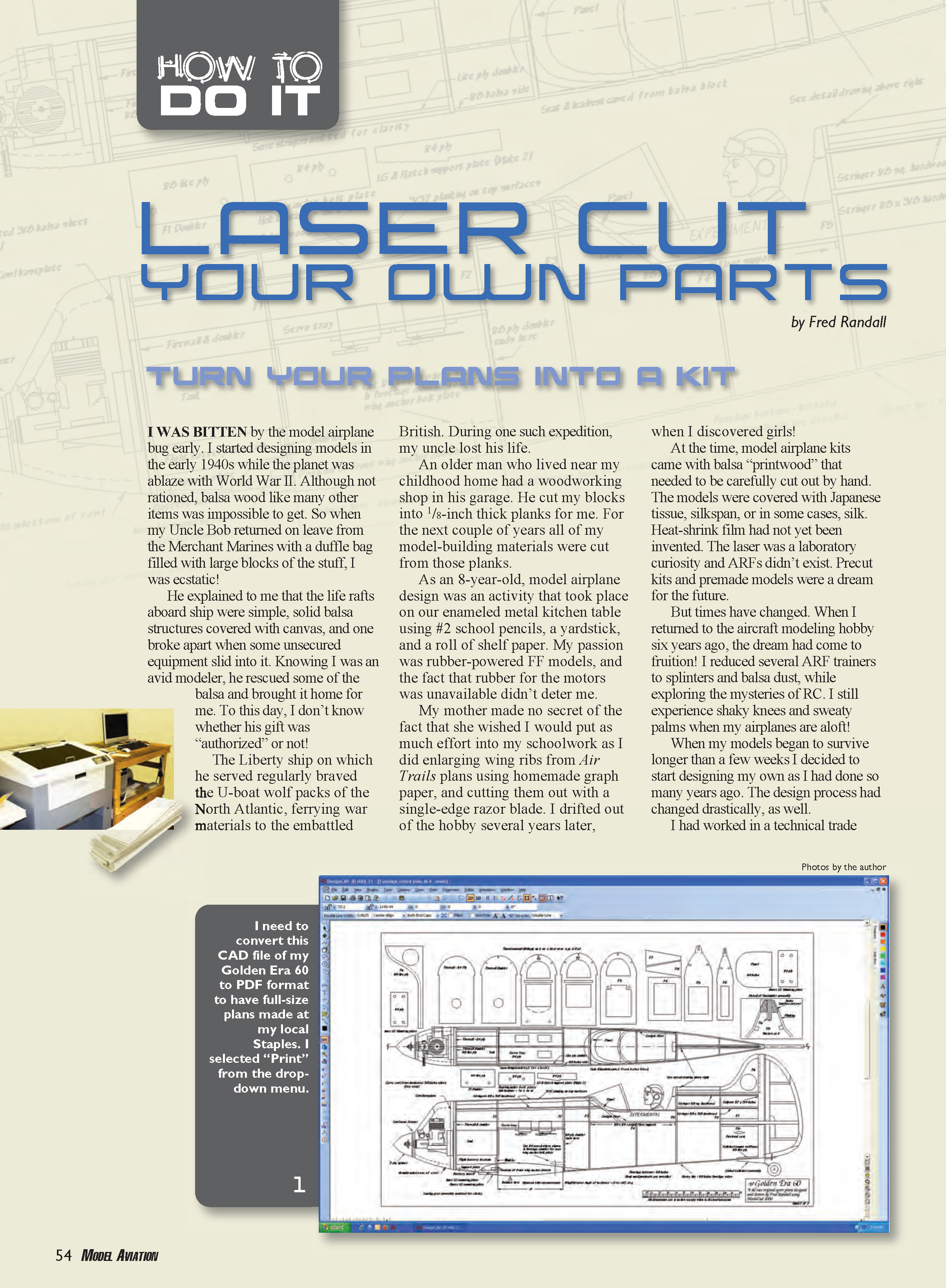 I had seen laser-cut parts used on ARFs and wished that I could find a way to have my parts cut for me. I delight in assembling a model aircraft, but fabricating a multitude of balsa and plywood parts is not as enjoyable.