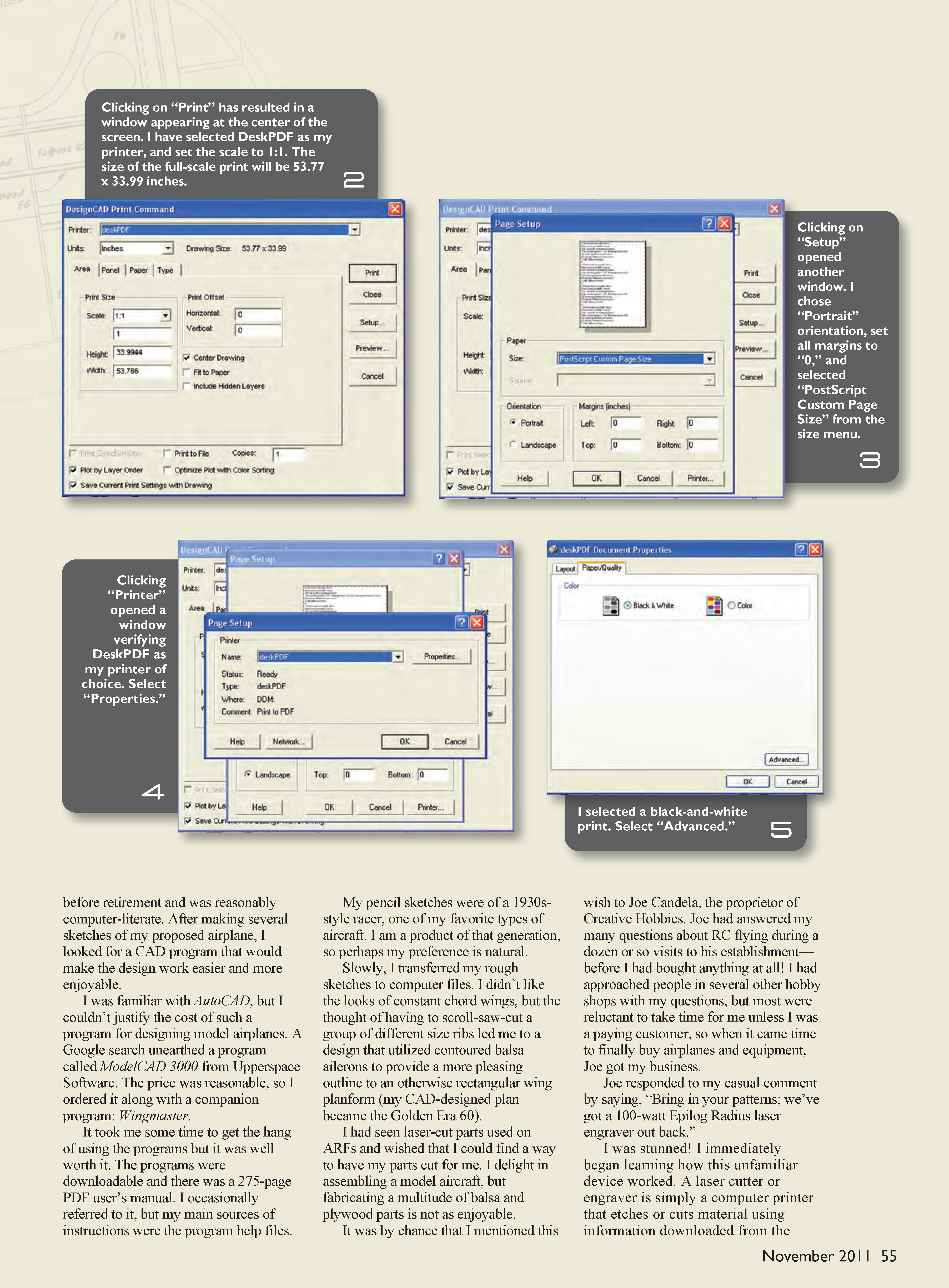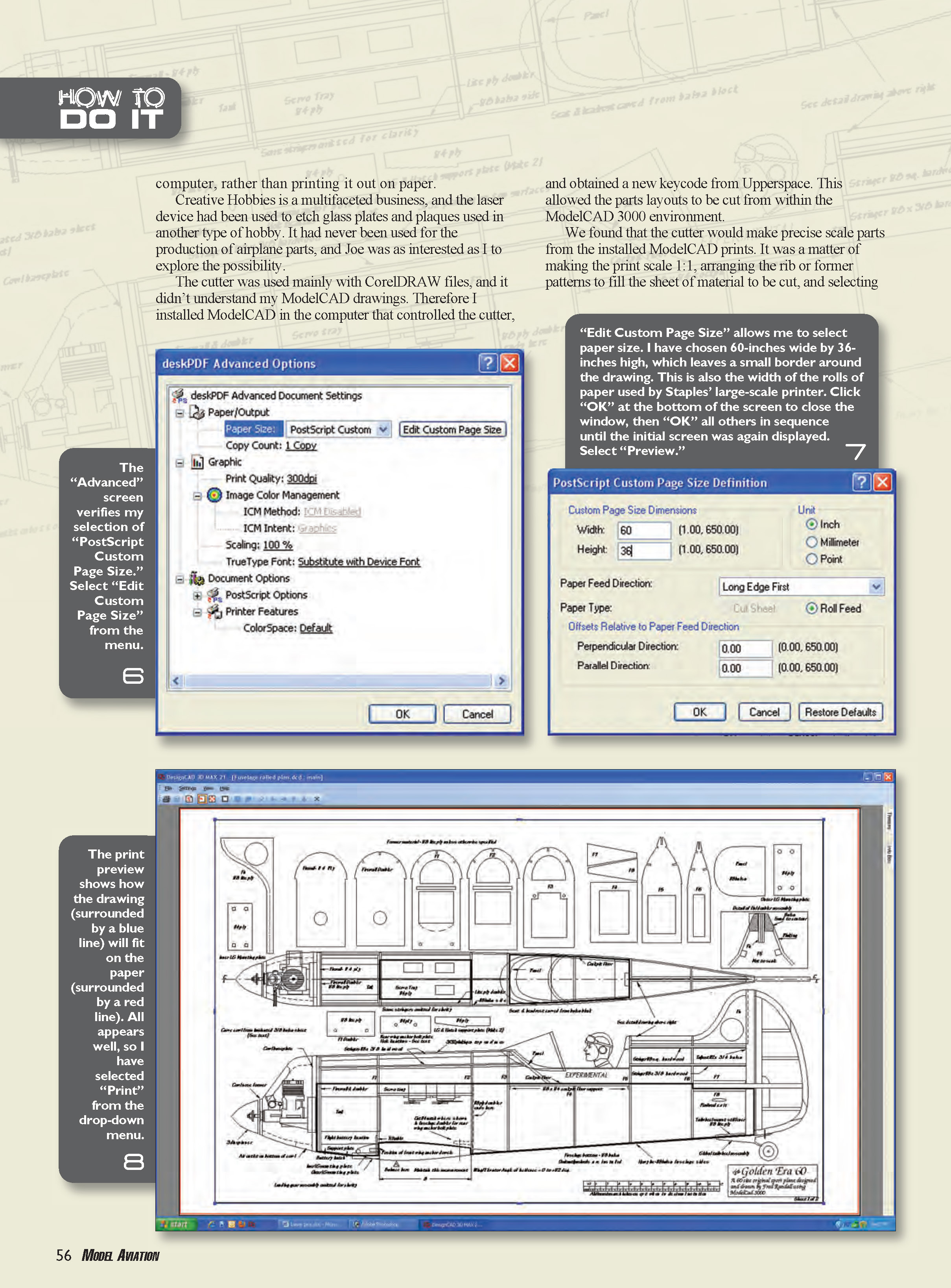 We found that the cutter would make precise scale parts from the installed ModelCAD prints. It was a matter of making the print scale 1:1, arranging the rib or former patterns to fill the sheet of material to be cut, and selecting the Epilog laser cutter as the printer of choice.