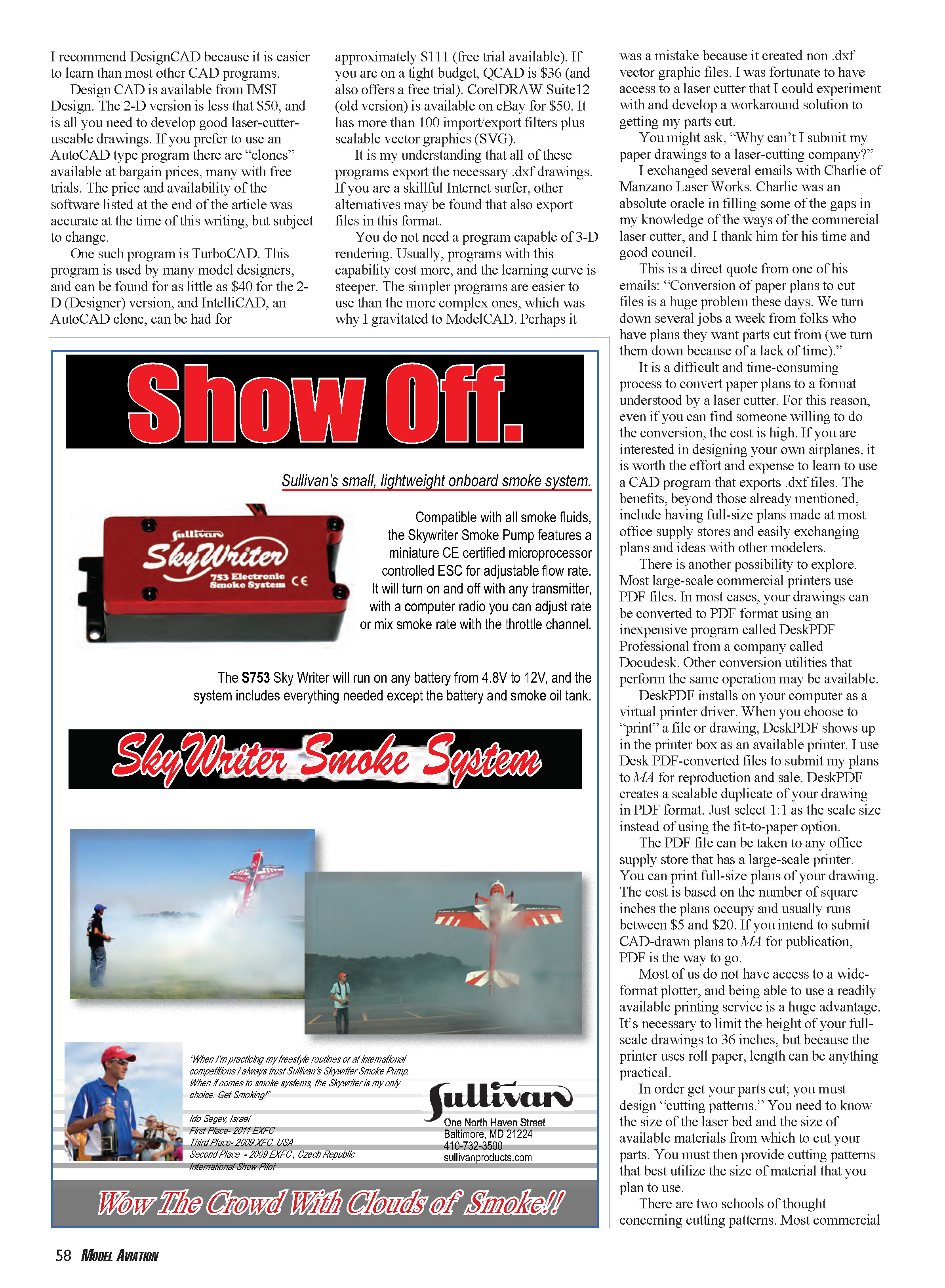 Although ModelCAD 3000 is still available, its exported .dxf conversions leave much to be desired. Because of this, and because of its increased capability, I have switched to DesignCAD v21. This program functions like ModelCAD and didn’t require learning new procedures; however, it allows direct import and export of AutoCAD readable .dwg and .dxf drawings. I can also import and update my earlier ModelCAD drawings. I recommend DesignCAD because it is easier to learn than most other CAD programs.