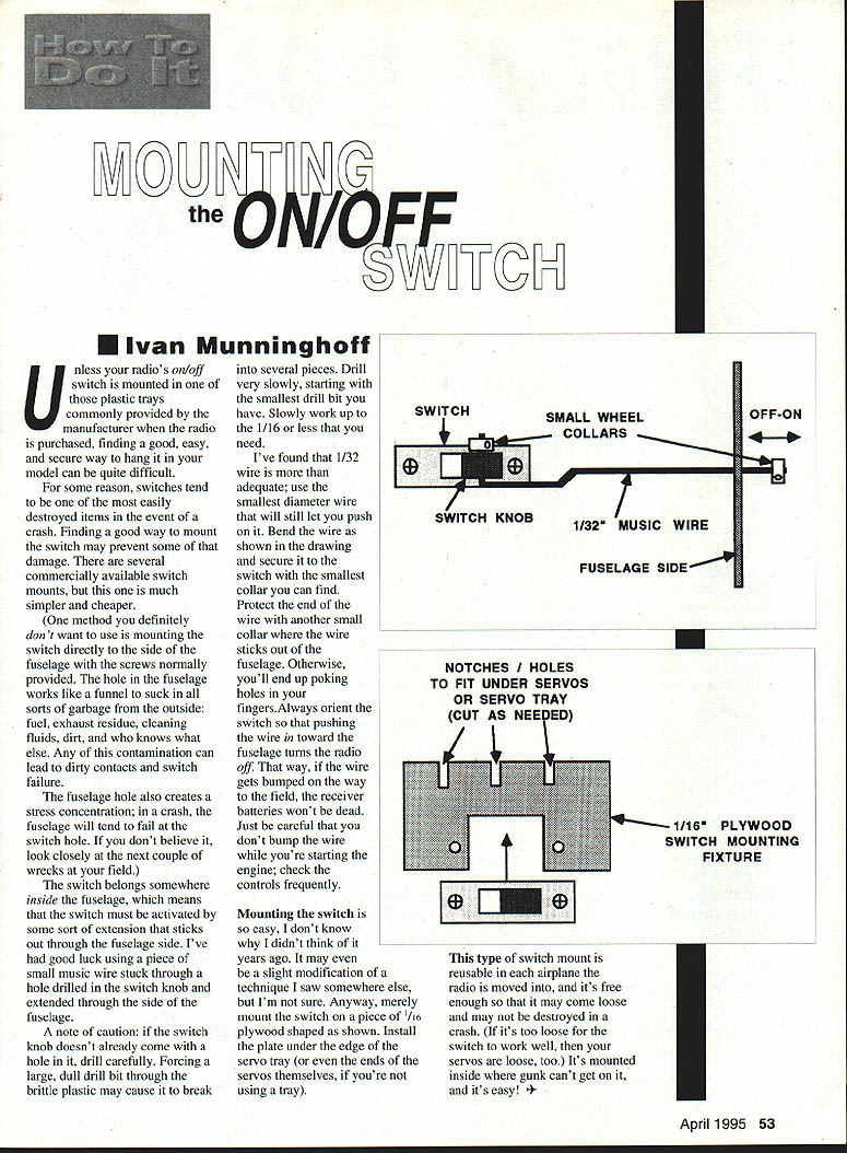 the~ U Ivan Munninghoff Unless radios on/off switch mounted plastic trays commonly provided manufacturer radio purchased finding good easy secure way hang model can quite difficult some reason switches tend easily destroyed items event crash Finding good way mount switch may prevent some damage several commercially available switch mounts much simpler cheaper method definitely dont want use mounting switch directly side fuselage screws normally provided hole fuselage works like funnel suck sorts garbage outside fuel exhaust residue cleaning fluids dirt knows what else Any contamination can lead dirty contacts switch failure fuselage hole also creates stress concentration crash fuselage will tend fail switch hole dont believe look closely next couple wrecks field switch belongs somewhere inside fuselage means switch must activated some sort extension sticks out through fuselage side Ive good luck using piece small music wire stuck through hole drilled switch knob extended through side fuselage note caution switch knob doesnt already come hole drill carefully Forcing large dull drill bit through brittle plastic may cause break several pieces Drill very slowly starting smallest drill bit have Slowly work up 1116 less need Ive found 1/32 wire adequate use smallest diameter wire will still let push Bend wire shown drawing secure switch smallest collar can find Protect end wire another small collar wire sticks out fuselage Otherwise youll end up poking holes fingersAlways orient switch pushing wire toward fuselage turns radio off way wire gets bumped way field receiver batteries wont dead Just careful dont bump wire youre starting engine check controls frequently Mounting switch easy dont know didnt think years ago may slight modification technique saw somewhere else Im sure Anyway merely mount switch piece i/is plywood shaped shown Install plate under edge servo tray ends servos themselves youre using tray SWITCHSMALL WHEELOFF-ON COLLARS f SWITCH KNOB 1132M MUSIC WIRE FUSELAGE SIDE~ NOTCHES HOLES TO FIT UNDER SERVOS OR SERVO TRAY CUT S NEEED I /16 PLYWOOD L2J Li H MOUNTING @ zm] type switch mount reusable airplane radio moved its free enough may come loose may destroyed crash its too loose switch work well servos loose too Its mounted inside gunk cant get its easy l 1995 53