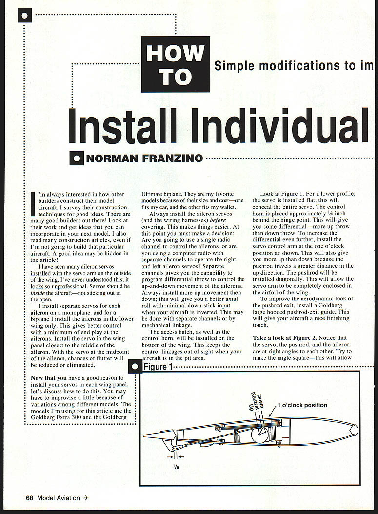fl Now have good reason install servos wing panel lets discuss may have improvise little because variations among different models models Im using article Goldberg Extra 300 Goldberg Im always interested other builders construct model aircraft survey construction techniques good ideas good builders out Look work get ideas can incorporate next model also read construction articles Im going build particular aircraft good idea may hidden article have seen aileron servos installed servo arm outside wing Ive never understood looks unprofessional Servos should inside aircraftnot sticking out open install separate servos aileron monoplane biplane install ailerons lower wing gives better control minimum end play ailerons Install servo wing panel closest middle aileron servo midpoint aileron chances flutter will reduced eliminated Simple modifications im Look Figure 1 lower profile servo installed flat will conceal entire servo control horn placed approximately 1/8 inch behind hinge point will give some differentialmore up throw down throw increase differential further install servo control arm oclock position shown will also give up down because pushrod travels greater distance up direction pushrod will installed diagonally will allow servo arm completely enclosed airfoil wing improve aerodynamic look pushrod exit install Goldberg large hooded pushrod-exit guide will give aircraft nice finishing touch Ultimate biplane favorite models because size costone fits car other fits wallet Always install aileron servos wiring harnesses before covering makes things easier point must make decision Are going use single radio channel control ailerons using computer radio separate channels operate right left aileron servos Separate channels gives capability program differential throw control up-and-down movement ailerons Always install up movement down will give better axial roll minimal down-stick input aircraft inverted may done separate channels mechanical linkage access hatch well control horn will installed bottom wing keeps control linkages out sight aircraft pit area IFiaure 1 Take look Figure 2 Notice servo pushrod aileron right angles other Try make angle squarethis will allow 00 &1 oclock position -iK 1/8 68 Model Aviation all Individual fl NORMAN FRANZINO prove models appearance aerodynamics Aileron Servos [v32][b-1-10-1-10]] transfer maximum amount offrom U-shaped blocks Simply hook theFigure 2 Drill mounting holes power servo aileron andtool under servo grommets lift themount horn Install servo arm will prevent binding linkagesservo up outone oclock angle shown Figure 1 Figures 2 3 show way re 4 shows more-conventional control rod installed can install servo U-shapedinstallation servo screwed inthe horn servo arm Youll have block sized fit servo grommetsplace wing panel narrow youcut slot wing panel slot servo brass eyelets /32 plywood iswont able get screwdriver thecompartments removable cover used reinforce U-shaped blockscrew heads reach servo screws berg Extra 3001 slot Two hold-down plates installed thebedplate must removable oftenthe trailing-edge wing panel tops U-shaped block will hold theits held place screws Ive usedGoldberg Ultimate slot servo placeboth methods successfullyremovable cover Install Goldberg large Epoxy U-shaped block 3/33hooded pushrod exit guide after cover Lite Ply bedplate bedplate shaped toPlace control horn approximately /sthe model fit models wing panel thisinch past hinge point aileron ~icjure 4 configuration bedplate will have toBefore drilling hole sure ther removed can epoxy bedplate toassembly right angle see inside wing panel Notice the. coat-hanger tool shown Figure 2 Thisirlpure 3 will help remove servo 7 Ficiure2 32][b279201024817400]] [v33][b-1-10-1-10]]I LI ** 77 -I- 0 0 [1 V L Servo Hold 1/32 Lite Plate 1/4LIte Ply 1/32 Lite Ply /32 Lite Ply Shaped Fit Wing Panel Line Art Author Graphc Design Heather Erdahi October 1996 69 THE GOLDEN ERA OF AIR RACING LIVES NOW YOU CAN OWN COLLECTION OF THE FAMOUS RACING PLANES OF THE 30S LIKE THE GEE BEE Z GEE BEE R1 HALL BULLDOG WEDELL WILLIAMS AND CAUDRON RACER SCHOENFELOT FIRECRACKER ALL HIGHLY DETAILED 1/32 SCALE KITS SEND SASE FOR ILLUSTRATED ORDER FORM $300 FOR CATALOG WILLIAMS BROS INC 181 PAWNEE ST SAN MARCOS CA 92069 SCALE EDO FLOATS servo compartments removable cover made Lite Ply After shape fit wing panel cut out center panel reduce its weight Install wedge corner panel opening secure cover wing Goldberg #2 x /8 sheet metal screws get Lite Ply wooden winecarrying cases get holidays Dont throw outthey come handy have decided install both servos radio channel will need Y connector Now time install wires common method aileron-servo control installation Another method servo control can done computer radios using aileron differential feature aileron servo connected channel other aileron servo connected channel seven will require two extension cords very careful install wingdo switch connectors Mark well could lose aircraft its first flight Always double-check models aileron direction before flying about covers subject individual aileron servos hope have learned something youve learned just new thing time has wasted Keep axial rolls nice level an Franzino 373 W Cortland Ave Oceanside NY 11572 What want want Fast ordering high fill rate quick delivery Friendly helpful knowledgeable staff Questions about products well give straight scoop Products extensively tested before placed market can have confidence SIG item will live up its reputation Forty-five years experience model aviation products SIG will support product next week next month next year manufactured highest possible standards top quality materials Products will perform described what sell works Well help make products successful after sale 5 IGs SIG dealers customers know dealing SIG straightforward youll get honest knowledgeable answers questions Competitively priced quality products perform satisfy modeler Modem designs produced advanced technology ava