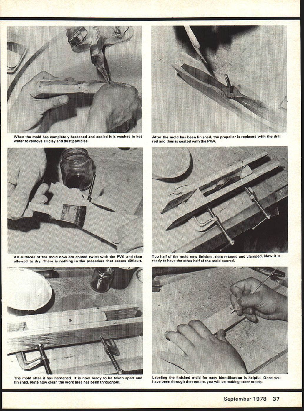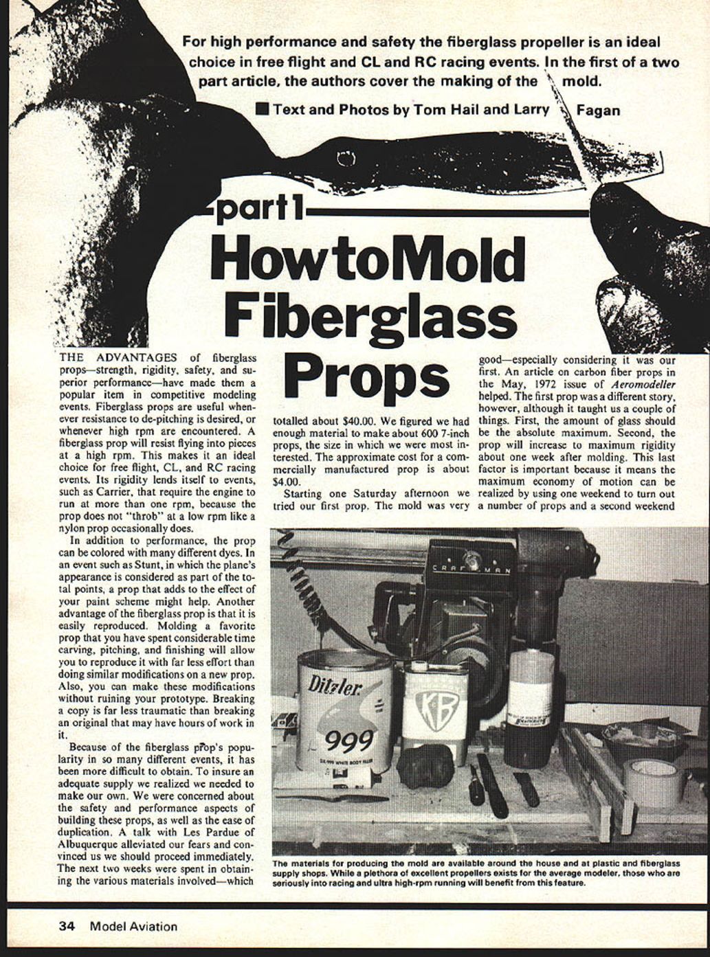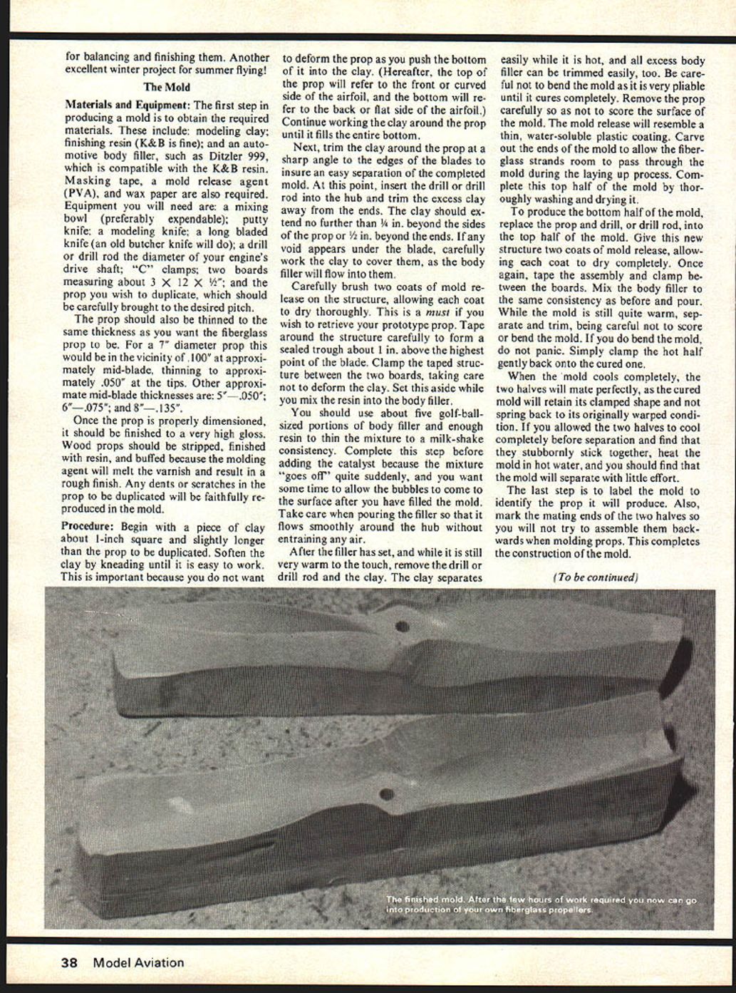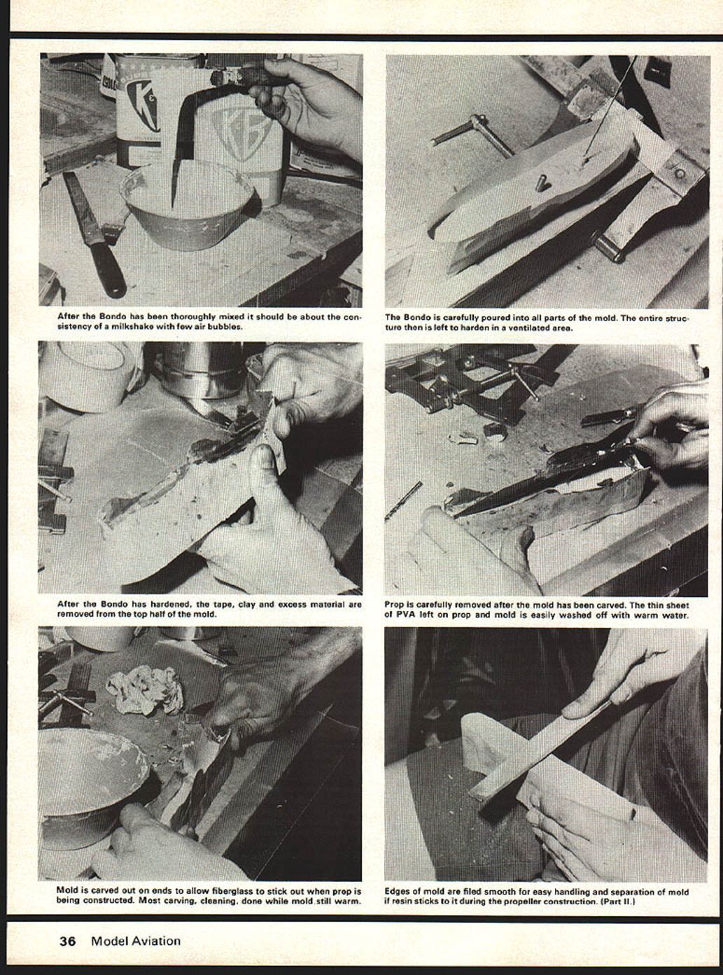 For high performance safety fiberglass propeller ideal ice free flight CL RC racing events first two part article authors cover making \ mold U Text Photos Tom Hail Larry \Fagan * 9 THE ADVANTAGES fiberglass propsstrength rigidity safety su perior performancehave made popular item competitive modeling events Fiberglass props useful ever resistance dc-pitching desired whenever high rpm encountered fiberglass prop will resist flying pieces high rpm makes ideal choice free flight CL RC racing events Its rigidity lends itself events such Carrier require engine run rpm because prop does throb low rpm like nylon prop occasionally does addition performance prop can colored different dyes event such Stunt planes appearance considered part tal points prop adds effect paint scheme might help Another advantage fiberglass prop easily reproduced Molding favorite prop have spent considerable time carving pitching finishing will allow reproduce far less effort doing similar modifications new prop Also can make modifications ruining prototype Breaking copy far less traumatic breaking original may have hours work Because fiberglass pops popu larity different events has difficult obtain insure adequate supply realized needed make own concerned about safety performance aspects building props well ease duplication talk Les Pardue Albuquerque alleviated fears con vinced us should proceed immediately next two weeks spent obtain ing various materials involvedwhich VE goodespecially considering first An article carbon fiber props May 1972 issue Aeromodeller helped first prop different story however although taught us couple things First amount glass should absolute maximum Second prop will increase maximum rigidity about week after molding last factor important because means maximum economy motion can realized using weekend turn out number props second weekend 34 Model Aviation HowtoMold U Fiberglass Props totalled about $4000 figured enough material make about 600 7-inch props size terested approximate cost com mercially manufactured prop about $400 Starting Saturday afternoon tried first prop mold very Ins maxerisas vor praaucng ins mou ars uvsaule around house plastic fiberglass supply shops plethora excellent propellers exists average modeler seriously racing ultra high-rpm running will benefit feature After PVA mold release has completely dried tape around struc ture making mold hold Bondo After clay has taped clamp two pieces wood along sides keep tape bulging out mold poured September 1978 35 clay has shaped accommodate prototype prop will used form mold blank will form top portion mold knife clay carefully sliced away edges prop sharp angles clay smoothed keep flaws Out mold After clay trimmed smoothed piece drill rod placed through hub prop creating hole mold poured entire structure including drill rod coated two coats PVA PVA water-based mold release Mold carved out ends allow fiberglass stick Out prop being constructed Most carving cleaning done mold still warm Edges mold filed smooth easy handling separation mold resin sticks during propeller construction Part II 36 Model Aviation After Bondo has bean thoroughly mixed should about con sistency milkshake few air bubbles Bondo carefully poured parts mold entire struc ture left harden ventilated area After Bondo has hardened tape clay excess material removed top half mold Prop carefully removed after mold has oeen carvea ne tnIn sneet PVA left prop mold easily washed off warm water Labeling finished mold easy identification helpful Once have through routine will making other maids September1978 37 mold has completely hardened cooled wasned water remove clay dust particles After mold has finished propeller replaced drill rod coated PVA surfaces mold now coated twice PVA allowed dry nothing procedure seems difficult top halt mold now finished retaped clamped Jaw hIS ready have other half mold poured mold after has hardened now ready taken apart finished Note clean work area has throughout balancing finishing Another excellent winter project summer flying Mold Materials Equipment first step producing mold obtain required materials include modeling clay finishing resin K&B fine auto motive body filler such Ditzler 999 compatible K&B resin Masking tape mold release agent PVA wax paper also required Equipment will need mixing bowl preferably expendable putty knife modeling knife long bladed knife old butcher knife will drill drill rod diameter engines drive shaft C clamps two boards measuring about 3 X 12 X wish duplicate should carefully brought desired pitch prop should also thinned same thickness want fiberglass prop 7 diameter prop would vicinity 100 approxi mately mid-blade thinning approxi mately 050 tips Other approxi mate mid-blade thicknesses 5050 6075 8 135 Once prop properly dimensioned should finished very high gloss Wood props should stripped finished resin buffed because molding agent will melt varnish result rough finish Any dents scratches prop duplicated will faithfully re produced mold Procedure Begin piece clay about 1-inch square slightly longer prop duplicated Soften clay kneading until easy work important because want deform prop push bottom clay Hereafter top prop will refer front curved side airfoil bottom will re fer back flat side airfoil Continue working clay around prop until fills entire bottom Next trim clay around prop sharp angle edges blades insure easy separation completed mold point insert drill drill rod hub trim excess clay away ends clay should ex tend no further nd sides prop nd ends void appears under blade carefully work clay cover body filler will flow Carefully brush two coats mold re lease structure allowing coat dry thoroughly must wish retrieve prototype prop Tape around structure carefully form sealed trough about 1 above highest point blade Clamp taped struc ture between two boards taking care deform clay Set aside mix resin body filler should use about five golf-ballsized portions body filler enough resin thin
