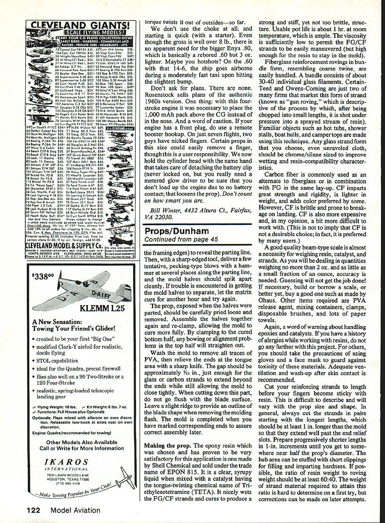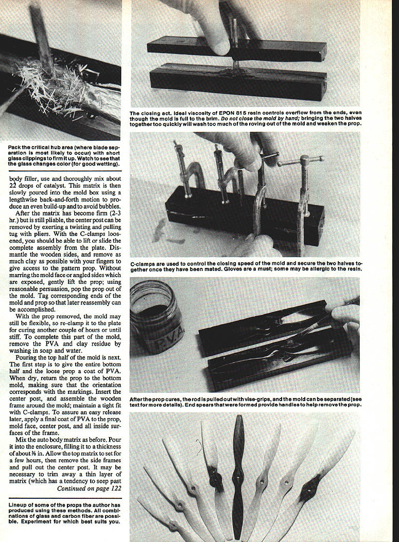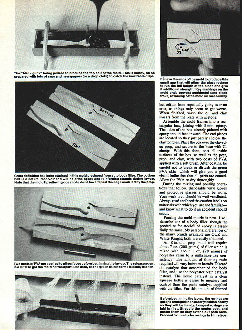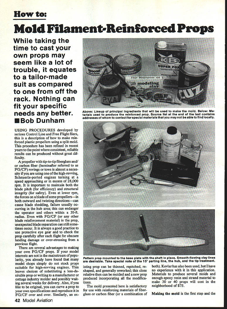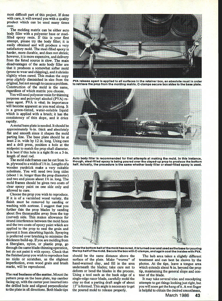 How Mold FalansentReinforced Props taking time cast own props may seem like lot trouble equates tailor-made suit compared off rack Nothing can fit specific needs better EBob Dunham USING PROCEDURES developed serious Control Line Free Flight fliers description make rein forced plastic propellers using split mold procedure has refined recent years point consistent reliable results can produced great dif ficulty propeller tip-to-tip fiberglass carbon fiber hereinafter referred FG/CF rovings tows almost neces sity using high-revving Schnuerle-ported engines turning speed approaching excess 28000 rpm important maintain both blade pitch efficiency structural integrity safety lower rpm forces blade some propellersin both outward twisting directionscan cause blade shedding failure usually oc curring hub area can endanger operator others within 30-ft radius FG/CF other blade reinforcement material prop unexpected blade separation can still some times occur always good practice use protective eye gear check prop carefully after flight obscure landing damage over-stressing previous flight several advantages making own FG/CF props model interests mainstream popu larity already have found model shops simply stock props suitable high-revving engines leaves choices substituting less-de sirable prop writing manufacturer cottage industry molder possibly wait ing several weeks delivery Also like original can carve prop own specifications reproduce FG/CF over over Similarly ex 42 Model Aviation isting prop can thinned repitched re shaped generally reworked close relative can molded new prop produced incorporating modifica tions mold presented satisfactory use reinforcing materials fiber glass carbon fiber combination Making mold first step both Keviar has also used have no experience application Materials produce several molds enough epoxy resin strand material make 30 40 props will cost neighborhood $75 Above Lineup principal Ingredients will used make mold Below Ma terials used produce reinforced prop Source list end text contains addresses contact special materials may able find locally Pattern prop mounted base piate shaft place Smooth-flowing clay lines desirable Take special note 150 parting line hub tip treatment difficult part project done care will reward quality product can used times over molding matrix can either auto body filler polyester base steelfilled epoxy resin first attempt please try body filler easily obtained will produce very satisfactory mold steel-filled epoxy harder durable does shrink however expensive delivery listed source slow main disadvantages auto body filler produces somewhat softer mold prone wear chipping shrinks slightly cured makes copy prop slightly diminished size original enough cause problem Construction mold same regardless matrix choose will need polyester resin thinning purposes polyvinyl alcohol PVA re lease agent PVA vital its importance will become apparent read along green-tinted water-soluble liquid applied brush has consistency thin dope dries rapidly metal base plate needed should approximately -in thick absolutely flat smooth since shapes mold parting line base plate should least 2 wide 12 long Using care drill press position hole midpoint match prop shaft diameter best hole tight fit 3-in length steel rod mold side frames can cut plywood awidthof 1 4 Lengths wooden yardstick make very suitable substitute will need two long sides about 1 longer prop diameter two end pieces about 1 long mold frames should given two coats clear epoxy paint side allowed cure Choose prop wish reproduce varnished wood variety finish must removed sanding washing acetone suggest further thin prop blades sanding about five thousandths away top curved side makes allowance strand interference between mold faces two coats epoxy paint applied prop seal grain prevent absorbing liquids Spraying preferred over brushing minimize thickness build-up molding fiberglass nylon plastic prop go through same blade-thinning operation paint epoxy Check finished prop wish reproduce has no nicks scratches slightest imperfection wood grain brush marks will reproduced real business matter Mount pattern prop base plate top camber facing up center post inserted drilled hole aligned perpendicular plate directions Both blade tips should same distance above surface plate Make worms hand-warmed clay fill area underneath blades take care deform bend blades process Using tool such back edge single-edge razor blade carefully mold clay parting draft angle about 15 formed angle necessary get poured mold release properly hub area takes slightly different treatment can best shown photos tips leave tongue area extends about nd prop tip maintaining general slope con tour blade may take several tries resculpting attempts get things looking just right will soon get hang wet finger helpful obtain desired smoothness March 1986 43 PVA release agent applied surfaces retainer box absolute must order retrieve prop molding matrix C-clamps secure box sides base plate Auto body filler recommended first attempts making mold Instance though steel-filled epoxy being poured over clayed-up prop produce bottom half Actually procedure same whether body filler steel-filled epoxy used Once bottom half mold has cured isturned overand used asthe baseforpouring top half mold Secure box C-clamps again coat insides PVA black gunk being poured produce top half mold messy prepared lots rags newspapers drop cloth catch Inevitable drips refrain repeatedly going over area things seem get worse finished wash oil clay smears plate acetone Assemble mold frames rec tangular box joining 5-min epoxy sides box already painted epoxy should face inward end pieces located just barely enclose clay tongues Place box over clayed up prop secure base Cclamps done coat inside surfaces box well post prop clay two coats PVA applied soft brush After coating careful break disturb green PVA skinwhich will give good visual indication parts coated Allow PVA dry thor