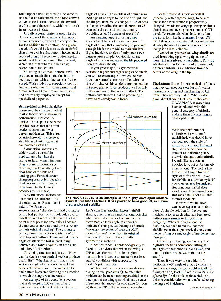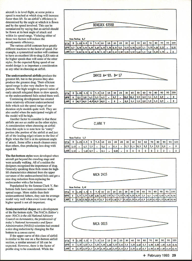 Mv ARTICLE Primer Aerodynamics September 1992 issue led us basic aero dynamic principles object new article simple Once understand functions aerodynamics next step learning apply produce type flight desire could free flight control line radio controleach its facets Applying basic aero dynamic laws can compared building house first lay down foundation can build variety configurations However solid foundation whatever erected thereon will ultimately fail objective explain balance performance factors need provide solid jumping-off point obtaining ultimate flight performance want will assume studied Primer Aerodynamics now understand air reacts various aircraft shapes pass through producing work process described basic force arrangements FAs fact establish flight envelope design Obviously science involved producing FA mysteries science will explained two-part article first step project determine type flight desired else will relate objective becomes para mount approach design duration model would far different speed model example Designing aircraft probably worlds greatest act compromise practically aspect design intertwined some other aspect Thus have continually making decisions important decision made favors overall objective have established No matter desired type flight youre aiming first step set wing its efficient angle attack angle incidence known always measured relative line offlight will rest settings Once angle established becomes sacred design other adjustments done keep wing flying predetermined angle question determining wings efficient angle good modelers since us have access engineering data needed accurately determine setting S flight surfaces generally referred airfoils respect models usually apply term shape revealed take cross section particular flight surface great airfoil cross sections vary greatly contours thus efficient angle attack produce liftand process drag Lift positive force interested drag negative undesirable Besides necessity over coming gravity greatest detriment aircraft efficiency drag Reducing drag productive simplest cheapest path improved performance Generally speaking aircrafts airfoils produce major portion total drag Thus becomes important choose correct airfoil shape desired flight objective example airfoil best suited duration model would have far different contour designed maximum speed amount drag produced two airfoils would also considerably different Airfoil contour shapes have under continual development since Wright brothers put first flat plate wind tunnel soon found curved surface vastly superior flat plate respects Airfoil science has become very sophisticated today have curvatures specially suited almost design objective gains study factor modelers point view have too very complex flight objectives needs can filled relatively few different types classes airfoil contours Basically call types undercambered flat-bottom semisymmetrical symmetrical all-important lifting ability well drag production various airfoil sections pretty well conforms sequence listing undercambered sections produce liftand greatest drag airfoils have point will operate maximum efficiency point occurs somewhere usable angle attack range extends zero lift stall angle varies speed flying respect angle attack point maximum efficiency occurs ratio lift drag greatest As airfoils flown increasing speeds amounts lift drag increase square increase speed 28 Model Aviation author designed simple electric-powered duration model uses complex force arrangement control power provide minimum sink rate glide Applying elementary aerodynamic concepts will help design improve model airplane U Hal deBolt aircraft level flight some point speed reached drag will increase faster lift So airfoils efficiency determined angle flown speed involved can summarized saying airfoil should flown its best angle attack within its speed range Violating either two factors will reduce aerodynamic efficiency various airfoil contours have greatly different reactions factor speed example symmetrical section will continue have excellent lift-to-drag LiD ratio far higher speeds will some other styles So expected flying speed model design important consideration other choosing airfoil undercambered airfoils produce greatest lift process also produce greatest drag efficient speed range also very shallow com parison high weight-to-power ratios early aircraft relegated slow speeds undercambered foils suited well Continuing development has created some relatively efficient undercambered foils suit speed range duration-style models quite well also useful anticipated weight model will high Another factor consider airfoils stable other styles consideration choosing airfoil style note its entry portion portion airfoil just aft leading edge relates line flight foil its optimum angle attack Some offer much cleaner entry others thus producing less drag equal lift flat-bottom styles developed aircraft got beyond crawling stage actually walking sudden designers recognized importance drag Generally speaking foils retain highlift characteristics obtained upper curvature undercambered foils get nice drag reduction replacing undercamber flat bottom Popularized famous Clark Y flatbottom foils have seen continuous wide spread usage stable undercambered fathers suit average model very well lower drag higher speed all-important Semisymmetrical shapes development flat-bottom style NACA Editors note NACA old National Advisory Council Aeronautics predecessor todays National Aeronautics Space Administration [NASA] scientists created nice drag reduction changing flat bottom convex curve upper curve class airfoil similar flat-bottom airfoil section similar amount lift can expected However factor profile drag considered [LWRI 07 ooI 015 IozI 076 iizl 185 Izs 292 5231 351 3651 35 30 zzl iisl RI 0 I47I08I0I09I0SI 101 I08114118120I19115I091 Ic CLARK Y Muse RadIus 15 0 125125151 75110152025304015016070809095 100 UPR 345 65 79 I96114 117 114 