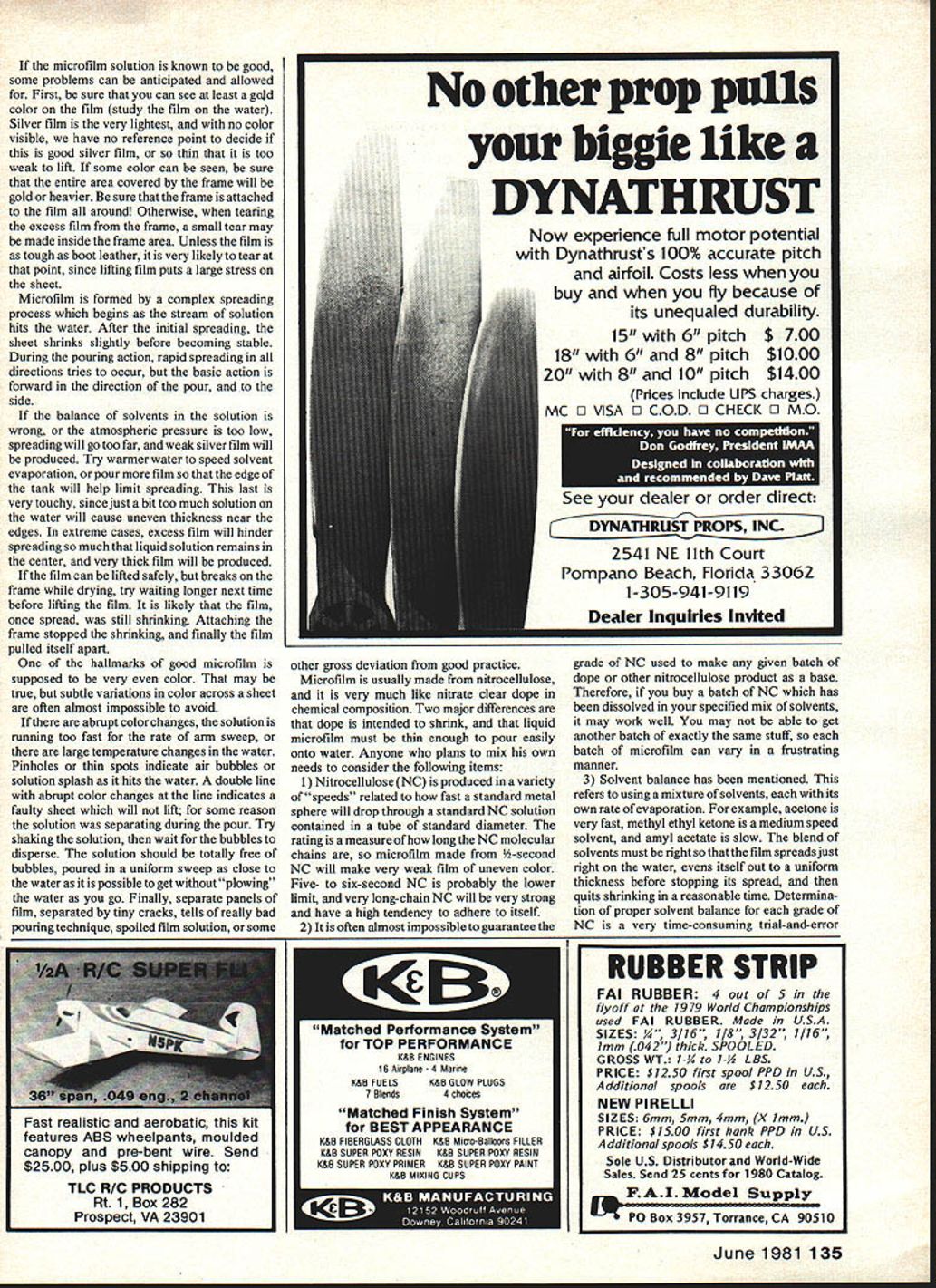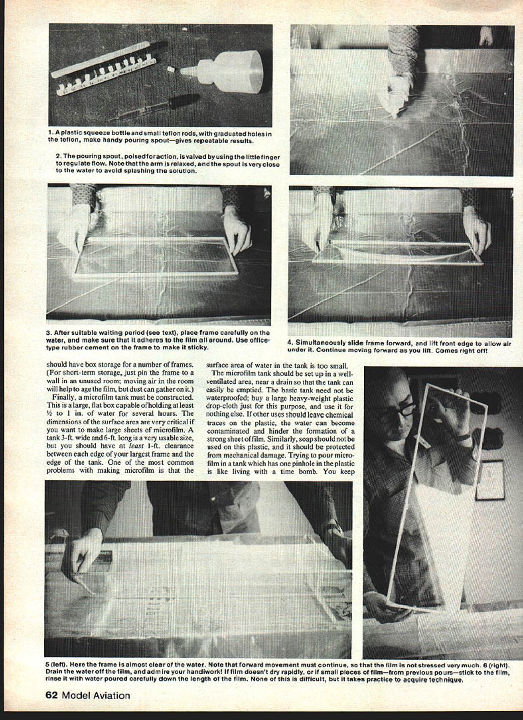 ne ultImaTe mcroriim-covered model huge600 sq area mike jobwas used Erv Rodemskystanding 1 974toran unsuccessful assault FAI Indoor World Record Rodemsky current Indoor World Champion plc kneeling L-R Jiri Kalina Karel Rybecky successful Indoor model flying need know properly make microfilm Indoor contributing editortakes mystery out highly important subject@ Bud Tenny IT HAS BEEN noted Indoor modeling hard just different other kinds model building has seemed difficult After Indoor modeling consists just three disciplines picking wood cutting wood moving slowly area Indoor building different almost incomprehensible microfilm-covered models high technology high performance end Indoor modeling remains real mystery build Easy B HLG Pennyplanes Peanut Scale make microfilm store cover etc whole area art just like other art simple things can improve success rest art remains doing often enough develop skill feel Microfilm covering Indoor models made pouring liquid water allowing thin film form film removed water some sort frame allowed age part drying process used cover Indoor model Put like seems like simple enough process rest simply technique art can learned Three basics absolutely necessary achieve simple process described above First must have microfilm solution pour water recommend Indoor beginner mix own solution unless has training chemistry dogged determination unlimited time about later some sources microfilm other Indoor specialty items listed end article second basic requirement making micro film sheet set strong frames can made balsa other wood Strong frames mean joints secure frame will hold its shape corners must remain square weight frame should make sag held face down horizontal position Square -in balsa wood can used frames up 6 7 wide up 18 long Square h-in stock minimum frames up 8 x 36 longer frames should heavier Unless plan use film fairly soon after has poured can arrange safe storage frames some other way June 1981 61 3 After suitable waiting period see text place frame carefully water make sure adheres film around Use officetype rubber cement frame make sticky should have box storage number frames short-term storage just pin frame wall unused room moving air room will help age film dust can gather Finally microfilm tank must constructed large flat box capable holding least 1 water several hours dimensions surface area very critical want make large sheets microfilm tank 3-ft wide 6-ft long very usable size should have least 1-ft clearance between edge largest frame edge tank common problems making microfilm surface area water tank too small microfilm tank should set up wellventilated area near drain tank can easily emptied basic tank need waterproofed buy large heavy-weight plastic drop-cloth just purpose use nothing else other uses should leave chemical traces plastic water can become contaminated hinder formation strong sheet film Similarly soap should notbe used plastic should protected mechanical damage Trying pour micro film tank has pinhole plastic like living time bomb keep 62 Model Aviation 1 plastic squeeze bottle smaii teflon rods graduated holes teflon make handy pouring spoutgives repeatable results 2 pouring spout poised foraction isyalved using little finger regulate flow Note arm relaxed spout very close water avoid splashing solution 4 Simultaneously siiue Trame TOrward lilt tront edge allow air under Continue moving forward lift Comes right off 5 left frame almost clear water Note forward movement must continue film stressed very much 6 right Drain water off film admire handiworkl film doesnt dry rapidly small pieces filmfrom previous poursstick film rinse water poured carefully down length film None difficult takes practice acquire technique wondering can finish pouring before leak gets big enough work through tank get floor Carefully dry plastic sheet after use fold loosely storage technique pouring microfilm also simple just need practice idea pour thin stream microfilm solution water getting liquid evenly distributed Dont start very edge tank dont pour such long stream solution spreading film has crowd outer edge tank Photo 1 shows handy pour spout greatly eases task uniform pouring top plastic squeeze bottle has cut away rest bottle spout has cut off until 3/16-in teflon rod tight fit end Anumberofdifferent pieces teflon cutoff drilled different size phnto shows interchangeable orifices used pouring spout made machinists drills between #30 #49 orifices stored simple rack keep sorted out use pour spout filled depth 1 orifice stoppered little finger Photo 2 shows spout held little finger covering orifice except film solution allowed flow reason pouring much film amount solution spout wont change appreciably empty solution Onto water hydraulic terms head liquid weight liquid above spout doesnt change very much rate flow doesnt change much either Now have pour spout will dispense uniform stream liquid other component smooth pour uniform sweeping motion over water Again refer Photo 2 note arm relaxed free move line across length tank Use water practice try get sweep across tank comfortable enough easy maintain uniform speed Practice starting flow unstopping orifice little finger stopping flow can repeatably start stop sweep about 8 10 end tank Lets discuss rest procedure Once sheet film has poured allow remain water few minutesthe exact time will differ somewhat different days different film solutions microfilm frame must made adhere film can pick up easiest way found brush coat rubber cement face frame will contact film water just before pouring film solvents will have evaporated cement before need frame Photo 3 shows frame being placed film lay flat film torn corner frame Once frame adheres film around check carefully push frame toward edge tank direction excess film bunches up Grab excess film tear loose frame Try avoid leaving tiny pieces film water might stick future sheets film Photo 4 shows start lifting sheet film rear frame has depressed slight