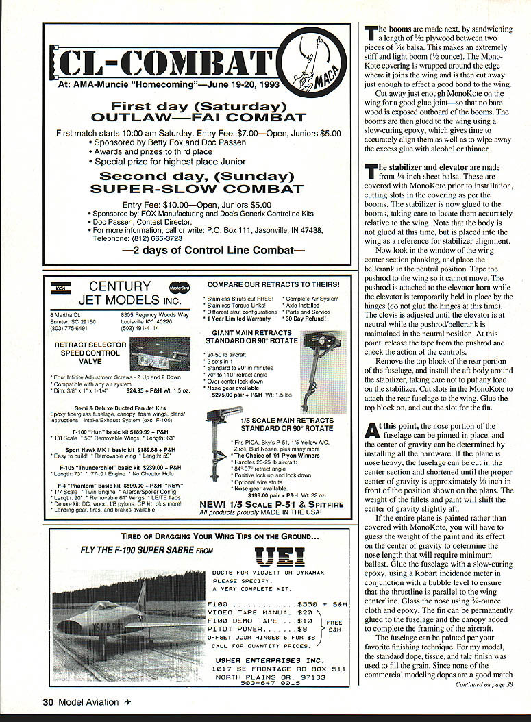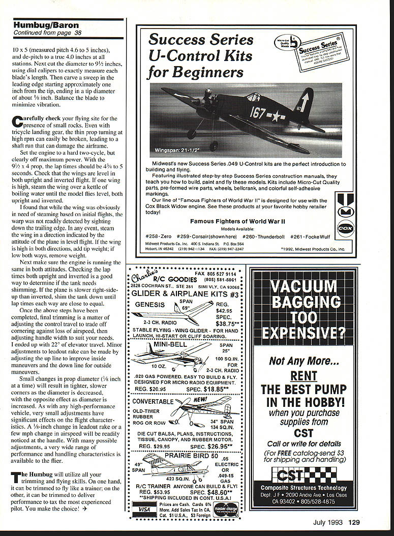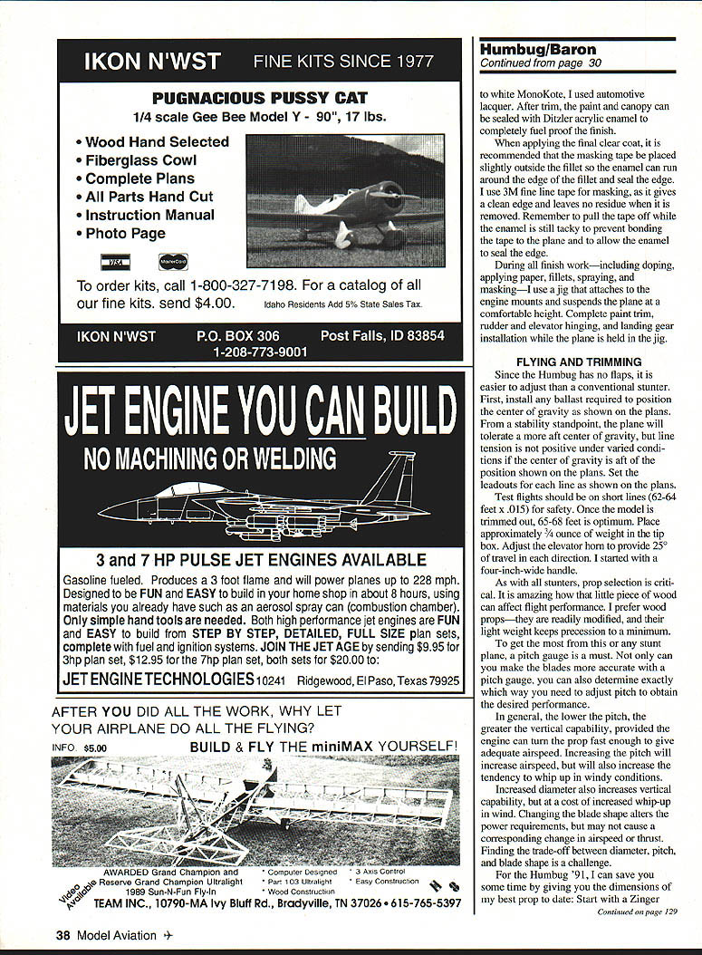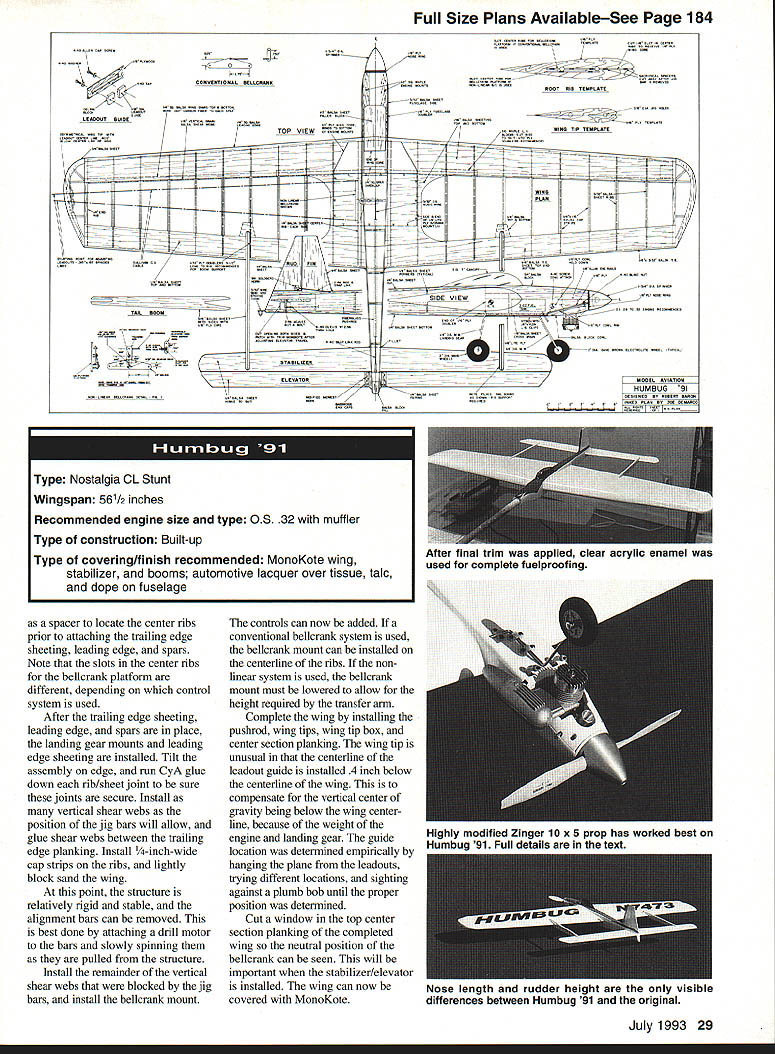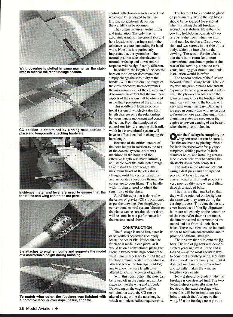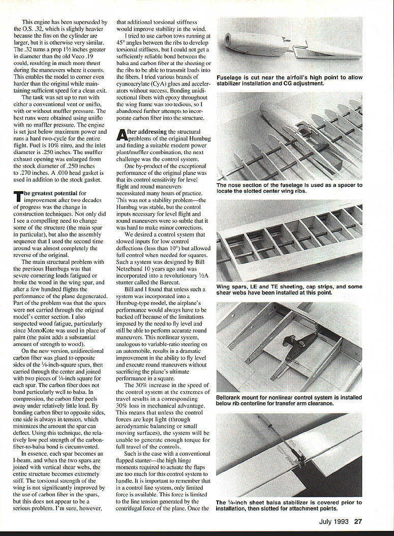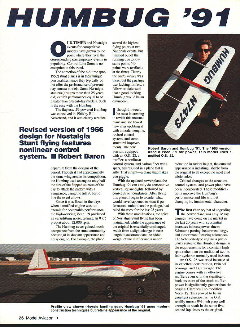 HUMBUG 91 OLD-TIMER Nostalgia events competitive models have grown point rival corresponding contemporary events popularity Control Line Stunt no exception trend attraction old-time pre 1952 stunt planes unique personalities since typically offer performance presentday contest models Some Nostalgia stunters designs 25 years old exhibit performance equal greater present-day models Such case Humbug flapless 19-powered Humbug conceived 1966 Bill Netzeband clearly radical Revised version 1966 design Nostalgia Stunt flying features nonlinear control system U Robert Baron departure designs period Though approximately same wing area its competition Humbug used engine half size flapped stunters day attack pattern vengeance using full 70 feet line event allows Since flown days muffled engine too anemic acceptable performance high-revving Veco 19 produced earsplitting noise turning 8 x 5 prop about 12000 rpm Humbug never galned much acceptance stunt community becauseof its deviant appearance noisy engine example plane scored highest flying points two Nationals events finished out running due low static points 40 points available time Clearly performance package lacking fact fellow modeler said good-looking Humbug would oxymoron thought would interesting revisit unusual plane see flew after updating modem engine revised control system some structural improve ments new version equipped withan OS 28a muffler nonlinear control system carbon fiber wing spars has resulted plane silly Thats righta plane makes giggle updated power plant Humbug 91 can easily consecutive vertical square eights followed consecutive hourglasses After flying plane began wonder what would have happened stunt per formance rather package ruled roost last 25 years modifications spirit Nostalgia Stunt flying has maintained appearance original essentially unchanged Aside slight change nose length accommodate added weight muffler minor reduction rudder height outward appearance indistinguishable original except avid aficionados Critical changes structure control system power plant have incorporated modifica tions improve Humbugs performance life changing its fundamental character first change upgrading power plant easy engines have come market last 20 years substantial increases horsepower due Schnuerle porting better metallurgy closer manufacturing tolerances Schnuerle-type engine partic ularly suited Humbug design requirement constant high rpm rather traditional two- four-cycle run normally used Stunt An OS 28 used because its excellent construction twin ball bearings light weight engine comes effective muffler significant back pressure stock muffler power significantly greater original Clarence Lee-modified Veco 19 proved excellent selection OS readily turns 91/2-inch prop well enough result same fivesecond lap times original 26 Model Aviation 4Robert Baron Humbug 91 1966 version used Veco 19 power model uses muffled OS 32 Profile view shows tricycle landing gear Humbug 91 uses modern construction techniques retains appearance original engine has superseded OS 32 slightly heavier because fins cylinder larger otherwise very similar 32 turns prop es greater diameter old Veco 19 could resulting much thrust during maneuvers counts enables model corner harder original main taining sufficient speed clean exit tank set up run either conventional vent uniflo muffler pressure best runs obtained using uniflo no muffler pressure engine set just below maximum power runs hard two-cycle entire flight Fuel 10% nitro inlet diameter 250 inches muffler exhaust opening enlarged stock diameter 250 inches 270 inches 010 head gasket used addition stock gasket T greatest potential improvement after two decades progress change construction techniques did see compelling need change some structure main spar particular also assembly sequence used second time around almost completely reverse original main structural problem previous Humbugs severe cornering loads fatigued broke wood wing spar after few hundred flights performance plane degenerated Part problem spars carried through original models center section also suspected wood fatigue particularly since MonoKote used place paint paint adds substantial amount strength wood new version unidirectionai carbon fiber glued opposite sides -inch-square spars carried through center joined two pieces -inch square spar carbon fiber does bond particularly well balsa compression carbon fiber peels away under relatively little load bonding carbon fiber opposite sides side always tension minimizes amount spar can deflect Using technique rela tively low peel strength carbonfiber-to-balsa bond circumvented essence spar becomes I-beam two spars joined vertical shear webs entire structure becomes extremely stiff torsional strength wing nor significantly improved use carbon fiber spars does appear serious problem Im sure however additional torsional stiffness would improve stability wind tried use carbon tows running 450 angles between ribs develop torsional stiffness could get sufficiently reliable bond between balsa carbon fiber sheeting ribs able transmit loads fibers tried various brands cyanoacrylate CyA glues acceler ators success Bonding unidi rectional fibers epoxy throughout wing frame too tedious abandoned further attempts incor porate carbon fiber structure fter addressing structural problems original Humbug finding suitable modern power plant/muffler combination next challenge control system by-product exceptional performance original plane its control sensitivity level flight round maneuvers necessitated hours practice stability problemthe Humbug stable control inputs necessary level flight round maneuvers subtle hard make minor corrections desired control system slowed inputs low control deflections less 100 allowed full control needed squares Such system designed Bill Netzeband 10 years ago incorporated revolutionary /2A stunter called Barecat Bill found unless such system incorporated Humbug-type model airp