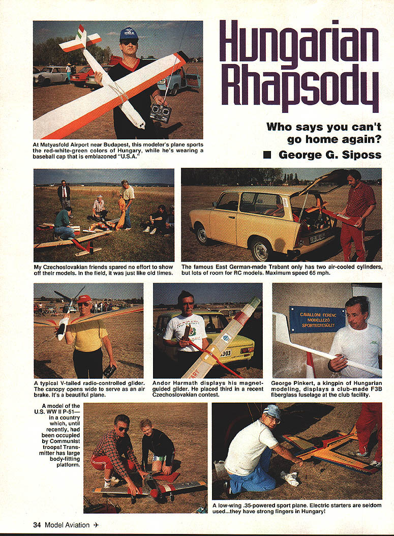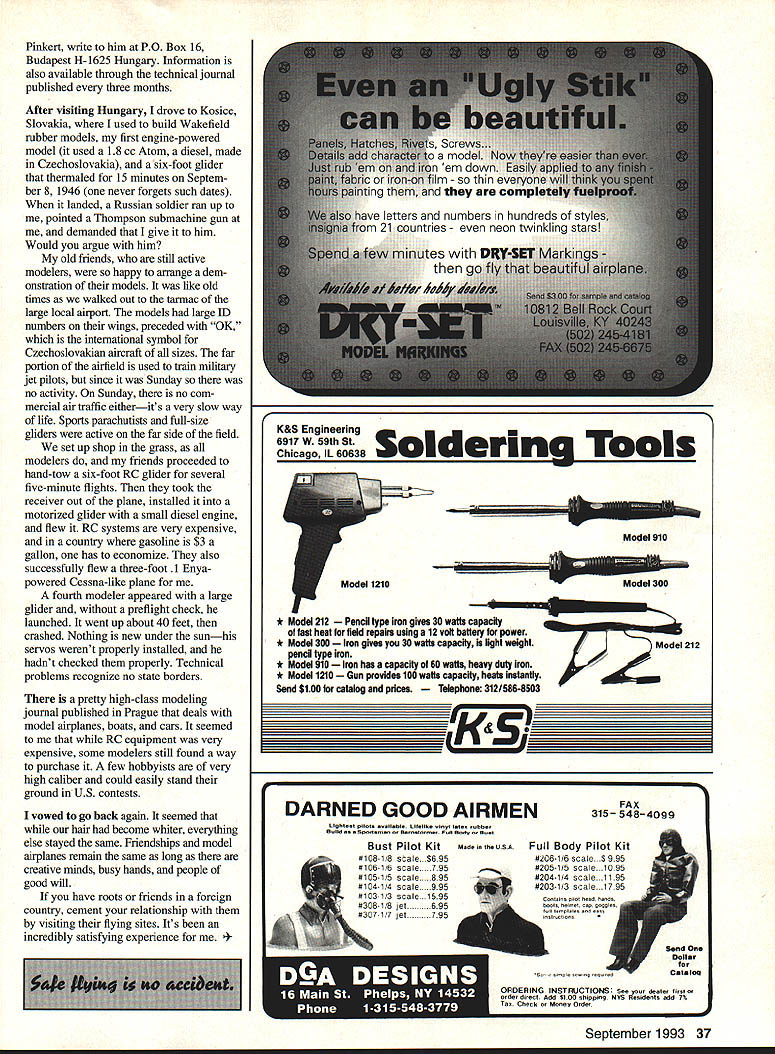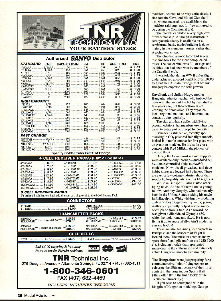 A model US WW II P-Si country until recently occupied Communist troops Trans mitter has large body-fitting platform HvncIarin RhiIPSOUU says cant go home again U George G Siposs 34 Model Aviation asfold Airport near Budapest modelers plane sports red-white-green colors Hungary hes wearing baseball cap emblazoned USA Uzecrloslovaklan friends spared no ettort show tamous East German-made Trabant has two air-cooled cylinders off models field just like old times lots room RC models Maximum speed 65 mph typical V-tailed radio-controlled gliderAndor Harmath displays magnet-George Pinkert kingpin Hungarian canopy opens wide serve airguided glider placed third recentmodeling displays club-made F3B brake Its beautiful planeCzechoslovakian contestfiberglass fuselage club facility low-wing 35-powered sport plane Electric starters seldom used.they have strong fingers Hungary THE FIRST TIME model airplane hands 52 years ago Hungary Shortly after began building models took part first contest microfilm-covered Indoor models took first place modeler affiliated club making microfilm family bathtub also building outdoor modelsgliders rubber-powered planes high school classmate introduced uncle George Benedekthe top modeler Hungary time George won contest entered innovative designs appeared issue illustrated magazine Young Flier heard about Benedeks famous exploits set record after record disciple Ferenc Cavalloni physics teacher students became prominent modelers Hungary Later Benedek developed line cambered wing sections slow-flying outdoor gliders During war shortage supplies spruce thin plywood drafting paper covered models dope After war lived Slovakia competed international con test Prague escaped through Iron Curtain lived Salzburg also competed Eventually moved southern Cali fornia before living competing Toronto Canada have living modeling California since 1963 1967 also pioneered radio-controlled model car racing During recent years have corresponded some old modeling friends Europe summer decided travel meet person meeting attended Budapest well organized friend Tibor Szentivanyi contacted George Pinkert very prominent modeler president still-very-active Cavalloni Model Club George kindly called several modelers together demonstration meeting old Matyasfold airport near Budapest Built 1930s first international airport Hungary 1930s used fighter base during WW II Frankly surprised fast became friends talking same languages Hungarian modeling again Tech nology certainly changed love sport has Quite few F3B models flown placed high recent F3B European Championships F3Bs construction almost same models southern California major exception Hungarian models no exposed aileron servos wings very small snapon fitting visible moving surface instead large protruding control horn electric winch did have retriever line braking action electrical unlike mechanical brake arm use internal resistance winch motor rigidly controlled Europe standardize towing speed limits speed somewhat saves wings Euro peans stand switch blip like nervous sewing-machine operator Several diesel engines evident well Hungarian-made engines MOKI conventional planes Hungarian modelers use radio transmitters larger generally Futaba Germanmade use two sticks twochannel gliders wire frame supports transmitter hung around fliers neck ribbon both hands can used control Instead just thumb hold sticks fliers used thumb forefinger Most models sported red-white-green national colors rudders ID numbers starting H saw magnet-guided slope soarer well several FlA free flight gliders Young teenagers being instructed older September1993 35 glider flew small diesel auxiliary engine Semsei youngster right Anthony Gergely brought Lajos son frequently build models together Olympic 650 back him visit Valley Forge PA Above Slovakia have standard glass fuselage fit variety wings modified Sagitta 900 Left Its 45 yearsand now modeling friends together again Julius Sogor Mikulas Bajkay author Authorized SA4YO Distributor STANDARD SIZECAPACITY mAh PIAHT WEIGHT oz N-SOAAA1/3AAA 394 591 12 N-1IOAA1/3AA 551 8 N-150NN 122 032 N-200AAAAAA 394 1720 035 N-270AA2/3AA 551 1161 050 N-600AAAA 945 092 N-6SOSC1/2SUBC650866 16 102 KR-1300SCSUBC 1300 654 170 KR-l500SCSUBC 1500 1654 166 KR-2000C2000992 1929 247 KD-4400D D 0 1272 2362 530 KR-7000F F 0 1272 3543 813 HIGHCAPACITY N225AE1/3A225 650642042S KR600AE2/3A600 6501094077S KR800AAE AA800 543 1949 085 KR1000AE4/SA1000 6501654109S KR1100AAE7/5AA1100 54325301065 KR1200AE A1200 6501909106 KR1400AE A1400 6501909109S KR1700AE4/3A1700 6502598148S KR1800SCESUBC1800 8661654165S KR2800CE C2800 992 1929 275 KRS00ODEL D 50001272 2299 528 FAST CHARGE N600SCR1/2SUBC6008661016102$ N800SCRA8006501909116$ N1000SCR2/3SUBC1000866 9 144 N1400SCRSUBC1400866 187$ N1700SCRC SUBC 866 1654 190 $ Specify Solder Tabs FREE Charge PRICE 165 150 150 175 150 150 300 200 300 400 700 1300 300 200 250 295 325 295 395 495 350 595 895 325 300 350 350 450 4N-SOAAA$ 8954N-800AR $11954KR-1300SC$1195 4N-11OAA$ 7954KR100OAE$12954KR-1500SC $1395 4N-150N$ 8954KR1100AAE$17954KR-1800SCE$1800 4N-200AAA$ 8954KR1200AE. $13954N-1400SCR$1600 4N-225AE$12954KR-1400AE$16954N-1700SCRC$1995 4N-270AA$ 7954KR-1700AE. $19954KR2000C$2000 4N-600AA$ 8954N-6SOSC$13954KR4400D 0 4KR-800AAE$11954N-600SCR$13954KRSOOODEL$4200 4KR-600AE$10954N-1000SCR$1595 5 CELL RECEIVER PACKS order 6 volt Battery Pack add cost single cell 4 Cell Battery Pack S FUTABAJ . $400I AIRTRONICS$400 FUTABAG JR/HITEC$400 1 stick of22000 8N600AA. 1 row 8SN600AA icks 31595 8N600AA$15959N600AA cksof3-.. $1800 8KR800AAE 4 sticks 2 square-$20009KR800AAE108 volt$2200 6volt12AH$120012 volt 00 U Add $400 shipping & handling 7% sales tax/or Florida residents TNR Technical Inc 279 Douglas Avenue monte Springs FL 32714 682-4311 1-800-346-0601 FAX 407 682-4469 DEALERS INQUIRIES WELCOME modelers seemed very enthusiastic also saw Cavalloni Model Club facili ties materials available modelers although free used during Communist er