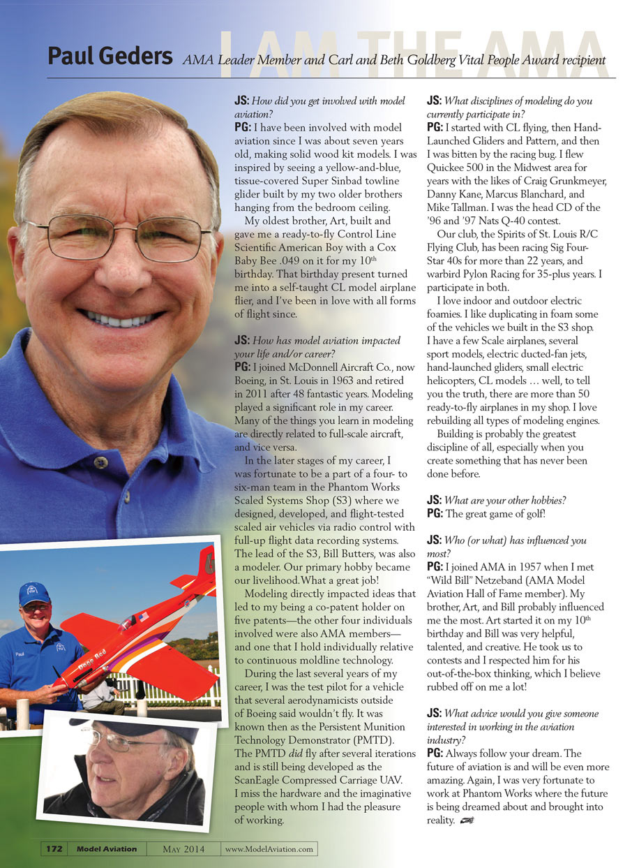 PG: I joined AMA in 1957 when I met “Wild Bill” Netzeband (AMA Model Aviation Hall of Fame member). My brother Art and Bill probably influenced me the most. Art started it on my 10th birthday and Bill was very helpful, talented, and creative. He took us to contests and I respected him for his out-of-the-box thinking, which I believe rubbed off on me a lot!