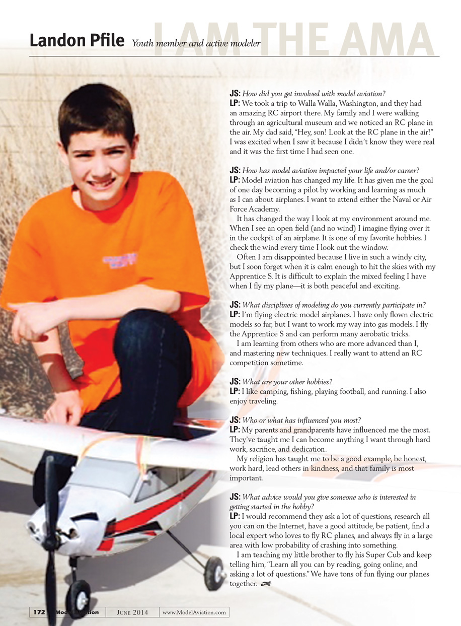 LP: Model aviation has changed my life. It has given me the goal of one day becoming a pilot by working and learning as much as I can about airplanes. I want to attend either the Naval or Air Force Academy.